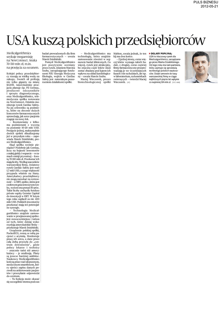 PULS BIZNESU 2012-05-21 USA kuszą polskich przedsiębiorców Medicalgorithmics szykuje megaemisję na NewConnect. Szuka 70-110 mln zł, m.in. na przejęcia za oceanem. Kolejni polscy przedsiębior cy ruszają za wielką wodę na zakupy. Swoich sił próbują nie tylko giganty na miarę KGHM. Amerykańskie prze jęcia planuje np. PZ Cormay, producent odczynników i sprzętu diagnostycznego, oraz Medicalgorithmics, telemedyczna spółka notowana na NewConnect. Ostatnia mo nitoruje rynek Cardiac Safety. Na jej celowniku są podmio ty, które na zlecenie dużych koncernów farmaceutycznych sprawdzają, jak serce pacjenta reaguje na nowy lek. - Rozmawiamy z kilko ma podmiotami z wyceną na poziomie 10-20 mln USD. Przejęcie jednej, maksymalnie dwóch spółek sfinalizujemy już w przyszłym roku - zapo wiada Marek Dziubiński, pre zes Medicalgorithmics. Skąd spółka weźmie pie niądze? Podobnie jak Cormay, liczy na hojność inwestorów z małej giełdy i wsparcie - w ra mach emisji prywatnej - kwo tą 70-110 mln zł. Przekonać ich mają liczby. Według szacunków warszawskiej firmy, światowy rynek Cardiac Safety jest wart 1,7 mld USD, z czego większość przypada właśnie na Stany. Amerykańscy przedsiębiorcy nie mogą narzekać na rentow ność - w ERT, spółce, która jest czołowym graczem na tym ryn ku, wynosi ona ponad 50 proc. Takie liczby zachęciły fundusz private equity Genstar Capital do inwestycji w ERT. W lutym tego roku zapłacił za nie 400 mln USD. Polskich inwestorów przekonać mają też potencjal ne synergie. - Technologia Medical gorithmics znajdzie zastoso wanie w przejmowanej spółce. Jest nowocześniejsza i tańsza od tych, które dzisiaj wyko rzystują amerykańskie firmy przekonuje Marek Dziubiński. Urządzenie polskiej spółki, PocketECG, noszą ze sobą pa cjenci z arytmią. Monitoruje pracę ich serca, a dane przez całą dobą przesyła do „cen trum dowodzenia", gdzie polscy lekarze i technicy - znacznie tańsi niż amery kańscy - je analizują. Plany są jeszcze bardziej ambitne. Naukowcy Medicalgorithmics kończą prace nad ulepszonym, medycznym smartfonem, któ ry oprócz zapisu danych po zwoli na ankietowanie pacjen tów i przesyłanie odpowiedzi do centrum. - Ta funkcja może okazać się szczególnie istotna podczas badań prowadzonych dla firm farmaceutycznych - uważa Marek Dziubiński. Pomysł Medicalgorithmics jest pozytywnie oceniany przez rynek. Zdaniem Marcina Szuby, zarządzającego fundu szem PZU Energia Medycyna Ekologia, wejście w Cardiac Safety jest naturalnym posze rzeniem działalności spółki. - Medicalgorithmics ma technologię, która znajdzie zastosowanie również w seg mencie badań klinicznych. Co więcej, rynek jest atrakcyjny, bo znaczna część leków musi zostać zbadana pod kątem ich wpływu na układ kardiologicz ny - uważa Marcin Szuba. Maciej Wieczorek, prezes biotechnologicznej spółki Mabion, uważa jednak, że ten kij ma dwa końce. - Z jednej strony, coraz wię cej leków wymaga takich ba dań, z drugiej, coraz częściej firmy farmaceutyczne przepro wadzają je we wcześniejszych fazach i nie na ludziach, ale np. w laboratorium, na komórkach zwierzęcych - twierdzi Maciej Wieczorek, [AT] • DOLARY POPŁYNĄ: USA to kluczowy rynek dla Medicalgorithmics, zarządzane go przez Marka Dziubińskiego. Od tego roku ma tam partnera, który zajmuje się sprzedażą technologii polskich naukow ców. Dzięki umowie do kasy warszawskiej firmy w ciągu najbliższych pięciu lat wpłynie co najmniej 84 mln zł. [FOT. WM]