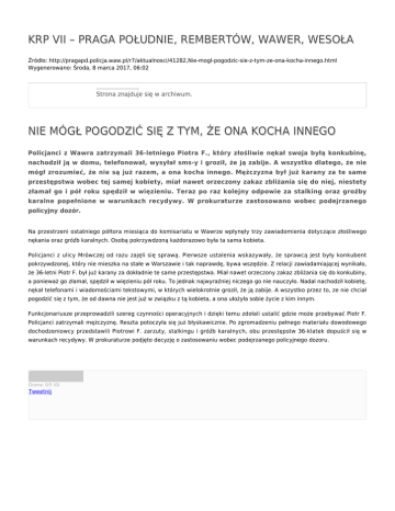 KRP VII – PRAGA POŁUDNIE, REMBERTÓW, WAWER, WESOŁA Źródło: http://pragapd.policja.waw.pl/r7/aktualnosci/41282,Nie-mogl-pogodzic-sie-z-tym-ze-ona-kocha-innego.html Wygenerowano: Środa, 8 marca 2017, 06:02 Strona znajduje się w archiwum. NIE MÓGŁ POGODZIĆ SIĘ Z TYM, ŻE ONA KOCHA INNEGO Policjanci z Wawra zatrzymali 36-letniego Piotra F., który złośliwie nękał swoja byłą konkubinę, nachodził ją w domu, telefonował, wysyłał sms-y i groził, że ją zabije. A wszystko dlatego, że nie mógł zrozumieć, że nie są już razem, a ona kocha innego. Mężczyzna był już karany za te same przestępstwa wobec tej samej kobiety, miał nawet orzeczony zakaz zbliżania się do niej, niestety złamał go i pół roku spędził w więzieniu. Teraz po raz kolejny odpowie za stalking oraz groźby karalne popełnione w warunkach recydywy. W prokuraturze zastosowano wobec podejrzanego policyjny dozór. Na przestrzeni ostatniego półtora miesiąca do komisariatu w Wawrze wpłynęły trzy zawiadomienia dotyczące złośliwego nękania oraz gróźb karalnych. Osobą pokrzywdzoną każdorazowo była ta sama kobieta. Policjanci z ulicy Mrówczej od razu zajęli się sprawą. Pierwsze ustalenia wskazywały, że sprawcą jest były konkubent pokrzywdzonej, który nie mieszka na stałe w Warszawie i tak naprawdę, bywa wszędzie. Z relacji zawiadamiającej wynikało, że 36-letni Piotr F. był już karany za dokładnie te same przestępstwa. Miał nawet orzeczony zakaz zbliżania się do konkubiny, a ponieważ go złamał, spędził w więzieniu pół roku. To jednak najwyraźniej niczego go nie nauczyło. Nadal nachodził kobietę, nękał telefonami i wiadomościami tekstowymi, w których wielokrotnie groził, że ją zabije. A wszystko przez to, ze nie chciał pogodzić się z tym, że od dawna nie jest już w związku z tą kobieta, a ona ułożyła sobie życie z kim innym. Funkcjonariusze przeprowadzili szereg czynności operacyjnych i dzięki temu zdołali ustalić gdzie może przebywać Piotr F. Policjanci zatrzymali mężczyznę. Reszta potoczyła się już błyskawicznie. Po zgromadzeniu pełnego materiału dowodowego dochodzeniowcy przedstawili Piotrowi F. zarzuty, stalkingu i gróźb karalnych, obu przestępstw 36-klatek dopuścił się w warunkach recydywy. W prokuraturze podjęto decyzję o zastosowaniu wobec podejrzanego policyjnego dozoru. Ocena: 0/5 (0) Tweetnij