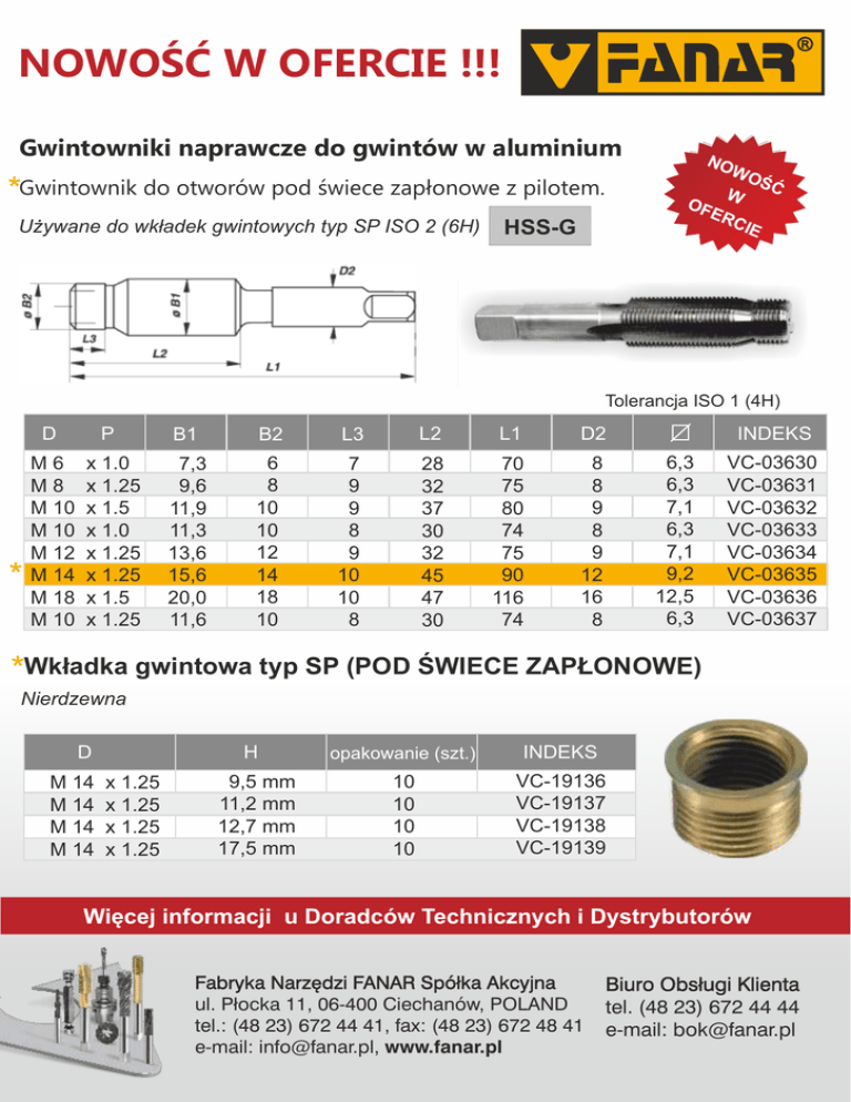 NOWOŚĆ W OFERCIE !!! Gwintowniki naprawcze do gwintów w aluminium WO ŚĆ W OF ER CIE *Gwintownik do otworów pod świece zapłonowe z pilotem. Używane do wkładek gwintowych typ SP ISO 2 (6H) NO HSS-G Tolerancja ISO 1 (4H) * D P B1 B2 L3 L2 L1 D2 M6 M8 M 10 M 10 M 12 M 14 M 18 M 10 x 1.0 x 1.25 x 1.5 x 1.0 x 1.25 x 1.25 x 1.5 x 1.25 7,3 9,6 11,9 11,3 13,6 15,6 20,0 11,6 6 8 10 10 12 14 18 10 7 9 9 8 9 10 10 8 28 32 37 30 32 45 47 30 70 75 80 74 75 90 116 74 8 8 9 8 9 12 16 8 INDEKS 6,3 6,3 7,1 6,3 7,1 9,2 12,5 6,3 VC-03630 VC-03631 VC-03632 VC-03633 VC-03634 VC-03635 VC-03636 VC-03637 *Wkładka gwintowa typ SP (POD ŚWIECE ZAPŁONOWE) Nierdzewna D M 14 M 14 M 14 M 14 H x 1.25 x 1.25 x 1.25 x 1.25 9,5 mm 11,2 mm 12,7 mm 17,5 mm opakowanie (szt.) INDEKS 10 10 10 10 VC-19136 VC-19137 VC-19138 VC-19139 Więcej informacji u Doradców Technicznych i Dystrybutorów Fabryka Narzędzi FANAR Spółka Akcyjna ul. Płocka 11, 06-400 Ciechanów, POLAND tel.: (48 23) 672 44 41, fax: (48 23) 672 48 41 e-mail: [email protected], www.fanar.pl Biuro Obsługi Klienta tel. (48 23) 672 44 44 e-mail: [email protected] INFORMACJE TECHNICZNE KONTROLA Należy sprawdzić czy skok gwintu śruby i gwintownika pasują wzajemnie. GWINTOWANIE Należy zastosować specjalny gwintownik V-COIL do wykonania gwintu trzymającego tulejkę w rozwierconym otworze po starym gwincie. Zaleca się stosowanie specjalnych olejów do gwintowania np. TEREBOR. INSTALOWANIE WKŁADKI Umieścić tulejkę na narzędziu do instalowania, wyregulować pierścień nastawczy tak aby zabierak służący do wkręcania wkładki znajdował się centralnie w szczelinie narzędzia. Wprowadzać wkładkę z delikatnym naciskiem aż zacznie się wkręcać w uprzednio wykonany gwint, kontynuować wkręcanie bez nacisku. Nie należy próbować wykręcać wkładki, gdyż grozi to wyłamaniem zabieraka wkładki. USUWANIE ZABIERAKA WKŁADKI Po zakończeniu wkręcania wkładki należy wyciągnąć narzędzie do wkręcania i użyć trzpienia do wyłamania zabieraka wkładki. Dla wkładek o dużych średnicach można stosować szczypce wydłużone do usunięcia zabieraka. Z powodu bardzo dokładnego wykonania wkładek, otrzymujemy dokładny gwint o większej wytrzymałości niż oryginalny. Zastosowanie wkładek Wzmacnianie gwintów w materiałach miękkich typu stopy aluminium i magnezu. Zastosowanie w budowie maszyn, motoryzacji, energetyce i lotnictwie. Naprawa uszkodzonych i zużytych gwintów. Odzyskiwanie drogich, wybrakowanych w produkcji detali. Fabryka Narzędzi FANAR Spółka Akcyjna ul. Płocka 11, 06-400 Ciechanów, POLAND tel.: (48 23) 672 44 41, fax: (48 23) 672 48 41 e-mail: [email protected], www.fanar.pl Biuro Obsługi Klienta tel. (48 23) 672 44 44 e-mail: [email protected]