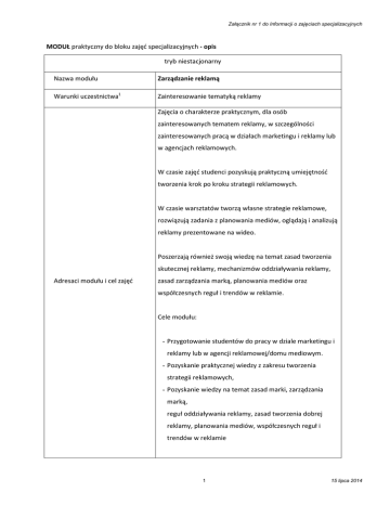 Załącznik nr 1 do Informacji o zajęciach specjalizacyjnych MODUŁ praktyczny do bloku zajęć specjalizacyjnych - opis tryb niestacjonarny Nazwa modułu Zarządzanie reklamą Warunki uczestnictwa1 Zainteresowanie tematyką reklamy Zajęcia o charakterze praktycznym, dla osób zainteresowanych tematem reklamy, w szczególności zainteresowanych pracą w działach marketingu i reklamy lub w agencjach reklamowych. W czasie zajęć studenci pozyskują praktyczną umiejętność tworzenia krok po kroku strategii reklamowych. W czasie warsztatów tworzą własne strategie reklamowe, rozwiązują zadania z planowania mediów, oglądają i analizują reklamy prezentowane na wideo. Poszerzają również swoją wiedzę na temat zasad tworzenia skutecznej reklamy, mechanizmów oddziaływania reklamy, Adresaci modułu i cel zajęć zasad zarządzania marką, planowania mediów oraz współczesnych reguł i trendów w reklamie. Cele modułu: - Przygotowanie studentów do pracy w dziale marketingu i reklamy lub w agencji reklamowej/domu mediowym. - Pozyskanie praktycznej wiedzy z zakresu tworzenia strategii reklamowych, - Pozyskanie wiedzy na temat zasad marki, zarządzania marką, reguł oddziaływania reklamy, zasad tworzenia dobrej reklamy, planowania mediów, współczesnych reguł i trendów w reklamie 1 15 lipca 2014 Załącznik nr 1 do Informacji o zajęciach specjalizacyjnych Kierownik Rafał Korsak Mgr Rafał Korsak Z zawodu jest trenerem, doradcą, menadżerem. Posiada ponad 20 letnie praktyczne doświadczenie biznesowe w zakresie reklamy oraz ponad 10 letnie doświadczenie w zakresie consultingu, doradztwa i szkoleń. Karierę zawodową rozpoczął 23 lata temu współtworząc Radio Zet. Przez ponad 5 lat pracował w Biurze Reklamy Radia Zet. Po odejściu z radia piastował stanowisko szefa marketingu na Europę Centralną Telewizji FilmNet, a potem szefa reklamy Era GSM. Następnie został dyrektorem Działu Mediów agencji reklamowej TJ Partner. Z przekształcenia tego działu powstał dom mediowy Impact Media, którego przez 3 lata był Dyrektorem Zarządzającym i Prezesem. Biogram kierownika modułu Obecnie jest niezależnym trenerem-konsultantem, specjalizującym się w szkoleniach i doradztwie z zakresu reklamy i promocji, rynku mediów, planowania kampanii reklamowych w mediach, zarządzania marką. Jest autorem pierwszego w Polsce praktycznego podręcznika planowania mediów pt "Planowanie mediów w kampaniach reklamowych", wydanego w styczniu 2001 nakładem PWE. Jest również współautorem książki "Marketing Profesjonalny", wydanej nakładem Market Film w roku 1999 oraz „Wiedzy o reklamie” PWN, 2009. Ponadto jest autorem wielu publikacji w prasie fachowej. Ponadto od ponad 10 lat jest wykładowcą na Studiach Podyplomowych Wydziału Psychologii UW oraz na uczelni Collegium Civitas i w Szkole Wyższej Psychologii Społecznej a 2 15 lipca 2014 Załącznik nr 1 do Informacji o zajęciach specjalizacyjnych także w Wyższej Szkole Promocji i w Szkole Głównej Handlowej. Jest absolwentem szkoły trenerów Grupy Trop – jednej z najlepszych szkół trenerów biznesu w Polsce. PRAKTYKI 62 godz. tryb niestacjonarny Osoba odpowiedzialna Rafał Korsak Zarządzanie strategią reklamową 1. Historia reklamy 2. Elementy promtion mix 3. Podstawowe zasady marki 4. Budowa marki 5. Pozycjonowanie marki 6. Analizy strategiczne 7. Analizy użytkowników, definicja grupy docelowej 8. Cele kampanii 9. Brand Identity, Brand foundations 10. Typy strategii reklamowych 11. Tworzenie copy strategy Treść praktyk 62 godz. 12. Consumer insights 13. Zasady tworzenia dobrej reklamy 14. Badania skuteczności reklamy 15. Rynek dostawców usług reklamowych 16. Zasady briefowania i współpracy z agencją reklamową 17. Prawo w reklamie 18. Psychologiczne aspekty oddziaływania reklamy Planowanie mediów 1. Parametry mediowe używane w procesie planowania mediów 2. Rynek mediów, charakterystyka mediów 3 15 lipca 2014 Załącznik nr 1 do Informacji o zajęciach specjalizacyjnych 3. Planowanie strategiczne 4. Zasady optymalizacji budżetów w poszczególnych mediach 5. Analizy skuteczności mediowej kampanii Sesje reklamożerców 1. Pokazy najciekawszych reklam telewizyjnych, prasowych i innych z całego świata 2. Pokazy reklam wybranych jako najciekawsze przez studentów 3. Dyskusje po projekcjach 4. Pokazy "antyreklam" W czasie praktyk studenci tworzą strategię reklamową według schematu stosowanego powszechnie w agencjach reklamowych. 1. Podstawy pracy na oprogramowaniu TGI 2. Tworzenie pracy zaliczeniowej - strategii dla nowo wprowadzanego produktu wybranego przez studentów a. Analizy rynku b. Analizy grup docelowych c. Analizy konkurencji d. Cele marketingowe i komunikacyjne e. Główne założenia strategiczne f. Pozycjonowanie marki g. Różnicowanie, przewagi konkurencyjne, USP produktu h. Consumer insights i. Copy strategy kampanii j. Podział budżetu i flow chart działań komunikacyjnych k. Analiza SWOT Warunki zaliczenia i kryteria Ocena końcowa będąca średnią z egzaminu pisemnego oraz oceny praktyk oceny z pracy zaliczeniowej 4 15 lipca 2014 Załącznik nr 1 do Informacji o zajęciach specjalizacyjnych Instytucje i osoby przyjmujące Praktyki prowadzone są na uczelni W SWPS w sali wykładowej oraz komputerowej, zajęcia mają Organizacja praktyk formę praktycznych warsztatów komputerowych. Prowadzący praktyki Mgr Rafał Korsak – 62 godziny Trener, doradca, menadżer. Posiada ponad 20 letnie praktyczne doświadczenie biznesowe w zakresie reklamy oraz ponad 10 letnie doświadczenie w zakresie consultingu, doradztwa i szkoleń. Pracował w Biurze reklamy Radia Zet, Biogram prowadzącego praktyki kierował reklamą w sieci Era GSM, marketingiem w telewizji FilmNet, działem mediów w agencji TJ Partner, kierował domem mediowym Impact Media. Wykładowca reklamy na wielu uczelniach (m.in. UW, SGH, Collegium Civitas, SWPS). Autor publikacji książkowych i artykułów na tem
