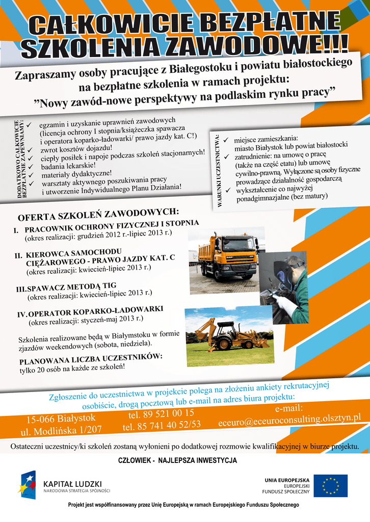 E N T A Ł P Z E B E I C I W O K CAŁ ! !! E W O D O W A Z A I N E L SZKO powiatu białostockiego odowych w za ń ie n w ra p u ie an sk zy u i egzamin acza aw sp a zk ec ąż si /k ia n p o st I y n (licencja ochro y kat. C!) zd ja o w ra p i/ k ar w o ad -ł o k ar p i operatora ko zwrot kosztów dojazdu! arnych! n jo ac st ń le o k sz as cz d o p je o ciepły posiłek i nap badania lekarskie! materiały dydaktyczne! ia pracy an iw k u sz o p o eg n w ty ak ty ta sz war ania! ał zi D u n la P o eg n al u id w y d In i utworzenie : H C Y W O D O W A Z Ń OFERTA SZKOLE miejsce zamieszkania: ostocki miasto Białystok lub powiat biał acę pr o ę ow um na : ie en ni ud tr za ę (także na część etatu) lub umow y fizyczne ob os są ne zo ąc ył W . ną aw pr oiln cyw arczą od sp go ć oś ln ła ia dz ce zą ad ow pr wykształcenie co najwyżej ponadgimnazjalne (bez matury) A: WARUNKI UCZESTNICTW WICIE DODATKOWO CAŁKO MY: BEZPŁATNIE ZAPEWNIA i u k o t s o g łe ia B z e c ą j u c Zapraszamy osoby pra : u t k e j o r p h c a m a r w ia n le o k z s e n t ła p z e b na ” y c a r p u k n y r im k s la d o p a n y w y t k e p s r e p e w o n ”Nowy zawód- NIA P O T S I J E N Z C Y IZ F Y N I. PRACOWNIK OCHRO 13 r.) 0 2 c ie ip -l r. 2 1 0 2 eń zi d ru g : (okres realizacji HODU II. KIEROWCA SAMOC Y KAT. C D Z A J O W A R P O G E W CIĘŻARO 3 r.) 1 0 2 c ie ip -l eń ci ie w k : ji ac iz (okres real TIG Ą D O T E M Z C A W A P S I. II 2013 r.) c ie ip -l eń ci ie w k : ji ac iz al re (okres RKI A W O D A -Ł O K R A P O K R IV. OPERATO 2013 r.) aj -m eń cz y st : ji ac iz al re s re k (o rmie fo w u k o st m ły ia B w ą ęd b e Szkolenia realizowan ziela). d ie n , ta o b o (s ch y w o d en k ee zjazdów w NIKÓW: T S E Z C U A B Z IC L A N A PLANOW koleń! sz ze e d aż k a n b só o 0 2 o lk ty ej jn y c ta ru k re ty ie k n a iu n e ż a zło n a g le o p ie c k je ro p w a tw ktu: je ro Zgłoszenie do uczestnic p ra iu b s re d a a n il a -m be lu ą w to z c o p ą g ro d , ie c iś b o os 15-066 Białystok ul. Modlińska 1/207 tel. 89 521 00 15 tel. 85 741 40 52/53 e-mail: l .p n ty z ls .o g in lt u s n o c eceuro@eceuro Ostateczni uczestnicy/ki szkoleń zostaną wyłonieni po dodatkowej rozmowie kwalifikacyjnej w biurze projektu.