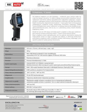 Białołęcka 158E • 03-253 Warszawa • tel.: +48+48 22 510 14 40 • fax: +48+48 22 741 69 33 • hotline 24h:24h: +48+48 22 510 14 79 • e-mail: [email protected] • www.rscautoid.pl Białołęcka 158E • 03-253 Warszawa • tel.: 22 510 14 40 • fax: 22 741 69 33 • hotline 22 510 14 79 • e-mail: [email protected] • www.rscautoid.pl TERMINAL TC8000 INTERMEC INTERMECPC23D PC23D Od zaplecza magazynu po salę sprzedaży – wydajność pracy jeszcze nigdy nie miała tak Intermec dużego znaczenia. Tomałym właśnie dlatego powierzyliśmy zespołowi naszych Drukarka PC23d jestjest gabarytowo urządzeniem, które nadaje sięsię dodo Drukarka Intermec PC23d małym gabarytowo urządzeniem, które nadaje najlepszych inżynierów zadanie zaprojektowania najbardziej wydajnego i wyposawielu zastosowań, gdzie najczęściej potrzebna jest mniejsza ilość etykiet czy też opawielu zastosowań, gdzie najczęściej potrzebna jest mniejsza ilość etykiet czy też opażonego w najbogatszy zestaw funkcji komputera mobilnego, jaki tylko był możliwy. sek. Drukarka PC23d jestjest prosta ww obsłudze. Posiada wbudowany wyświetlacz LCD. sek. Drukarka PC23d prosta obsłudze. Posiada wbudowany wyświetlacz LCD. Dzięki rewolucyjnej, ergonomicznej budowie i imponującej liście innowacyjnych, zwiększających wydajność funkcji dotykowego komputera mobilnego TC8000 Twoje przedsiębiorstwo zyska codziennie na każdego pracownika dodatkową godzinę produktywnej pracy. Jest to coś, co z pewnością ucieszy Twoich klientów. Dziękujemy, nauko. INTERMEC PC23D Metoda Druku Metoda Druku Max. szer. druku Max. szer. druku Max długość druku Max długość druku Standardowe Standardowe wyposażenie wyposażenie Prędkość druku Prędkość druku Wymiary Rozdzielczość Rozdzielczość Rozdzielczość Waga Max. szer. etykiety Max. szer. etykiety Komunikacja Komunikacja Wyświetlacz Klawiatura Firmware Firmware Termiczna Termiczna 5656 mm mm 1727 mm 1727 mm Model ten jest do 33% lżejszy od tradycyjnych urządzeń, co dla jego użytkowników oznacza mniejsze zmęczenie mięśni. Czasem mniej oznacza więcej. SPECYFIKACJA TECHNICZNA SPECYFIKACJA TECHNICZNA Ekran urządzenia został zaprojektowany tak, by podczas skanowania użytkownik mógł patrzeć prosto na niego, a ponadto jest większy, co eliminuje konieczność przechylania urządzenia celem weryfikacji wyników skanowania, zwiększając w ten 5454 mm mm sposób wydajność każdej operacji skanowania. 900 mm 900 mm Zegar Czasu Rzeczywistego (RTC) Zegar Czasu Rzeczywistego (RTC) TECHNICZNA SPECYFIKACJA 8 dots/mm 8 dots/mm 1212 dots/mm dots/mm 233 mm × 76 mm × 64 mm (wys. × szer. × gł.) 203 dpi 203 dpi 300dpi 300dpi 500 g 6060 mm mm 800 xUSB 480 pikseli; przekątna 4 cale; transfleksyjny Standardowo: 2.0, USB Host Opcjonalnie: Serial, parallel, WiFi, Bluetooth Standardowo: USB 2.0, USB Host Opcjonalnie: Serial, parallel, WiFi, Bluetooth wyświetlacz LCD; 16,7 mln kolorów (głębia 24-bitowa); 400 nitów PL,PL, Fingerprint, ZSim (ZPLII Simulation), ESim (EPL2 Simulation), DSim (DPL Fingerprint, ZSim (ZPLII Simulation), ESim (EPL2 Simulation), DSim (DPL Klawiatura ekranowa Simulation), XML enabled forfor SAP® AIIAII and Oracle® WMS Simulation), XML enabled SAP® and Oracle® WMS Wewn. średnica Wewn. średnica Procesor Procesor dwurdzeniowy 1,7 GHz 12,7mm(1/2”); 26mm (1”) 12,7mm(1/2”); 26mm (1”) Android AOSP 4.4.3 (KitKat) z rozszerzeniami System operacyjny Max. długość taśmy Max. długość taśmy 91,1m lub 274,32m 91,1m lub 274,32m Mobility Extensions (Mx) tworzącymi system operacyjny prawdziwej klasy korporacyjnej 2,36” – 4,33” Szerokość taśmy 2,36” – 4,33” Szerokość taśmy RAM 1 GB; model Standard: Flash pSLC 4 GB Model Premium: Flash pSLC 8 GB Pamięć 128MB Flash memory, 128MB SDRAM (opcjonalnie dodo 32GB) 128MB Flash memory, 128MB SDRAM (opcjonalnie 32GB) Pamięć wbudowana Pamięć wbudowana 8 MP, autofocus, przysłona f/2,4 (opcjonalnie) Aparat fofograficzny/kamera Fonty wbudowane Fonty wbudowane 1212 Monotype True Type fonts i 4i bitmap fonts (tylko IPL) Monotype True Type fonts 4 bitmap fonts (tylko IPL) -20°Cgłówne do 50°C / -40°C do 70°C Temp. robocza /przechowyw. 1D1D - wszystkie kody jednowymiarowe - wszystkie główne kody jednowymiarowe 2D Aztec, Code 16K, Code 49, Data Matrix, Dot Code, EAN-8, EAN-13, EAN.UCC 128, Grid Matrix, Drukowane kody Drukowane kody 2D - Aztec, 16K, Code 49, Data Matrix, Dot Code, EAN-8, EAN-13, EAN.UCC 128, Grid Matrix, 5%Code do 95% bez kondensacji Wilgotność HIBC 39, HIBC 128, MaxiCode, MSI, PDF417, Micro PDF417, Planet, Plessey, Postnet, QR-Code, RSS-14 HIBC 39, HIBC 128, MaxiCode, MSI, PDF417, Micro PDF417, Planet, Plessey, Postnet, QR-Code, RSS-14 Trójosiowy akcelerometr; trójosiowy żyroskop Czujnik ruchu 5 –5 40˚C Temperatura – 40˚C Temperatura rolki taśmy rolki taśmy Wielokrotne upadki na beton z wysokości 2,4 m w temperaturze pokojowej ; 10-80 %% bez kondensacji 10-80 bez kondensacji wielokrotne upadki na beton z wysokości 1,8 m w całym zakresie temperatur roboczych 1.45 kgkg Waga 1.45 Waga do 70°C Temp. przechowywania Parametry fizyczne Parametry fizyczne 177 x 125 x-40°C 215 mm (wysokość x szerokość x długość) 177 x 125 x 215 mm (wysokość x szerokość x długość) IEEE 802.11a/b/g/n/d/h/i Moduł radiowy Dyspenser Opcje dodatkowe Opcje dodatkowe Dyspenser Bluetooth; złącze USB 2.0 OTG typu host; 802.11r i 802.11k Połączenia sieciowe Zastosowanie Zastosowanie Opieka zdrowotna, transport, handel i biuro. Opieka zdrowotna, transport, handel i biuro. do roamingu głosowego klasy korporacyjnej w zestawie Wilgotność OdpornośćWilgotność na upadki Zapewniamy oprogramowanie i materiały Zapewniamy oprogramowanie i materiały eksploatacyjne renomowanych firm eksploatacyjne renomowanych firm EXCELLENCE EXCELLENCEIN: IN: digital & flexo label printing andand converting digital & flexo label printing converting automated la