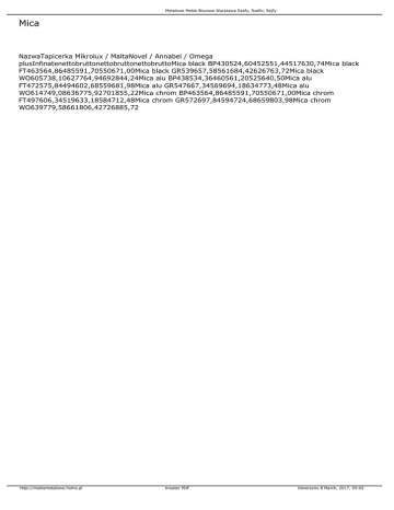 Metalowe Meble Biurowe Warszawa Szafy, Szafki, Sejfy Mica NazwaTapicerka Mikrolux / MaltaNovel / Annabel / Omega plusInfinatenettobruttonettobruttonettobruttoMica black BP430524,60452551,44517630,74Mica black FT463564,86485591,70550671,00Mica black GR539657,58561684,42626763,72Mica black WO605738,10627764,94692844,24Mica alu BP438534,36460561,20525640,50Mica alu FT472575,84494602,68559681,98Mica alu GR547667,34569694,18634773,48Mica alu WO614749,08636775,92701855,22Mica chrom BP463564,86485591,70550671,00Mica chrom FT497606,34519633,18584712,48Mica chrom GR572697,84594724,68659803,98Mica chrom WO639779,58661806,42726885,72 http://meblemetalowe.home.pl Kreator PDF Utworzono 8 March, 2017, 05:02