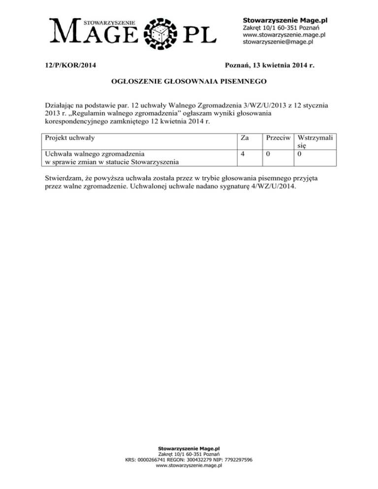 Stowarzyszenie Mage.pl Zakręt 10/1 60-351 Poznań www.stowarzyszenie.mage.pl [email protected] 12/P/KOR/2014 Poznań, 13 kwietnia 2014 r. OGŁOSZENIE GŁOSOWNAIA PISEMNEGO Działając na podstawie par. 12 uchwały Walnego Zgromadzenia 3/WZ/U/2013 z 12 stycznia 2013 r. „Regulamin walnego zgromadzenia” ogłaszam wyniki głosowania korespondencyjnego zamkniętego 12 kwietnia 2014 r. Projekt uchwały Za Uchwała walnego zgromadzenia w sprawie zmian w statucie Stowarzyszenia 4 Przeciw Wstrzymali się 0 0 Stwierdzam, że powyższa uchwała została przez w trybie głosowania pisemnego przyjęta przez walne zgromadzenie. Uchwalonej uchwale nadano sygnaturę 4/WZ/U/2014. Stowarzyszenie Mage.pl Zakręt 10/1 60-351 Poznań KRS: 0000266741 REGON: 300432279 NIP: 7792297596 www.stowarzyszenie.mage.pl