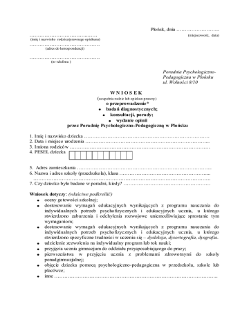 Płońsk, dnia …………………….. ……………………………..…… (miejscowość, data) (imię i nazwisko rodzica/prawnego opiekuna) …………………………………… (adres do korespondencji) …………………………………… (nr telefonu ) Poradnia PsychologicznoPedagogiczna w Płońsku ul. Wolności 8/10 WN IOS EK (uzupełnia rodzic lub opiekun prawny) o przeprowadzenie* badań diagnostycznych; konsultacji, porady; wydanie opinii przez Poradnię Psychologiczno-Pedagogiczną w Płońsku 1. Imię i nazwisko dziecka ………………………………………………………………… 2. Data i miejsce urodzenia ………………………………………………………………... 3. Imiona rodziców ………………………………………………………………………… 4. PESEL dziecka 5. Adres zamieszkania ……………………………………………………………………... 6. Nazwa i adres szkoły (przedszkola), klasa …………………………………………….... ……………………………………………………………………………………………. 7. Czy dziecko było badane w poradni, kiedy? ……………………………………………. Wniosek dotyczy: (właściwe podkreślić) oceny gotowości szkolnej; dostosowanie wymagań edukacyjnych wynikających z programu nauczania do indywidualnych potrzeb psychofizycznych i edukacyjnych ucznia, u którego stwierdzono zaburzenia i odchylenia rozwojowe uniemożliwiające sprostanie tym wymaganiom; dostosowanie wymagań edukacyjnych wynikających z programu nauczania do indywidualnych potrzeb psychofizycznych i edukacyjnych ucznia, u którego stwierdzono specyficzne trudności w uczeniu się – dysleksja, dysortografia, dysgrafia. udzielenie zezwolenia na indywidualny program lub tok nauki; przyjęcia ucznia gimnazjum do oddziału przysposabiającego do pracy; pierwszeństwa w przyjęciu ucznia z problemami zdrowotnymi do szkoły ponadgimnazjalnej; objęcie dziecka pomocą psychologiczno-pedagogiczna w przedszkolu, szkole lub placówce; inne …………………………………………………………………………………….. Uzasadnienie wniosku ………………………………………………………………………………………………… ………………………………………………………………………………………………… ………………………………………………………………………………………………… ………………………………………………………………………………………………… ………………………………… (podpis wnioskodawcy) Jednocześnie zwracam się z prośbą o poinformowanie i przekazanie opinii i/lub wyników badań do placówki oświatowej, do której uczęszcza dziecko ……………………………………………………………………………………….………….. nazwa placówki oświatowej ………………………………. (podpis wnioskodawcy) Pokwitowanie odbioru opinii: ………………………..…………………………………….. (data i podpis) Wyrażam zgodę na przetwarzan ie danych osobowych mojego dziecka przez Poradnię PsychologicznoPedagogiczną w Płońsku w celu właściwej organizacji pracy Zespołu Orzekającego, a w tym wystawienia i przesłania adekwatnego orzeczenia/opinii. Jednocześnie przyjmuję do wiado mości, że przysługuje mi prawo wglądu do tych danych, możliwość ich poprawiania oraz, że podanie danych jest dobrowolne. Poradnia Psychologiczno - Pedagogiczna w Płońsku zobowiązuje się n ie przekazy wać w/ w danych podmiotom trzecim, za wy jątkiem osób i instytucji uprawn ionych do tego na mocy przepisów prawa. Data: …………………… *właściwe podkreślić. 1. 2. 3. 4. ……………………………………………… (podpis rodziców/opiekunów) POUCZENIE: Do wniosku należy dołączyć posiadaną dokumentację uzasadniającą wniosek, w szczególności wyniki obserwacji i badań psychologicznych, pedagogicznych, logopedycznych i lekarskich. Jeśli do wydania orzeczenia niezbędne jest przeprowadzenie badań lekarskich, wnioskodawca powinien przedstawić zaświadczenie o stanie zdrowia dziecka. Do wniosku należy dołączyć opinie nauczycieli uczących ucznia w celu przedstawienia problemów dydaktycznych i wychowawczych ucznia zgodnie z wzorami określonymi w Poradni. W przypadku nie zgłoszenia się w wyznaczonym terminie na badanie wniosek pozostaje bez rozpatrzenia. Zlecenie rozpatrzenia wniosku: Data badania:………….…………… Godzina:…………………………….. Psycholog:………………………….. Pedagog:……………………………. ………..………… podpis dyrektora Poradni