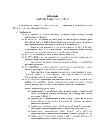 Informacja z działalności Zarządu Powiatu w Łukowie W okresie od 14 lutego 2012 r. do 20 marca 2012 r. Zarząd odbył 4 posiedzenia, w trakcie których zajmował się następującymi sprawami: 1. Podjął uchwały: 1) Nr 67/139/2012 w sprawie uchwalenia Regulaminu Organizacyjnego Placówki Wielofunkcyjnej w Łukowie, 2) Nr 67/140/2012 w sprawie wyrażenia zgody na bezprzetargowe wynajęcie przez Samodzielny Publiczny Zakład Opieki Zdrowotnej w Łukowie placu stanowiącego część działki nr 8808/17, położnej w Łukowie przy ul. Partyzantów 10. Zgoda dotyczy wynajęcia w trybie bezprzetargowym, na okres 3 lat, placu o powierzchni 11,09 m2 z przeznaczeniem na posadowienie kiosku nietrwale związanego z gruntem i prowadzenie w nim działalności handlowej, 3) Nr 67/141/2012 w sprawie zmian budżetu powiatu na rok 2012, 4) Nr 67/142/2012 w sprawie upoważnienia kierowników jednostek powiatowych do dokonywania przeniesień planowanych wydatków w 2012 r. Upoważnienie dotyczy przeniesień planowanych wydatków w ramach działów klasyfikacji budżetowej, 5) Nr 67/143/2012 w sprawie udzielenie pełnomocnictwa Dyrektorowi I Liceum Ogólnokształcącego im. Tadeusza Kościuszki w Łukowie. Pełnomocnictwo dotyczy podpisania wniosku oraz zawarcia i realizacji umowy dotyczącej projektu „EL CINE EUROPEO, VENTANA DE NUESTRA CULTURA” finansowanego w ramach programu Comenius, 6) Nr 67/144/2012 w sprawie ogłoszenia otwartego konkursu ofert na realizację zadań publicznych w roku 2012 w zakresie wspierania i upowszechniania kultury fizycznej i sportu, kultury, sztuki, ochrony dóbr kultury oraz dziedzictwa narodowego. Konkurs dotyczy następujących zadań: a) popularyzacji i upowszechniania kultury fizycznej, sportu, rekreacji i turystki wśród mieszkańców powiatu łukowskiego. Na realizację tego zadania przeznacza się 14 000 zł, b) popularyzacja i upowszechnianie kultury fizycznej i sportu we wszystkich typach szkół na terenie powiatu łukowskiego. Na realizację tego zadania przeznacza się 14 000 zł, c) popularyzacja i podtrzymywanie tradycji wybranych dyscyplin sportowych – piłka ręczna. Na realizację tego zadania przeznacza się kwotę 7 000 zł, d) popularyzacja i upowszechnianie kultury fizycznej i sportu wśród osób niepełnosprawnych. Na realizację tego zadania przeznacza się kwotę 2 500 zł, e) kultywowanie i popularyzacja tańców, muzyki i zwyczajów ludowych. Na realizację tego zadania przeznacza się kwotę 9 500 zł, -2f) oprawa muzyczna z okazji świat narodowych i innych okolicznościowych uroczystości powiatowych. Na realizację tego zadania przeznacza się kwotę 4 000 zł. 7) Nr 70/145/2012 w sprawie ustalenia na 2012 rok Planu dofinansowania form doskonalenia zawodowego nauczycieli i kadry kierowniczej szkół i placówek oświatowych, dla których organem prowadzącym jest Powiat Łukowski. Środki na dofinansowanie form doskonalenia zawodowego nauczycieli i kadry kierowniczej szkół i placówek oświatowych stanowią 1% planowanych rocznych środków na wynagrodzenia osobowe nauczycieli. Z puli tej 10% zostało przeznaczone na podnoszenie kwalifikacji i doskonalenie zawodowe kadry kierowniczej szkół i placówek oświatowych oraz organizację doradztwa metodycznego oraz 90% na podnoszenie kwalifikacji i doskonalenie zawodowe nauczycieli, 8) Nr 70/146/2012 w sprawie przekazania Komendzie Powiatowej Państwowej Straży Pożarnej w Łukowie samochodu ratowniczo – gaśniczego stanowiącego własność Powiatu Łukowskiego, 9) Nr 70/147/2012 w sprawie przekazania Komendzie Powiatowej Państwowej Straży Pożarnej w Łukowie modułów lokalizacji pojazdu stanowiących własność Powiatu Łukowskiego, 10) Nr 70/148/2012 w sprawie udzielenie pełnomocnictwa Dyrektorowi Zespołu Szkół Nr 3 im. Władysława Stanisława Reymonta w Łukowie. Pełnomocnictwo dotyczy podpisania wniosku oraz zawarcia i realizacji umowy dotyczącej projektu „Transgraniczne szlaki historyczne i kulturalne w strefie małego ruchu granicznego „ 11) Nr 70/149/2012 w sprawie udzielnie pełnomocnictwa Dyrektorowi Zespołu Placówek w Łukowie. Pełnomocnictwo dotyczy przeprowadzenia postępowania o najem, na okres do 3 lat, pomieszczenia nr 71 usytuowanego na pierwszym piętrze w budynku Zespołu Placówek w Łukowie. 2. Podjął decyzje: 1) Nr G.6844.2.2012 w sprawie naliczenia opłaty rocznej dla Domu Pomocy Społecznej w Łukowie z tytułu sprawowania trwałego zarządu nieruchomością gruntową, położną w Łukowie przy ul. Broniewskiego 20/26 o łącznej powierzchni 0,3908 ha, zabudowaną wolnostojącym czterokondygnacyjnym budynkiem Domu Pomocy Społecznej oraz parterowym budynkiem pralni i budynkiem gospodarczym, 2) Nr G.7002-17/08 w sprawie ustanowienia na rzecz Placówki Wielofunkcyjnej w Łukowie trwałego zarządu nieruchomością gruntową o powierzchni 0,3451 ha, położoną w Łukowie przy ul. Broniewskiego 20/26, zabudowaną trzykondygnacyjnym budynkiem biurowo-mieszkalnym i dwukondygnacyjnym budynkiem (sala gimnastyczna i rekreacyjna) oraz ustalenia stawki opłaty rocznej z tytułu sprawowania trwałego zarządu, -33) Nr G.7002-10/08 w sprawie ustanowienia na rzecz Pogotowia Opiekuńczego w Stoczku Łukowskim trwałego zarządu nieruchomością gruntową o powierzchni 0,2781 ha, położoną w Stoczku Łukowskim przy ul. Stanisława Wielgoska 5, zabudowaną dwukondygnacyjnym budynkiem dawnego internatu oraz ustalenia stawki opłaty rocznej z tytułu sprawowania trwałego zarządu. 3. Podpisał porozumienia i umowy: 1) z Powiatem Zawierciańskim w sprawie umieszczenia dziecka z terenu powiatu łukowskiego w rodzinnej pieczy zastępczej na terenie powiatu zawierciańskiego i wysokości wydatków ponoszonych na ich opiekę i wychowanie, 2) z Powiatem Włodawski, w sprawie umieszczenia dziecka z terenu powiatu łukowskiego w niezawodowej rodzinie zastępczej na terenie powiatu włodawskiego i ustalenia wydatków z tego tytułu, 3) z Miastem Stołecznym Wa