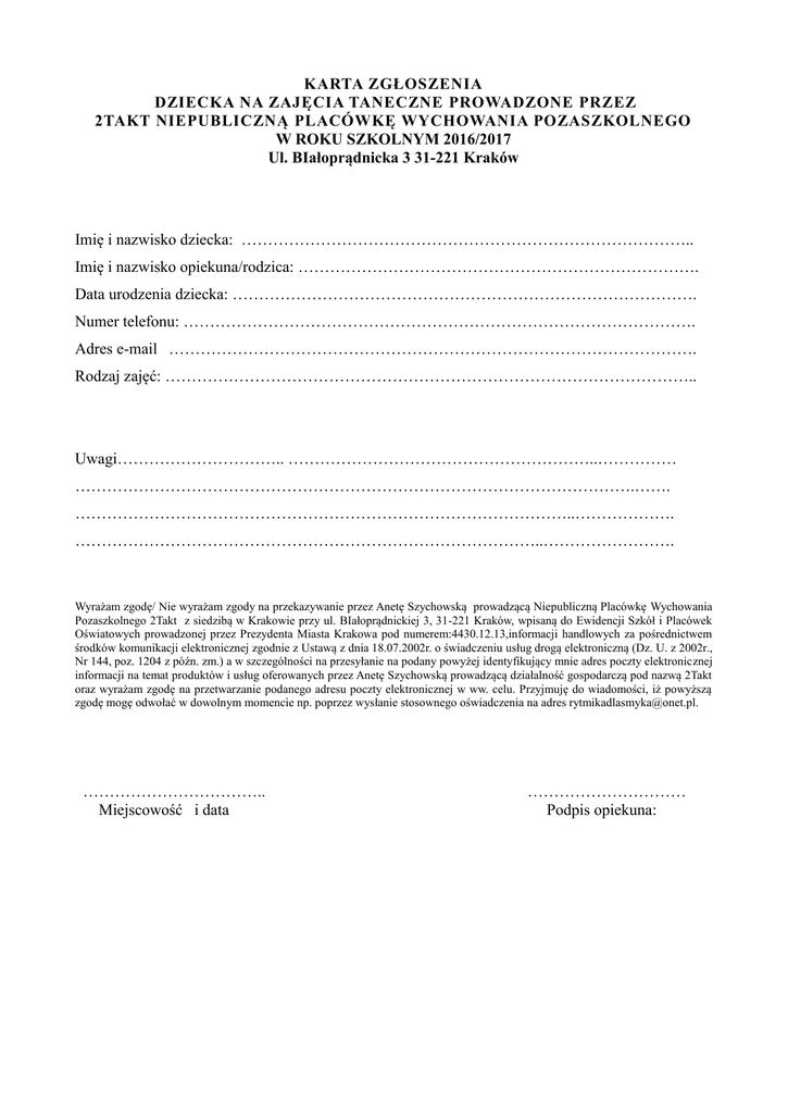 KARTA ZGŁOSZENIA DZIECKA NA ZAJĘCIA TANECZNE PROWADZONE PRZEZ 2TAKT NIEPUBLICZNĄ PLACÓWKĘ WYCHOWANIA POZASZKOLNEGO W ROKU SZKOLNYM 2016/2017 Ul. BIałoprądnicka 3 31-221 Kraków Imię i nazwisko dziecka: ………………………………………………………………………….. Imię i nazwisko opiekuna/rodzica: …………………………………………………………………. Data urodzenia dziecka: ……………………………………………………………………………. Numer telefonu: ……………………………………………………………………………………. Adres e-mail ………………………………………………………………………………………. Rodzaj zajęć: ……………………………………………………………………………………….. Uwagi………………………….. …………………………………………………..…………… …………………………………………………………………………………………….……. …………………………………………………………………………………..………………. ……………………………………………………………………………..……………………. Wyrażam zgodę/ Nie wyrażam zgody na przekazywanie przez Anetę Szychowską prowadzącą Niepubliczną Placówkę Wychowania Pozaszkolnego 2Takt z siedzibą w Krakowie przy ul. BIałoprądnickiej 3, 31-221 Kraków, wpisaną do Ewidencji Szkół i Placówek Oświatowych prowadzonej przez Prezydenta Miasta Krakowa pod numerem:4430.12.13,informacji handlowych za pośrednictwem środków komunikacji elektronicznej zgodnie z Ustawą z dnia 18.07.2002r. o świadczeniu usług drogą elektroniczną (Dz. U. z 2002r., Nr 144, poz. 1204 z późn. zm.) a w szczególności na przesyłanie na podany powyżej identyfikujący mnie adres poczty elektronicznej informacji na temat produktów i usług oferowanych przez Anetę Szychowską prowadzącą działalność gospodarczą pod nazwą 2Takt oraz wyrażam zgodę na przetwarzanie podanego adresu poczty elektronicznej w ww. celu. Przyjmuję do wiadomości, iż powyższą zgodę mogę odwołać w dowolnym momencie np. poprzez wysłanie stosownego oświadczenia na adres [email protected]. …………………………….. Miejscowość i data ………………………… Podpis opiekuna:
