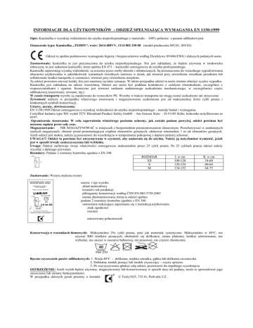 INFORMACJE DLA UŻYTKOWNIKÓW - ODZIEŻ SPEŁNIAJĄCA WYMAGANIA EN 1150:1999 Opis: Kamizelka o wysokiej widzialności do użytku nieprofesjonalnego z materiału - 100% poliester z pasami odblaskowymi. Oznaczenie typu: Kamizelka „TEDDY“, wzór: 2614-BBVV, 1114 002 150 00 (model producenta SFC01, SFC02) Odzież ta spełnia podstawowe wymagania higieny i bezpieczeństwa według Dyrektywy 89/686/EWG i dalszych podanych norm. Zastosowanie: kamizelka ta jest przeznaczona do użytku nieprofesjonalnego. Nie jest zakładane, że będzie używana w środowisku roboczym, to jest zadaniem kamizelki, która spełnia EN 471 – kamizelki ostrzegawcze do użytku profesjonalnego. Kamizelki zapewniają wysoką widzialność, są noszone przez osoby dorosłe i młodocianych. Są przeznaczone do wizualnego sygnalizowania obecności użytkownika w jakichkolwiek warunkach świetlnych zarówno w dzień, jak również przy oświetleniu światłami przednimi lub reflektorami środka transportu w ciemności, również przy oświetleniu miejskim. Tę odzież powinien używać każdy, kto jest narażony na takie sytuacje. W takim przypadku odzież ta może istotnie obniżyć ryzyko wypadku. Kamizelka jest zakładana na odzież wierzchnią. Odzież nie może być poddana kontaktowi z ciekłymi chemikaliami, szczególnie z rozpuszczalnikami i ogniem. Konieczne jest również unikanie nadmiernego uszkodzenia mechanicznego, w szczególności części odblaskowej (rozerwanie, urwanie, itp.). W czasie transportu wyroby są zapakowane do woreczków PE. Wyroby w trakcie transportu nie mogą zostać uszkodzone ani zniszczone. Żywotność odzieży w przypadku właściwego stosowania i magazynowania uzależniona jest od maksymalnej ilości cykli prania i konkretnych symboli konserwacji. Ustawy, normy, obwieszczenia: EN 1150:1999 Odzież ostrzegawcza o wysokiej widzialności do użytku nieprofesjonalnego – metody badań i wymagania. Certyfikat badania typu WE wydał TÜV Rheinland Product Safety GmbH – Am Grauen Stein - D-51105 Köln; Jednostka notyfikowana nr 0197. Ograniczenia stosowania: W celu zapewnienia właściwego poziomu ochrony, jak zostało podane powyżej, odzież powinna być noszona zapięta przez cały czas. Magazynowanie: NIE MAGAZYNOWAĆ w miejscach z bezpośrednim promieniowaniem słonecznym. Przechowywać w zamkniętych suchych magazynach, chronić przed promieniującym ciepłem elementów grzejnych, ulokować minimalnie 1 m od elementów grzejnych. Jeżeli odzież jest mokra, należy ją pozostawić do wyschnięcia w temperaturze pokojowej i dopiero później schować. UWAGA!!! Odzież ta powinna być utrzymywana w czystości, aby nadawała się do użytku. Należy ją natychmiast wymienić, jeżeli jest w sposób trwały zanieczyszczona lub wyblakła. Uwaga: Odzież zachowuje swoje właściwości ostrzegawcze maksymalnie przez 25 cykli prania. Po 25 cyklach prania odzież należy wycofać z dalszego używania. Rozmiary: Podane 2 rozmiary kontrolne zgodnie z EN 340. II. ROZMIAR I. w cm II. w cm XS 100-120 54-60 I. S 120-134 60-64 M 134-152 64-73 Znakowanie: Wszyta etykieta (wzór) 40 max 25x EN 1150:1999 II. I. 3-6 let XS I.: ....100-120... II.: ......54-60... Tento výrobek musí být udržován v čistotě, aby zůstal funkční. Pokud je neodstranitelně ušpiněn nebo vybledlý, je nutné jej nahradit nazwa i typ wyrobu skład materiałowy kwartał i rok produkcji piktogramy konserwacji według ČSN EN ISO 3758:2005 norma zharmonizowana, którą ta odzież spełnia podane 2 rozmiary kontrolne zgodnie z EN 340. ostrzeżenie nakazujące zapoznanie się z instrukcją użytkowania znak zgodności rozmiar umocowany pełnomocnik Konserwacja w warunkach domowych: Maksymalnie 25x cykli prania, prać jak materiały syntetyczne. Maksymalnie w 40°C, nie używać BIO środków piorących, obchodzić się delikatnie, zimne płukanie, krótkie odwirowanie, nie wybielać, nie suszyć w suszarce bębnowej, nie prasować, nie czyścić chemicznie. 40 max 25x Ręczne czyszczenie pasów odblaskowych: 1. Woda 40°C - delikatna, miękka szmatka, gąbka lub delikatna szczoteczka 2. Delikatny środek piorący lub środek czyszczący – czysty spirytus 3. Po wyczyszczeniu spłukać całą odzież, pozostawić do zupełnego wyschnięcia OSTRZEŻENIE: Jeżeli wyrób będzie używany, magazynowany lub konserwowany w sposób inny niż podany, może to spowodować jego zniszczenie lub zmiany funkcjonalności. W przypadku dalszych pytań prosimy o kontakt: U Tesly1825, 735 41, Petřvald, CZ.