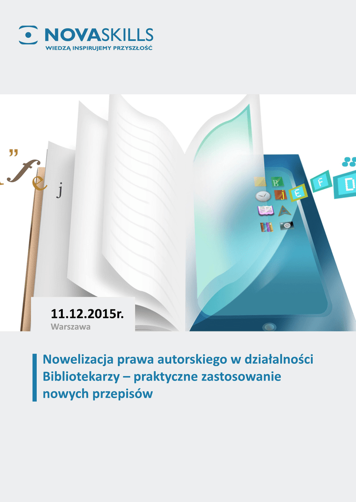 11. 12. 2015r . Wa r s z a wa Nowe l i z a c j apr a waa ut or s k i e g owdz i a ł a l noś c i Bi bl i ot e k a r z y–pr a k t y c z nez a s t os owa ni e nowy c hpr z e pi s ów (22) 100 45 54 lub na email [email protected] Wypełniony formularz wyślij na nr faksu KORZYŚCI Przedmiotem szkolenia są zagadnienia z zakresu znowelizowanego prawa autorskiego, które mają walor praktyczny w działalności bibliotek. Akcent merytoryczny położony jest na omówienie kwestii związanych z korzystaniem z utworów, w tym dotyczących praw osobistych i majątkowych mieszczących się w zakresie monopolu autorskiego i tematu dozwolonego użytku chronionych utworów. W związku z coraz szerszymi możliwościami wykorzystywania przez biblioteki osiągnięć technologii cyfrowej, szczególna uwaga zostanie poświęcona aspektom cyfrowych form eksploatacji utworów, w tym kwestii tworzenia i funkcjonowania e‐bibliotek. Szkolenie dedykowane jest przedstawicielom bibliotek wszystkich kategorii z Biblioteką Narodową na czele, pracownikom bibliotek jednostek samorządu terytorialnego – gminnych, powiatowych, wojewódzkich, bibliotek naukowych, szkolnych i bibliotek innych placówek systemu oświaty, bibliotek fachowych i zakładowych. Do uczestnictwa w szkoleniu zachęca się wszystkich pracowników bibliotek, którzy w ramach realizacji swoich obowiązków mają kontakt z utworami, w tym zasobami bibliotecznymi oraz utworami pełniącymi w bibliotekach akcesoryjne funkcje użytkowe (programy komputerowe, bazy danych). PROGRAM Przedmiot ochrony prawnoautorskiej utwór – zakres ochrony prawnoautorskiej, w tym elementy i aspekty utworu pozostające poza granicami monopolu autorskiego chronione utwory a domena publiczna i dobra niematerialne podlegające ochronie na gruncie innych reżimów prawnych niż prawo autorskie utwory zależne (opracowania) a nietwórcze przeróbki dzieł kategorie utworów i odmienności w zakresie zasad ich ochrony prawnoautorskiej Zakres monopolu autorskiego autorskie prawa osobiste – kategorie praw, specyfika, dozwolone umowne ograniczenia wykonywania autorskich praw osobistych, praktyczne znaczenie autorskich praw osobistych w działalności bibliotecznej autorskie prawa majątkowe – w tym prawo do korzystania z utworu i wynagrodzenia autorskiego z tytułu jego eksploatacji pola eksploatacji utworów, w szczególności cyfrowe formy korzystania – publikacje elektroniczne (e‐booki, audiobooki, multibooki), trwałe i efemeryczne zwielokrotnienia utworów, rozpowszechnianie utworów w postaci cyfrowej, w tym wprowadzenie do obrotu, Nova Skills Sp. z o.o. tel. (22) 100 45 55 KRS 0000477594 ul. Kolejowa 47/U23 01‐210 Warszawa fax. (22) 100 45 54 NIP 527‐270‐13‐34 www.novaskills.pl (22) 100 45 54 lub na email [email protected] Wypełniony formularz wyślij na nr faksu najem lub użyczenie cyfrowych egzemplarzy utworów, publiczne udostępnianie utworów w Internecie wynagrodzenie autorskie za użyczanie egzemplarzy utworów przez biblioteki publiczne na gruncie nowelizacji prawa autorskiego autorskie prawa zależne – zasady korzystania z opracowań cudzych utworów e‐biblioteki – podstawy prawne tworzenia i funkcjonowania bibliotek cyfrowych przykłady naruszeń praw autorskich w ramach działalności bibliotek i ich konsekwencje prawne – ogólne podstawowe zasady odpowiedzialności Podmioty uprawnione z tytułu praw autorskich podmioty uprawnione z tytułu autorskich praw osobistych podmioty uprawnione z tytułu autorskich praw majątkowych – pierwotne i pochodne nabycie praw (spadkobranie, umowy przenoszące autorskie prawa majątkowe) podmiot uprawniony do utworów pracowniczych i utworów zbiorowych Ograniczenia monopolu autorskiego – dozwolony użytek utworów instytucja dozwolonego użytku utworów – istota i ogólne zasady eksploatacji utworów w ramach dozwolonego użytku (oznaczenie utworu, warunek normalnego korzystania z utworu i zapewnienia nienaruszalności słusznych interesów twórcy) kategorie dozwolonego użytku utworów istotne z punktu widzenia działalności bibliotecznej z uwzględnieniem nowelizacji prawa autorskiego, w szczególności: ‐ sporządzanie egzemplarzy utworów ‐ udostępnianie tradycyjnych i cyfrowych materialnych egzemplarzy utworów ‐ udostępnianie zbiorów cyfrowych za pośrednictwem terminali sieci intranetowych a udostępnienie w sieci internetowej ‐ prawo cytatu ‐ kopiowanie utworów dla własnego użytku osobistego osób trzecich ‐ zagadnienia związane z dozwolonym użytkiem w Internecie dozwolony użytek utworów a korzystanie z utworów niedostępnych w obrocie handlowym na gruncie nowelizacji prawa autorskiego Umowy prawnoautorskie – zagadnienia podstawowe kategorie umów autorskich i ich ogólna charakterystyka – umowy licencyjne, umowy przenoszące autorskie prawa majątkowe, umowy o dzieło z klauzulami autorskimi, umowy dotyczące opracowań cudzych utworów praktyczne aspekty zawierania i formułowania umów autorskich w działalności bibliotecznej, w tym umów dotyczących cyfrowej eksploatacji utworów niedozwolone klauzule umowne na gruncie przepisów prawa autorskiego Nova Skills Sp. z o.o. tel. (22) 100 45 55 KRS 0000477594 ul. Kolejowa 47/U23 01‐210 Warszawa fax. (22) 100 45 54 NIP 527‐270‐13‐34 www.novaskills.pl (22) 100 45 54 lub na email [email protected] Wypełniony formularz wyślij na nr faksu EKSPERT: Adwokat Agnieszka Malczewska Agnieszka Malczewska jest adwokatem w Kancelarii Prawnej Bukowski i Wspólnicy w Krakowie. Specjalizuje się w dziedzinie prawa własności intelektualnej. Prowadzi warsztaty i szkolenia poświęcone zagadnieniom z zakresu ochrony dóbr intelektualnych, w tym utworów, przedmiotu praw pokrewnych i praw własności przemysłowej, ochrony dóbr osobistych, a także kwestiom z dziedziny prawa konkurencji w kontekście działalności wydawniczej, reklamowo‐marketingowej, informatycznej oraz filmowej. Publikuje w prasie specjal