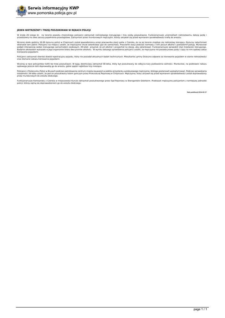 Serwis informacyjny KWP www.pomorska.policja.gov.pl JEDEN NIETRZEŹWY I TRZEJ POSZUKIWANI W RĘKACH POLICJI W środę 26 lutego br. na terenie powiatu chojnickiego policjanci zatrzymali nietrzeźwego kierującego i trzy osoby poszukiwane. Funkcjonariusze uniemożliwili nietrzeźwemu dalszą jazdę i przedstawią mu dwa zarzuty popełnienia przestępstwa. Zatrzymani przez mundurowych mężczyźni, którzy ukrywali się przed wymiarem sprawiedliwości trafią do aresztu. Wczoraj około godziny 16.00 dyżurny policji w Chojnicach został powiadomiony przez pracownika stacji paliw z Czerska, że na jej terenie znajduje się nietrzeźwy kierujący. Dyżurny natychmiast skierował tam patrol. Policjanci na miejscu ustalili, że mężczyzna chciał zatankować gaz do samochodu. Pracownik stacji podczas rozmowy z nim poczuł alkohol i powiadomił policję. Mundurowi podjęli interwencję wobec kierującego samochodem osobowym. 49-latek przyznał, że pił alkohol i przyjechał na stację, aby zatankować. Funkcjonariusze sprawdzili stan trzeźwości kierującego. Badanie alkotestem wykazało w jego organizmie blisko dwa promile alkoholu. W wyniku dalszego sprawdzenia policjanci ustalili, że mężczyzna nie posiada prawa jazdy i ciąży na nim sądowy zakaz kierowania pojazdami. Policjanci zatrzymali również dowód rejestracyjny pojazdu, który nie posiadał aktualnych badań technicznych. Mieszkaniec gminy Osieczna odpowie za kierowanie pojazdem w stanie nietrzeźwości oraz złamanie zakazu kierowania pojazdami. Wczoraj w ręce policjantów trafili też trzej poszukiwani. W Łęgu dzielnicowy zatrzymał 58-latka, który był poszukiwany do odbycia kary pozbawienia wolności. Mundurowi, na podstawie nakazu sądowego jeszcze dziś doprowadzą go do aresztu, gdzie spędzi najbliższe trzy miesiące. Policjanci z Posterunku Policji w Brusach podczas patrolowania centrum miasta zauważyli w pobliżu przystanku autobusowego mężczyznę, którego postanowili wylegitymować. Podczas sprawdzania tożsamości 34-latka ustalili, że jest on poszukiwany listem gończym przez Prokuraturę Rejonową w Chojnicach. Mężczyzna, który ukrywał się przed wymiarem sprawiedliwości został doprowadzony przez mundurowych do aresztu śledczego. Funkcjonariusze Komisariatu z Czerska w miejscowości Kurcze zatrzymali poszukiwanego przez Sąd Rejonowy w Starogardzie Gdańskim. Przekazali mężczyznę policjantom z tamtejszej jednostki policji, którzy zajmą się doprowadzeniem go do aresztu śledczego. Data publikacji:2014-02-27 page 1 / 1 Powered by TCPDF (www.tcpdf.org)
