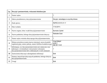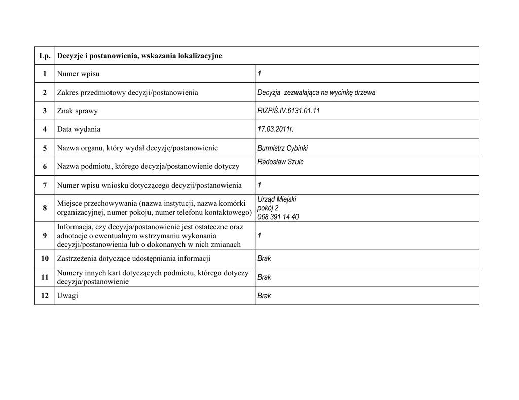 Lp. Decyzje i postanowienia, wskazania lokalizacyjne 1 Numer wpisu 1 2 Zakres przedmiotowy decyzji/postanowienia Decyzja zezwalająca na wycinkę drzewa 3 Znak sprawy RIZPiŚ.IV.6131.01.11 4 Data wydania 17.03.2011r. 5 Nazwa organu, który wydał decyzję/postanowienie Burmistrz Cybinki 6 Nazwa podmiotu, którego decyzja/postanowienie dotyczy 7 Numer wpisu wniosku dotyczącego decyzji/postanowienia 8 9 Radosław Szulc 1 Urząd Miejski Miejsce przechowywania (nazwa instytucji, nazwa komórki pokój 2 organizacyjnej, numer pokoju, numer telefonu kontaktowego) 068 391 14 40 Informacja, czy decyzja/postanowienie jest ostateczne oraz adnotacje o ewentualnym wstrzymaniu wykonania 1 decyzji/postanowienia lub o dokonanych w nich zmianach 10 Zastrzeżenia dotyczące udostępniania informacji Brak 11 Numery innych kart dotyczących podmiotu, którego dotyczy decyzja/postanowienie Brak 12 Uwagi Brak Lp. Decyzje i postanowienia, wskazania lokalizacyjne 1 Numer wpisu 2 2 Zakres przedmiotowy decyzji/postanowienia Decyzja zezwalająca na wycinkę drzew 3 Znak sprawy RIZPiŚ.IV.6131.09.11 4 Data wydania 21.03.2010r. 5 Nazwa organu, który wydał decyzję/postanowienie 6 Nazwa podmiotu, którego decyzja/postanowienie dotyczy Agnieszka i Lesław Fatla 7 Numer wpisu wniosku dotyczącego decyzji/postanowienia 2 8 9 Burmistrz Cybinki Urząd Miejski Miejsce przechowywania (nazwa instytucji, nazwa komórki pokój 2 organizacyjnej, numer pokoju, numer telefonu kontaktowego) 068 391 14 40 Informacja, czy decyzja/postanowienie jest ostateczne oraz adnotacje o ewentualnym wstrzymaniu wykonania 2 decyzji/postanowienia lub o dokonanych w nich zmianach 10 Zastrzeżenia dotyczące udostępniania informacji Brak 11 Numery innych kart dotyczących podmiotu, którego dotyczy decyzja/postanowienie Brak 12 Uwagi Brak Lp. Decyzje i postanowienia, wskazania lokalizacyjne 1 Numer wpisu 3 2 Zakres przedmiotowy decyzji/postanowienia Decyzja zezwalająca na wycinkę drzew 3 Znak sprawy RIZPiŚ.IV.6131.12..11 4 Data wydania 21.03.2011r. 5 Nazwa organu, który wydał decyzję/postanowienie 6 Nazwa podmiotu, którego decyzja/postanowienie dotyczy Jacek Syta 7 Numer wpisu wniosku dotyczącego decyzji/postanowienia 12 8 9 Burmistrz Cybinki Urząd Miejski Miejsce przechowywania (nazwa instytucji, nazwa komórki pokój 2 organizacyjnej, numer pokoju, numer telefonu kontaktowego) 068 391 14 40 Informacja, czy decyzja/postanowienie jest ostateczne oraz adnotacje o ewentualnym wstrzymaniu wykonania 12 decyzji/postanowienia lub o dokonanych w nich zmianach 10 Zastrzeżenia dotyczące udostępniania informacji Brak 11 Numery innych kart dotyczących podmiotu, którego dotyczy decyzja/postanowienie Brak 12 Uwagi Brak Lp. Decyzje i postanowienia, wskazania lokalizacyjne 1 Numer wpisu 4 2 Zakres przedmiotowy decyzji/postanowienia Decyzja zezwalająca na wycinkę drzewa 3 Znak sprawy RIZPiŚ.IV.6131.13.11 4 Data wydania 24.03.2011r. 5 Nazwa organu, który wydał decyzję/postanowienie Burmistrz Cybinki 6 Nazwa podmiotu, którego decyzja/postanowienie dotyczy Zenon Walenczewski 7 Numer wpisu wniosku dotyczącego decyzji/postanowienia 13 8 9 Urząd Miejski Miejsce przechowywania (nazwa instytucji, nazwa komórki pokój 2 organizacyjnej, numer pokoju, numer telefonu kontaktowego) 068 391 14 40 Informacja, czy decyzja/postanowienie jest ostateczne oraz adnotacje o ewentualnym wstrzymaniu wykonania 13 decyzji/postanowienia lub o dokonanych w nich zmianach 10 Zastrzeżenia dotyczące udostępniania informacji Brak 11 Numery innych kart dotyczących podmiotu, którego dotyczy decyzja/postanowienie Brak 12 Uwagi Brak Lp. Decyzje i postanowienia, wskazania lokalizacyjne 1 Numer wpisu 5 2 Zakres przedmiotowy decyzji/postanowienia Decyzja zezwalająca na wycinkę drzew 3 Znak sprawy RIZPiŚ.IV.6131.14.11 4 Data wydania 06.04.2010r. 5 Nazwa organu, który wydał decyzję/postanowienie Burmistrz Cybinki 6 Nazwa podmiotu, którego decyzja/postanowienie dotyczy Regionalny Zarząd Gospodarki Wodnej 7 Numer wpisu wniosku dotyczącego decyzji/postanowienia 14 8 9 Urząd Miejski Miejsce przechowywania (nazwa instytucji, nazwa komórki pokój 2 organizacyjnej, numer pokoju, numer telefonu kontaktowego) 068 391 14 40 Informacja, czy decyzja/postanowienie jest ostateczne oraz adnotacje o ewentualnym wstrzymaniu wykonania 14 decyzji/postanowienia lub o dokonanych w nich zmianach 10 Zastrzeżenia dotyczące udostępniania informacji Brak 11 Numery innych kart dotyczących podmiotu, którego dotyczy decyzja/postanowienie Brak 12 Uwagi Brak Lp. Decyzje i postanowienia, wskazania lokalizacyjne 1 Numer wpisu 6 2 Zakres przedmiotowy decyzji/postanowienia Decyzja odmowna na wycinkę drzew 3 Znak sprawy RIZPiŚ.IV.6131.16.11 4 Data wydania 01.06.2011r. 5 Nazwa organu, który wydał decyzję/postanowienie Burmistrz Cybinki 6 Nazwa podmiotu, którego decyzja/postanowienie dotyczy Zarząd Dróg Powiatowych 7 Numer wpisu wniosku dotyczącego decyzji/postanowienia 16 8 9 Urząd Miejski Miejsce przechowywania (nazwa instytucji, nazwa komórki pokój 2 organizacyjnej, numer pokoju, numer telefonu kontaktowego) 068 391 14 40 Informacja, czy decyzja/postanowienie jest ostateczne oraz adnotacje o ewentualnym wstrzymaniu wykonania 16 decyzji/postanowienia lub o dokonanych w nich zmianach 10 Zastrzeżenia dotyczące udostępniania informacji Brak 11 Numery innych kart dotyczących podmiotu, którego dotyczy decyzja/postanowienie Brak 12 Uwagi Brak Lp. Decyzje i postanowienia, wskazania lokalizacyjne 1 Numer wpisu 7 2 Zakres przedmiotowy decyzji/postanowienia Decyzja zezwalająca na wycinkę drzewa 3 Znak sprawy RIZPiŚ.IV.6131.30.11 4 Data wydania 16.05.2011r. 5 Nazwa organu, który wydał decyzję/postanowienie Burmistrz Cybinki 6 Nazwa podmiotu, którego decyzja/postanowienie dotyczy Iwona i Tomasz Dziedzic 7 Numer wpisu wniosku dotyczącego decyzji/postanowienia 30 8 9 Urząd Miejski Miejsce przechowywania (nazwa instytucji, nazwa komórki Referat Gospodarki i Ochrony Środowiska org