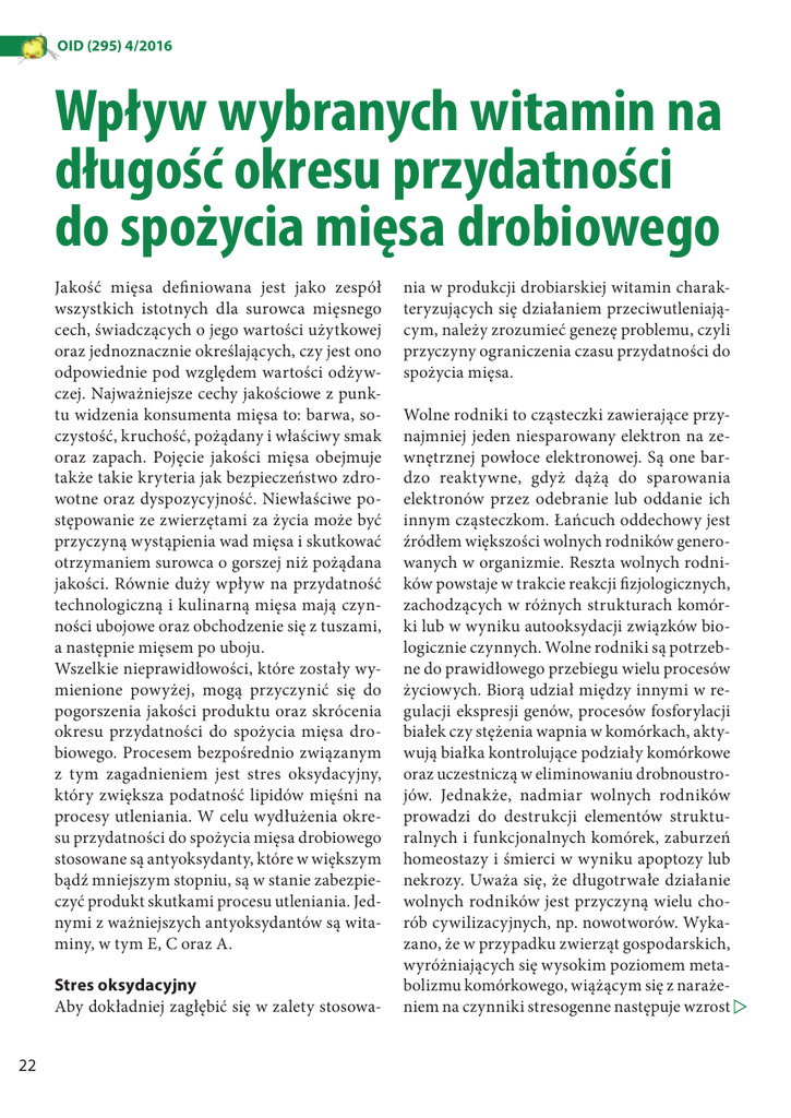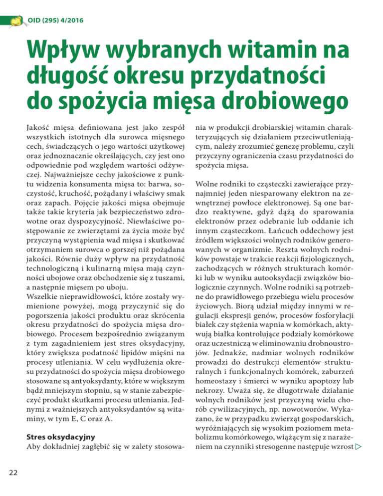 OID (295) 4/2016 OID (267) 12/2013 Wpływ wybranych witamin na długość okresu przydatności do spożycia mięsa drobiowego Jakość mięsa definiowana jest jako zespół wszystkich istotnych dla surowca mięsnego cech, świadczących o jego wartości użytkowej oraz jednoznacznie określających, czy jest ono odpowiednie pod względem wartości odżywczej. Najważniejsze cechy jakościowe z punktu widzenia konsumenta mięsa to: barwa, soczystość, kruchość, pożądany i właściwy smak oraz zapach. Pojęcie jakości mięsa obejmuje także takie kryteria jak bezpieczeństwo zdrowotne oraz dyspozycyjność. Niewłaściwe postępowanie ze zwierzętami za życia może być przyczyną wystąpienia wad mięsa i skutkować otrzymaniem surowca o gorszej niż pożądana jakości. Równie duży wpływ na przydatność technologiczną i kulinarną mięsa mają czynności ubojowe oraz obchodzenie się z tuszami, a następnie mięsem po uboju. Wszelkie nieprawidłowości, które zostały wymienione powyżej, mogą przyczynić się do pogorszenia jakości produktu oraz skrócenia okresu przydatności do spożycia mięsa drobiowego. Procesem bezpośrednio związanym z tym zagadnieniem jest stres oksydacyjny, który zwiększa podatność lipidów mięśni na procesy utleniania. W celu wydłużenia okresu przydatności do spożycia mięsa drobiowego stosowane są antyoksydanty, które w większym bądź mniejszym stopniu, są w stanie zabezpieczyć produkt skutkami procesu utleniania. Jednymi z ważniejszych antyoksydantów są witaminy, w tym E, C oraz A. Stres oksydacyjny Aby dokładniej zagłębić się w zalety stosowa22 nia w produkcji drobiarskiej witamin charakteryzujących się działaniem przeciwutleniającym, należy zrozumieć genezę problemu, czyli przyczyny ograniczenia czasu przydatności do spożycia mięsa. Wolne rodniki to cząsteczki zawierające przynajmniej jeden niesparowany elektron na zewnętrznej powłoce elektronowej. Są one bardzo reaktywne, gdyż dążą do sparowania elektronów przez odebranie lub oddanie ich innym cząsteczkom. Łańcuch oddechowy jest źródłem większości wolnych rodników generowanych w organizmie. Reszta wolnych rodników powstaje w trakcie reakcji fizjologicznych, zachodzących w różnych strukturach komórki lub w wyniku autooksydacji związków biologicznie czynnych. Wolne rodniki są potrzebne do prawidłowego przebiegu wielu procesów życiowych. Biorą udział między innymi w regulacji ekspresji genów, procesów fosforylacji białek czy stężenia wapnia w komórkach, aktywują białka kontrolujące podziały komórkowe oraz uczestniczą w eliminowaniu drobnoustrojów. Jednakże, nadmiar wolnych rodników prowadzi do destrukcji elementów strukturalnych i funkcjonalnych komórek, zaburzeń homeostazy i śmierci w wyniku apoptozy lub nekrozy. Uważa się, że długotrwałe działanie wolnych rodników jest przyczyną wielu chorób cywilizacyjnych, np. nowotworów. Wykazano, że w przypadku zwierząt gospodarskich, wyróżniających się wysokim poziomem metabolizmu komórkowego, wiążącym się z narażeniem na czynniki stresogenne następuje wzrost OID (295) 4/2016 OID (267) 12/2013 koncentracji wolnych rodników. Dłużej trwające wystawienie zwierząt na niekorzystne warunki, o których będzie mowa w dalszej części artykułu, prowadzące do zaburzenia równowagi oksydacyjno-redukcyjnej ustroju, czyli stresu oksydacyjnego, powoduje zmiany jakościowe produktów odzwierzęcych, w tym mięsa. Do najbardziej znanych czynników stresogennych w produkcji drobiarskiej należy wysoka temperatura (stres cieplny), oraz warunki transportu i uboju. Nieodpowiedni mikroklimat środka transportu, a w szczególności niewłaściwa temperatura to główne czynniki powodujące wzrost śmiertelności ptaków podczas jego trwania, obniżenie poziomu ich dobrostanu oraz późniejsze obniżenie jakości mięsa od nich pozyskanego. Stwierdzono, iż wraz ze wzrostem temperatury oraz długością przetrzymywania ptaków w klatkach transportowych dochodzi do znaczących strat masy ciała. U kurcząt brojlerów narażonych na stres cieplny zanotowano również obniżenie poziomu białka ogólnego w mięśniach, negatywny wpływ na barwę mięsa oraz zwiększenie twardości i straty na skutek kurczenia się włókien mięśniowych. Zważywszy na wpływ stresu na jakość mięsa stwierdzono, że niezbędne jest podejmowanie badań nad stresem, uwzględniając przy tym poszukiwanie dobrych metod strategii kontroli stresu, ponieważ sukces w hodowli drobiu polega raczej nie na wyeliminowanie stresu, lecz utrzymaniu go na optymalnym poziomie. Utlenianie tłuszczów Jak już wspomniano, stres oksydacyjny zwiększa podatność lipidów mięsa drobiowego na procesy oksydacji tłuszczów. Reakcje utleniania lipidów mogą przebiegać według różnych mechanizmów, dlatego wyróżniono autooksydację oraz utlenianie fotosensybilizowane. Autooksydacja, czyli samoutlenianie, polega na przyłączaniu się tlenu do kwasów tłuszczowych. Proces autooksydacji jest reakcją 24 łańcuchową i zapoczątkowany przebiega dalej samorzutnie, zapewniając ciągłą dostawę wolnych rodników, które inicjują kolejne reakcje. Tymczasem, fotosensybilizowane utlenianie lipidów polega na utlenianiu tłuszczu pod wpływem światła. Do zapoczątkowania reakcji niezbędne jest dostarczenie światła oraz sensybilizatora, którym najczęściej są barwniki. Utlenianie lipidów jest procesem bardzo złożonym. Inicjowane jest przez tworzenie się wolnych rodników lipidowych. Etap ten wymaga wysokiej energii aktywacji, która może być dostarczana, między innymi poprzez energię termiczną lub tlen singletowy (forma tlenu cząsteczkowego bez niesparowanych elektronów na najniższym stanie wzbudzonym). Następnym etapem jest proces propagacji, tzn. wolnorodnikowej reakcji łańcuchowej, której efektem jest powstanie wodoronadtlenków lipidowych (głównych produktów reakcji utl