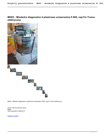 Artyku?y pszczelarskie : MD03 - Miodarka diagonalna 4 plastrowa uniwersalna fi 600, MD03 - Miodarka diagonalna 4 plastrowa uniwersalna fi 600, nap?d r?cznoelektryczny MD03 - Miodarka diagonalna 4 plastrowa uniwersalna fi 600, nap?d r?czno-elektryczny Ocena: Nie ma jeszcze oceny Cena Cena sprzeda?y 2350,00 z? Zapytaj o produkt 1 / 2 Artyku?y pszczelarskie : MD03 - Miodarka diagonalna 4 plastrowa uniwersalna fi 600, Opis Oferujemy Pa?stwu: Miodarka diagonalna 4 plastrowa uniwersalna fi 600, nap?d r?czno-elektryczny / MD-03 / Miodarka diagonalna, o ?rednicy b?bna 600mm, mie?ci 4 ramki wewn?trz kosza. Nap?d r?czno-elektryczny. Posiada mo?liwo?? wirowania praktycznie wszystkich typów ramek. B?ben o ?rednicy 600mm wykonany jest z blachy nierdzewnej, kwasoodpornej. Wysoko?? zewn?trzna b?bna: 600mm Ca?kowita wysoko?? miodarki: 1150mm Kosz, wykonany z kraty nierdzewnej, kwasoodpornej, u?o?onej w sposób zabezpieczaj?cy ramki przed wy?amywaniem si? plastrów w trakcie wirowania. Wysoko?? kosza: 440mm / szeroko?? kosza: 370mm Rozmiar oczka kosza 23x45 mm. Urz?dzenie wyposa?one jest w automatyczn? blokad? zapobiegaj?c? otwarciu miodarki podczas pracy. Pokrywa miodarki jest prze?roczysta, umo?liwia obserwowanie procesu wirowania bez konieczno?ci otwierania miodarki i nara?ania si? na niebezpiecze?stwo kontaktu z wiruj?cym koszem. Miodarka posiada zawór nierdzewny 5/4”. W przypadku wszystkich typów miodarek diagonalnych niezb?dnym elementem jest odwracanie ramek. UWAGA - KOSZT EWENTUALNEGO TRANSPORTU/ODBIORU DO POTWIERDZENIA TELEFONICZNEGO / TEL: 44 646 45 93. W naszej ofercie znajdziecie Pa?stwo równie? miodarki r?czne, elektryczne - zarówno diagonalne, jak i kasetowe, czy radialne. Sto?y do odsklepiania, odstojniki i inne. Zlecenia z?o?one do godziny 12.00 wysy?amy tego samego dnia. Zlecenia z?o?one po godzinie 12.00 wysy?amy nast?pnego dnia. Jako nowej na rynku polskim firmie rodzinnej - zale?y nam bardzo na najwy?szej satysfakcji Klientów i pozyskaniu samych pozytywnych Pa?stwa opinii. Dlatego zarówno do produktów, jak i dostaw przywi?zujemy wielk? wag? - a Pa?stwa zadowolenie to nasz priorytet. Zach?camy do zakupów - gwarantujemy solidno?? i uczciwo??. Polecamy równie? sk?adanie zamówie? telefonicznych i mailowych. Na wszystkich naszych aukcjach p?acicie Pa?stwo tylko jeden koszt przesy?ki, czyli kwot? najwy?szej dostawy spo?ród wszystkich zakupionych przedmiotów ( paczka max 30 kg ). Zapraszamy na nasze inne aukcje. Du?y wybór produktów i niskie ceny! Czynne: poniedzia?ek-pi?tek: 8.00-17.00 sobota: 8.00-14.00 Zamówienia mailowe mo?na sk?ada? przez ca?? dob?. Opinie Nikt jeszcze nie recenzowa? tego produktu. 2 / 2 Powered by TCPDF (www.tcpdf.org)
