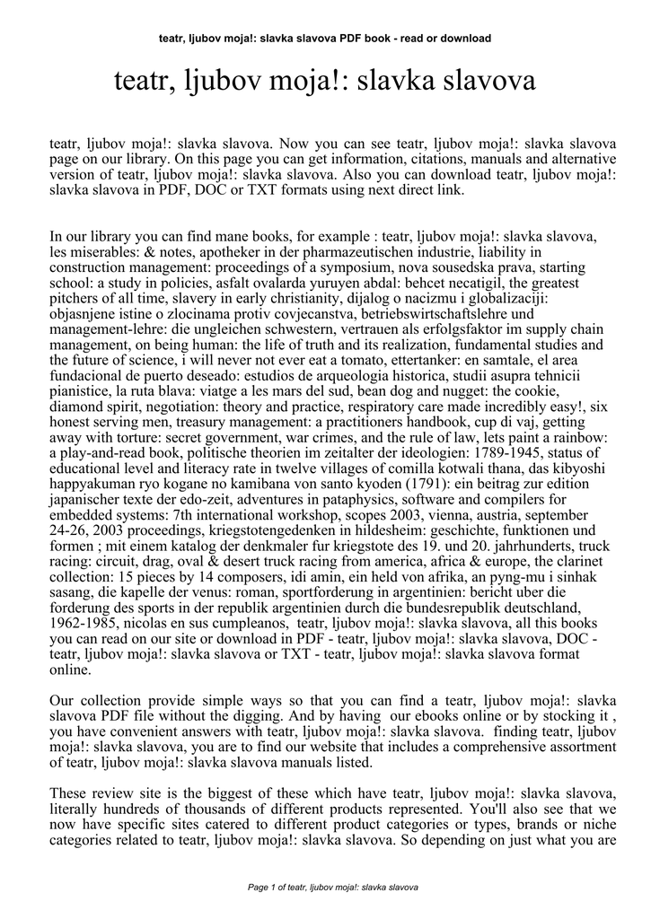 teatr, ljubov moja!: slavka slavova PDF book - read or download teatr, ljubov moja!: slavka slavova teatr, ljubov moja!: slavka slavova. Now you can see teatr, ljubov moja!: slavka slavova page on our library. On this page you can get information, citations, manuals and alternative version of teatr, ljubov moja!: slavka slavova. Also you can download teatr, ljubov moja!: slavka slavova in PDF, DOC or TXT formats using next direct link. In our library you can find mane books, for example : teatr, ljubov moja!: slavka slavova, les miserables: & notes, apotheker in der pharmazeutischen industrie, liability in construction management: proceedings of a symposium, nova sousedska prava, starting school: a study in policies, asfalt ovalarda yuruyen abdal: behcet necatigil, the greatest pitchers of all time, slavery in early christianity, dijalog o nacizmu i globalizaciji: objasnjene istine o zlocinama protiv covjecanstva, betriebswirtschaftslehre und management-lehre: die ungleichen schwestern, vertrauen als erfolgsfaktor im supply chain management, on being human: the life of truth and its realization, fundamental studies and the future of science, i will never not ever eat a tomato, ettertanker: en samtale, el area fundacional de puerto deseado: estudios de arqueologia historica, studii asupra tehnicii pianistice, la ruta blava: viatge a les mars del sud, bean dog and nugget: the cookie, diamond spirit, negotiation: theory and practice, respiratory care made incredibly easy!, six honest serving men, treasury management: a practitioners handbook, cup di vaj, getting away with torture: secret government, war crimes, and the rule of law, lets paint a rainbow: a play-and-read book, politische theorien im zeitalter der ideologien: 1789-1945, status of educational level and literacy rate in twelve villages of comilla kotwali thana, das kibyoshi happyakuman ryo kogane no kamibana von santo kyoden (1791): ein beitrag zur edition japanischer texte der edo-zeit, adventures in pataphysics, software and compilers for embedded systems: 7th international workshop, scopes 2003, vienna, austria, september 24-26, 2003 proceedings, kriegstotengedenken in hildesheim: geschichte, funktionen und formen ; mit einem katalog der denkmaler fur kriegstote des 19. und 20. jahrhunderts, truck racing: circuit, drag, oval & desert truck racing from america, africa & europe, the clarinet collection: 15 pieces by 14 composers, idi amin, ein held von afrika, an pyng-mu i sinhak sasang, die kapelle der venus: roman, sportforderung in argentinien: bericht uber die forderung des sports in der republik argentinien durch die bundesrepublik deutschland, 1962-1985, nicolas en sus cumpleanos, teatr, ljubov moja!: slavka slavova, all this books you can read on our site or download in PDF - teatr, ljubov moja!: slavka slavova, DOC teatr, ljubov moja!: slavka slavova or TXT - teatr, ljubov moja!: slavka slavova format online. Our collection provide simple ways so that you can find a teatr, ljubov moja!: slavka slavova PDF file without the digging. And by having our ebooks online or by stocking it , you have convenient answers with teatr, ljubov moja!: slavka slavova. finding teatr, ljubov moja!: slavka slavova, you are to find our website that includes a comprehensive assortment of teatr, ljubov moja!: slavka slavova manuals listed. These review site is the biggest of these which have teatr, ljubov moja!: slavka slavova, literally hundreds of thousands of different products represented. You'll also see that we now have specific sites catered to different product categories or types, brands or niche categories related to teatr, ljubov moja!: slavka slavova. So depending on just what you are Page 1 of teatr, ljubov moja!: slavka slavova teatr, ljubov moja!: slavka slavova PDF book - read or download searching, you will be able to choose ebooks teatr, ljubov moja!: slavka slavova to suit your own needs, teatr, ljubov moja!: slavka slavova. Page 2 of teatr, ljubov moja!: slavka slavova