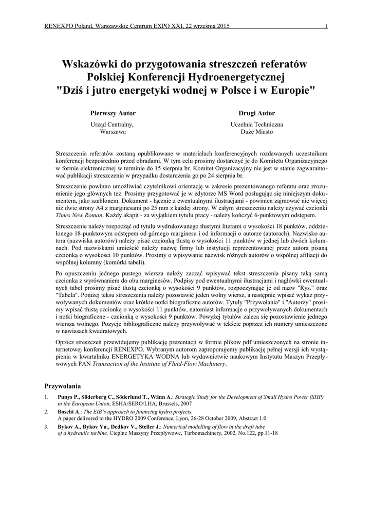 RENEXPO Poland, Warszawskie Centrum EXPO XXI, 22 września 2015 1 Wskazówki do przygotowania streszczeń referatów Polskiej Konferencji Hydroenergetycznej "Dziś i jutro energetyki wodnej w Polsce i w Europie" Pierwszy Autor Drugi Autor Urząd Centralny, Warszawa Uczelnia Techniczna Duże Miasto Streszczenia referatów zostaną opublikowane w materiałach konferencyjnych rozdawanych uczestnikom konferencji bezpośrednio przed obradami. W tym celu prosimy dostarczyć je do Komitetu Organizacyjnego w formie elektronicznej w terminie do 15 sierpnia br. Komitet Organizacyjny nie jest w stanie zagwarantować publikacji streszczenia w przypadku dostarczenia go po 24 sierpnia br. Streszczenie powinno umożliwiać czytelnikowi orientację w zakresie prezentowanego referatu oraz zrozumienie jego głównych tez. Prosimy przygotować je w edytorze MS Word posługując się niniejszym doku mentem, jako szablonem. Dokument - łącznie z ewentualnymi ilustracjami - powinien zajmować nie więcej niż dwie strony A4 z marginesami po 25 mm z każdej strony. W całym streszczeniu należy używać czcionki Times New Roman. Każdy akapit - za wyjątkiem tytułu pracy - należy kończyć 6-punktowym odstępem. Streszczenie należy rozpocząć od tytułu wydrukowanego tłustymi literami o wysokości 18 punktów, oddzielonego 18-punktowym odstępem od górnego marginesu i od informacji o autorze (autorach). Nazwisko autora (nazwiska autorów) należy pisać czcionką tłustą o wysokości 11 punktów w jednej lub dwóch kolumnach. Pod nazwiskami umieścić należy nazwę firmy lub instytucji reprezentowanej przez autora pisaną czcionką o wysokości 10 punktów. Prosimy o wpisywanie nazwisk różnych autorów o wspólnej afiliacji do wspólnej kolumny (komórki tabeli). Po opuszczeniu jednego pustego wiersza należy zacząć wpisywać tekst streszczenia pisany taką samą czcionka z wyrównaniem do obu marginesów. Podpisy pod ewentualnymi ilustracjami i nagłówki ewentualnych tabel prosimy pisać tłustą czcionką o wysokości 9 punktów, rozpoczynając je od nazw "Rys." oraz "Tabela". Poniżej teksu streszczenia należy pozostawić jeden wolny wiersz, a następnie wpisać wykaz przywoływanych dokumentów oraz krótkie notki biograficzne autorów. Tytuły "Przywołania" i "Autorzy" prosimy wpisać tłustą czcionką o wysokości 11 punktów, natomiast informacje o przywoływanych dokumentach i notki biograficzne - czcionką o wysokości 9 punktów. Powyżej tytułów zaleca się pozostawienie jednego wiersza wolnego. Pozycje bibliograficzne należy przywoływać w tekście poprzez ich numery umieszczone w nawiasach kwadratowych. Oprócz streszczeń przewidujemy publikację prezentacji w formie plików pdf umieszczonych na stronie internetowej konferencji RENEXPO. Wybranym autorom zaproponujemy publikację pełnej wersji ich wystąpienia w kwartalniku ENERGETYKA WODNA lub wydawnictwie naukowym Instytutu Maszyn Przepływowych PAN Transaction of the Institute of Fluid-Flow Machinery. Przywołania 1. 2. 3. Punys P., Söderberg C., Söderlund T., Wänn A.: Strategic Study for the Development of Small Hydro Power (SHP) in the European Union, ESHA/SERO/LHA, Brussels, 2007 Boschi A.: The EIB’s approach to financing hydro projects. A paper delivered to the HYDRO 2009 Conference, Lyon, 26-28 October 2009, Abstract 1.0 Bykov A., Bykov Yu., Dedkov V., Steller J.: Numerical modelling of flow in the draft tube of a hydraulic turbine, Cieplne Maszyny Przepływowe, Turbomachinery, 2002, No.122, pp.11-18 2 "Dziś i jutro energetyki wodnej w Polsce i w Europie", Streszczenia referatów Autorzy Pierwszy Autor, mgr inż., ukończył Wydział XXX Politechniki YYY w roku 1980. Do roku 1990 pracował na różnych sta nowiskach w Zakładzie Energetycznym ZZZ. W latach 1990-2010 zatrudniony w Urzędzie Centralnym AAA. Obecnie kierownik Działu BBB w Urzędzie CCC. Zakres jego kompetencji obejmuje DDD. Drugi Autor, dr hab. inż., ukończył Wydział XXX Politechniki YYY w roku 1990. Od tego czasu zatrudniony jest w Instytucie AAA. W roku 1998 Instytut AAA przyznał mu stopień doktora nauk technicznych, a w roku 2006 - stopień doktora habilitowanego. Obecnie kierownik Zakładu BBB. Jest uznanym specjalistą w zakresie CCC. Jego zainteresowania zawodowe obejmują także DDD.