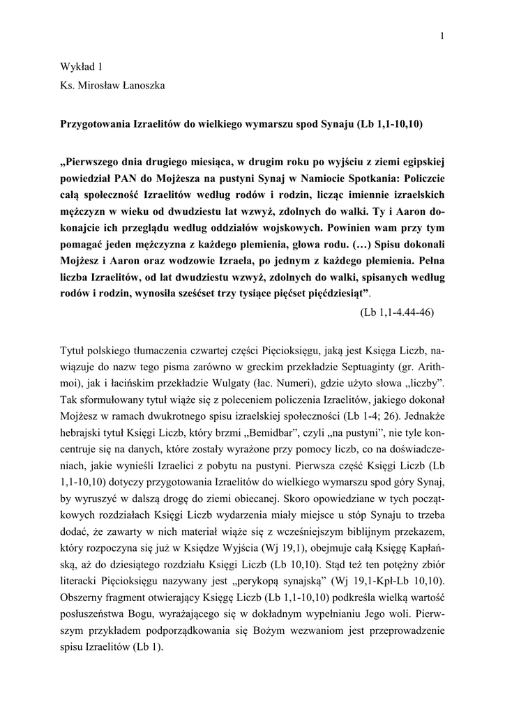 1 Wykład 1 Ks. Mirosław Łanoszka Przygotowania Izraelitów do wielkiego wymarszu spod Synaju (Lb 1,1-10,10) „Pierwszego dnia drugiego miesiąca, w drugim roku po wyjściu z ziemi egipskiej powiedział PAN do Mojżesza na pustyni Synaj w Namiocie Spotkania: Policzcie całą społeczność Izraelitów według rodów i rodzin, licząc imiennie izraelskich mężczyzn w wieku od dwudziestu lat wzwyż, zdolnych do walki. Ty i Aaron dokonajcie ich przeglądu według oddziałów wojskowych. Powinien wam przy tym pomagać jeden mężczyzna z każdego plemienia, głowa rodu. (…) Spisu dokonali Mojżesz i Aaron oraz wodzowie Izraela, po jednym z każdego plemienia. Pełna liczba Izraelitów, od lat dwudziestu wzwyż, zdolnych do walki, spisanych według rodów i rodzin, wynosiła sześćset trzy tysiące pięćset pięćdziesiąt”. (Lb 1,1-4.44-46) Tytuł polskiego tłumaczenia czwartej części Pięcioksięgu, jaką jest Księga Liczb, nawiązuje do nazw tego pisma zarówno w greckim przekładzie Septuaginty (gr. Arithmoi), jak i łacińskim przekładzie Wulgaty (łac. Numeri), gdzie użyto słowa „liczby”. Tak sformułowany tytuł wiąże się z poleceniem policzenia Izraelitów, jakiego dokonał Mojżesz w ramach dwukrotnego spisu izraelskiej społeczności (Lb 1-4; 26). Jednakże hebrajski tytuł Księgi Liczb, który brzmi „Bemidbar”, czyli „na pustyni”, nie tyle koncentruje się na danych, które zostały wyrażone przy pomocy liczb, co na doświadczeniach, jakie wynieśli Izraelici z pobytu na pustyni. Pierwsza część Księgi Liczb (Lb 1,1-10,10) dotyczy przygotowania Izraelitów do wielkiego wymarszu spod góry Synaj, by wyruszyć w dalszą drogę do ziemi obiecanej. Skoro opowiedziane w tych początkowych rozdziałach Księgi Liczb wydarzenia miały miejsce u stóp Synaju to trzeba dodać, że zawarty w nich materiał wiąże się z wcześniejszym biblijnym przekazem, który rozpoczyna się już w Księdze Wyjścia (Wj 19,1), obejmuje całą Księgę Kapłańską, aż do dziesiątego rozdziału Księgi Liczb (Lb 10,10). Stąd też ten potężny zbiór literacki Pięcioksięgu nazywany jest „perykopą synajską” (Wj 19,1-Kpł-Lb 10,10). Obszerny fragment otwierający Księgę Liczb (Lb 1,1-10,10) podkreśla wielką wartość posłuszeństwa Bogu, wyrażającego się w dokładnym wypełnianiu Jego woli. Pierwszym przykładem podporządkowania się Bożym wezwaniom jest przeprowadzenie spisu Izraelitów (Lb 1). 2 Izrael wciąż obozują na pustyni u stóp góry Synaj. Duchowe przygotowanie społeczności narodu Bożego wybrania w tym miejscu trwa już niemal rok. Pierwsze i najważniejsze słowa, jakie zostały przekazane w początkowych wersetach Księgi Liczb pochodzą od Boga, który „pierwszego dnia drugiego miesiąca, w drugim roku po wyjściu z ziemi egipskiej” (Lb 1,1) polecił Mojżeszowi policzyć „całą społeczność Izraelitów według rodów i rodzin, licząc imiennie izraelskich mężczyzn w wieku od dwudziestu lat wzwyż, zdolnych do walki” (Lb 1,2). Przeprowadzony spis wykazał, że liczba mężczyzn zdolnych do walki wynosiła 603 tysiące 550 osób. Taka ilość mężczyzn oznaczała, że populacja Izraelitów maszerujących przez pustynię do Kanaanu liczyłaby ponad dwa miliony, co jest raczej mało prawdopodobne. Pomijając różne próby wyjaśnienia danych liczbowych, jakie wynikały z przeprowadzonego spisu trzeba przyznać, że dostępny w tekście Księgi Liczb materiał nie pozwala rozwiązać tego problemu. Stąd też można przyjąć, że podane liczby zostały zwielokrotnione, by w ten sposób ukazać moc i potęgę, a tym samym wielkie znaczenie ludu zbliżającego się do granic Kanaanu. Tradycja rabiniczna zarówno w przeprowadzonych spisach, jak i w wielkiej liczebności narodu widziała przejaw ogromnej miłości Boga do swojego ludu, dla którego każda osoba jest niezwykle ważna, a znaczący wzrost izraelskiej społeczności postrzegano, jako owoc Bożego błogosławieństwa. Księga Liczb mówi, że Izraelici dokonując spisu zgodnie z otrzymanym od Boga poleceniem „spełnili wszystko, co PAN nakazał Mojżeszowi” (Lb 1,54). „Następnie PAN przemówił do Mojżesza i Aarona: Każdy spośród Izraelitów niech rozbije swój namiot przy znaku swojego rodu, wokół Namiotu Spotkania, w niewielkiej odległości od niego” (Lb 2,1-2) Postawa posłuszeństwa Bożej woli została także ukazana w tekście zawierającym polecenie, jakie otrzymali od Boga Mojżesz i Aaron odnośnie rozmieszczenia plemion izraelskich w obozie. W centralnym miejscu obozowiska znajdowało się święte mieszkanie, stanowiące znak zamieszkania Boga pośród swojego ludu, co odzwierciedlało najważniejszy temat tradycji kapłańskiej (P), z której właśnie pochodzi tekst dotyczący rozbicia i ustawienia w określonym porządku obozu wokół przenośnej świątyni. Zgodnie z teologią redaktora kapłańskiego Bóg pod Synajem zamieszkał na stałe w sanktuarium pośród swojego ludu. Dokument kapłański (P) stanowi wyznanie wiary w bezwarunkowe oddanie się Boga Izraelowi, gdyż nic nie jest w stanie zniweczyć Bożej miłości do wybranego narodu. Tak więc Bóg, którego nieustanną obecność wyrażało umieszczone w centralnym miejscu obozu święte mieszkanie, pragnie, by dwanaście 3 plemion Izraela obozowało wokół Namiotu Spotkania w określonym porządku. Warto w tym miejscu powiedzieć, że najbliższym sąsiedztwem przenośnej świątyni cieszyli się pochodzący z pokolenia Lewiego kapłani, którzy chronili to niezwykłe mieszkanie od strony wschodniej, czyli od wejścia do Namiotu Spotkania, natomiast reszta lewitów strzegła go z pozostałych stron. W pewnej odległości od świętego mieszkania, z czterech stron rozlokowane były pozostałe pokolenia Izraela, spośród których plemię Judy obozowało także od strony wschodniej, naprzeciw wejścia do Namiotu Spotkania. Uprzywilejowana pozycja kapłanów, potomków Aaro