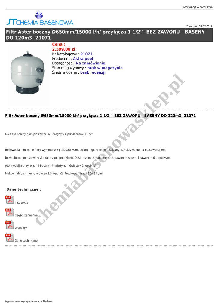 Informacje o produkcie Utworzono 08-03-2017 Filtr Aster boczny Ø650mm/15000 l/h/ przyłącza 1 1/2''- BEZ ZAWORU - BASENY DO 120m3 -21071 Cena : 2.599,00 zł kl ep .p l Nr katalogowy : 21071 Producent : Astralpool Dostępność : Na zamówienie Stan magazynowy : brak w magazynie Średnia ocena : brak recenzji no w Do filtra należy dokupić zawór 6 - drogowy z przyłaczami 1 1/2" as Filtr Aster boczny Ø650mm/15000 l/h/ przyłącza 1 1/2''- BEZ ZAWORU - BASENY DO 120m3 -21071 Beżowe, laminowane filtry wykonane z poliestru wzmacnianonego włóknem szklanym. Pokrywa górna mocowana jest se bezśrubowo; podstawa wykonana z polipropylenu. Dostarczana z manometrem, zaworem spustu i zaworem 6 drogowym ia ba (do modeli z przyłączami bocznymi należy zamówić zawór osobno) Maksymalne ciśnienie robocze 2,5 kg/cm2. Predkość filtracji 50m3/h/m2. ch Instrukcja em Dane techniczne : Części zamienne Wymiary Dane techniczne Wygenerowano w programie www.oscGold.com