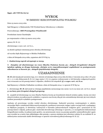 Sygn. akt VIII Ka 60/15 WYROK W IMIENIU RZECZYPOSPOLITEJ POLSKIEJ Dnia 23 marca 2015 roku Sąd Okręgowy w Białymstoku VIII Wydział Karny Odwoławczy w składzie: Przewodniczący SSO Przemysław Wasilewski Protokolant Aneta Chardziejko po rozpoznaniu w dniu 23 marca 2015 roku sprawy M. H. (1) obwinionego o czyn z art. 107 k.w., na skutek apelacji wniesionej przez obrońcę obwinionego od wyroku Sądu Rejonowego w Bielsku Podlaskim z dnia 26 listopada 2014 roku, sygnatura akt II W 85/14 I. Zaskarżony wyrok utrzymuje w mocy. II. Zasądza od obwinionego na rzecz Skarbu Państwa kwotę 30,- złotych (trzydzieści złotych) tytułem opłaty za drugą instancję, obciąża w/w zryczałtowanymi wydatkami za postępowanie odwoławcze w kwocie 50,- złotych (pięćdziesiąt złotych). UZASADNIENIE M. H. (1) stanął pod zarzutem tego, że w okresie od miesiąca lipca 2013 roku do dnia 17 stycznia 2014 roku w B. przy ul. (...), w celu dokuczenia R. B. (1) i jego matce I. B. (1), poprzez wykonywanie w ich kierunku wulgarnych gestów oraz wrzucanie na ich posesję śmieci i odpadów, złośliwie ich niepokoił, tj. o czyn z art. 107 k.w. Sąd Rejonowy w Bielsku Podlaskim wyrokiem z dnia 26 listopada 2014 r w sprawie II W 85/14: I. obwinionego M. H. (1) uznał za winnego popełnienia zarzuconego mu czynu i za to na mocy art. 107 k.w. skazał go na karę 300 (trzysta) złotych grzywny; II. zasądził od obwinionego na rzecz Skarbu Państwa kwotę 30 (trzydzieści) złotych tytułem opłaty, kwotę 100 (sto) złotych tytułem zryczałtowanych wydatków w sprawie oraz kwotę 189,36 (sto osiemdziesiąt dziewięć 36/100) złotych tytułem pozostałych wydatków postępowania. Apelację od powyższego wyroku wniósł obrońca obwinionego. Zaskarżył powyższe rozstrzygnięcie w całości, zarzucając błąd w ustaleniach faktycznych przyjętych z podstawę orzeczenia, mający wpływ na jego treść, a polegający na błędnym przyjęciu, iż obwiniony wykonywał w kierunku pokrzywdzonych wulgarne gest i przerzucał na ich posesję śmieci i odpady, podczas gdy z materiału dowodowego zebranego w sprawie, a w szczególności dokumentacji fotograficznej wynika, że pokazywanie gestów, czy przerzucanie rzeczy na posesję sąsiadów uniemożliwia płot i gęste oraz wysokie na 4 metry tuje oddzielające obie posesje, a sprawa niniejsza jest odwetem rodziny B. na rodzinie H. za niekorzystne zeznawanie matki obwinionego w sprawie rozwodowej pokrzywdzonego R. B. (1); Powołując się na powyższe wniósł o: -uniewinnienie obwinionego M. H. (1) od popełnienia zarzucanego mu wykroczenia; ewentualnie -uchylenie skarżonego orzeczenia i przekazanie sprawy Sądowi Rejonowemu do ponownego rozpoznania. Sąd Okręgowy zważył, co następuje: Apelacja obrońcy obwinionego, jako niezasadna, nie zasługuje na uwzględnienie. Sąd Okręgowy nie podzielił zarzutów oraz wywodów zawartych w środku zaskarżenia. Badając zasadność rozstrzygnięcia pierwszoinstancyjnego w oparciu o zebrany w sprawie materiał dowodowy Sąd Okręgowy nie dopatrzył się błędów w zakresie ustalonego stanu faktycznego. Analiza akt sprawy oraz uzasadnienia Sądu I instancji prowadzi do wniosku, że Sąd orzekający prawidłowo ustalił stan faktyczny, w oparciu o ujawnione w sprawie dowody, które w powiązaniu ze sobą należycie rozważył i wywiódł jedynie możliwe, logiczne wnioski, odnośnie zawinienia obwinionego w zakresie przypisanego mu czynu. Zaskarżony wyrok Sąd wyczerpująco uzasadnił, poddając całokształt ujawnionego w sprawie materiału dowodowego wnikliwej analizie, przeprowadzonej z uwzględnieniem zasad wiedzy, logiki i doświadczenia życiowego, co pozostaje w zgodzie z dyspozycją art. 7 k.p.k stosowanego w sprawach o wykroczeniach w oparciu o art. 8 k.p.w. Zgodnie z art. 107 k.w.: „Kto w celu dokuczenia innej osobie złośliwie wprowadza ją w błąd lub w inny sposób złośliwie niepokoi, podlega karze ograniczenia wolności, grzywny do 1.500 złotych albo karze nagany”. Przedmiotem ochrony opisanego wykroczenia jest spokój psychiczny człowieka, przeciwdziałanie frustracji, irytacji oraz innym formom dyskomfortu psychicznego. Strona przedmiotowa zakłada złośliwe wprowadzenie w błąd lub inne złośliwe niepokojenie, w celu dokuczenia pokrzywdzonemu. Znamię złośliwości oznacza szczególne nastawienie podmiotowe sprawcy przejawiające się w chęci dokuczenia, zrobienia przykrości, wyprowadzenia z równowagi (Bafia i in., Kodeks, s. 250; Bojarski, Radecki, Kodeks, s. 637; M. Mozgawa (w:) Mozgawa i in., Kodeks, s. 366). Inne złośliwe niepokojenie to wzbudzanie niepokoju, obawy, lęku. Niepokojenie może polegać na zakłóceniu spokoju lub innych zachowaniach wyprowadzających pokrzywdzonego z równowagi psychicznej, np. wysyłanie przykrych listów, głuche telefony, pukanie do drzwi i uciekanie. Niepokojenie może nastąpić słowem, czynem, gestem, wizerunkiem itd. Istotne w zachowaniu sprawcy jest to, że kieruje się on chęcią dokuczenia innej osobie, sprawienia jej przykrości, przysporzenia trosk i zmartwień. Pobudką działania sprawcy jest nieżyczliwość, bowiem chodzi o "dotknięcie" ofiary, wyprowadzenie jej z równowagi, spowodowanie zdenerwowania. Wykroczenie powyższe można popełnić tylko umyślnie w zamiarze bezpośrednim i kierunkowym, bowiem ustawodawca posługuje się sformułowaniem "w celu dokuczenia". W niniejszej sprawie treść zgromadzonych dowodów, w szczególności po części wyjaśnień obwinionego M. H., zeznań świadków R. B., I. B., materiału poglądowego świadczą z całą pewnością, że w/w wyczerpał znamiona wykroczenia z art. 107 k.w. Linia obrony w skardze apelacyjnej została oparta na tezie, że sposób konstrukcji płotu oddzielającego posesje stron, jak również wysokość i gęstość tui rosnących na granicy, uniemożliwiały zaobserwowanie przez pokrzywdzonych, kto w danym momencie znajduje się na posesji obwinionego, tym samy