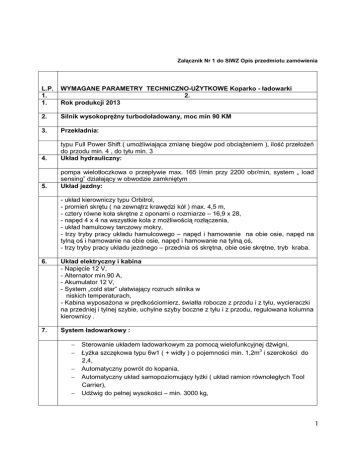 Załącznik Nr 1 do SIWZ Opis przedmiotu zamówienia L.P. 1. 1. WYMAGANE PARAMETRY TECHNICZNO-UśYTKOWE Koparko - ładowarki 2. Rok produkcji 2013 2. Silnik wysokopręŜny turbodoładowany, moc min 90 KM 3. Przekładnia: 4. typu Full Power Shift ( umoŜliwiająca zmianę biegów pod obciąŜeniem ), ilość przełoŜeń do przodu min. 4 , do tyłu min. 3 Układ hydrauliczny: 5. pompa wielotłoczkowa o przepływie max. 165 l/min przy 2200 obr/min, system „ load sensing” działający w obwodzie zamkniętym Układ jezdny: - układ kierowniczy typu Orbitrol, - promień skrętu ( na zewnątrz krawędzi kół ) max. 4,5 m, - cztery równe koła skrętne z oponami o rozmiarze – 16,9 x 28, - napęd 4 x 4 na wszystkie kola z moŜliwością rozłączenia, - układ hamulcowy tarczowy mokry, - trzy tryby pracy układu hamulcowego – napęd i hamowanie na obie osie, napęd na tylną oś i hamowanie na obie osie, napęd i hamowanie na tylną oś, - trzy tryby pracy układu jezdnego – przednia oś skrętna, obie osie skrętne, tryb kraba. 6. Układ elektryczny i kabina - Napięcie 12 V, - Alternator min.90 A, - Akumulator 12 V, - System „cold star” ułatwiający rozruch silnika w niskich temperaturach, - Kabina wyposaŜona w prędkościomierz, światła robocze z przodu i z tyłu, wycieraczki na przedniej i tylnej szybie, uchylne szyby boczne z tyłu i z przodu, regulowana kolumna kierownicy . 7. System ładowarkowy : − − − − − Sterowanie układem ładowarkowym za pomocą wielofunkcyjnej dźwigni, ŁyŜka szczękowa typu 6w1 ( + widły ) o pojemności min. 1,2m3 i szerokości do 2,4, Automatyczny powrót do kopania, Automatyczny układ samopoziomujący łyŜki ( układ ramion równoległych Tool Carrier), Udźwig do pełnej wysokości – min. 3000 kg, 1 8. Układ koparkowy : − − − − − − − − 9. 10. Ramię w kształcie „banan” z wysuwem teleskopowym, ŁyŜka o szerokości 0,60 m do 0,65 m, Głębokość kopania min. 5600 mm, Zasięg na poziomie gruntu min. 6800, Wysokość załadunku min. 4750 mm, Siła odspajania łyŜki – min. 6400 daN, Udźwig na maksymalnym zasięgu bez wysuwu min. 2100 kg, Udźwig na maksymalnym wysięgu z wysuwem min. 1440 kg. WyposaŜenie obowiązkowe : − System „Cold Start” ( ułatwiający rozruch maszyny przy ujemnych temperaturach), − System „Glide Ride” ( amortyzacja ruchu ramienia ładowarkowego ), − Osie z dyferencjałem o ograniczonym poślizgu LSD, − Zamki hydrauliczne na stabilizatorach, − Hydrauliczna blokada ramienia koparkowego, − Maska zintegrowana z osłonami bocznymi silnika, podnoszona w całości, − ŁyŜki koparkowe : 60-65 cm , do 35 cm i łyŜka skarpówka 150 cm, − Lampa ostrzegawcza (kogut), skrzynka narzędziowa, instrukcja obsługi w języku polskim, trójkąt ostrzegawczy SERWIS Co najmniej jeden punkt serwisowy realizujący dostawy części oraz obsługę pogwarancyjną oddalony od miejsca garaŜowania koparki do 100 km Wykonawca na dostarczony pojazd udzieli minimum 12 Podać adres (y) punktu (ów) serwisowych** miesięcznej gwarancji od daty protokolarnego odbioru przedmiotu umowy przez strony bez uwag Gwarantowane szkolenie operatorów w zakresie podstawowej obsługi koparko – ładowarki w cenie dostawy – część teoretyczna i praktyczna u Zamawiającego. 2 L.P. 1 1 2 3 4 5 6 7 9 WYMAGANE PARAMETRY TECHNICZNO-UśYTKOWE CIĄGNIKA 2 Ciągnik rolniczy z kabiną w pełni przeszkloną , fabrycznie nowy rok produkcji 2013 – szt.1. Układ kierowniczy ze wspomaganiem Instalacja hamulcowa pneumatyczna z rozdzielaczem , jedno i dwuprzewodowa Instalacja do hamulców przyczepy Pełno ramowa konstrukcja SILNIK 6 cylindrów Pojemność 6,8 dm3 System wtrysku : Common Rail Paliwo – zatwierdzona mieszanka Biodiesel : B20 Moc znamionowa (97/68 EC): 110kW/150 KM Moc maksymalna ( 97/68EC) : 116 kW/158KM Maksymalny moment obrotowy :677 Nm przy 1500 obr/min Zapas momentu obrotowego : 35% Zbiornik paliwa 350 l Wymiana filtra i oleju silnika co 250 h NAPĘD POWRQUAD PLUS 20/20 - 40KM/H 4 biegi zmieniane pod obciąŜeniem Liczba przełoŜeń ( do przodu x wstecz) :20x20 ( 40 km/h) Sterowanie elektrohydrauliczne NAPĘD WOM Sprzęgło wielotarczowe : niezaleŜne Automatyczny Obroty 540/540E/1000 na minutę Selekcja prędkości z kabiny PRZEDNIA OŚ Oś amortyzowana z napędem MFWD z TLS Oś Przednia Kąt Skrętu 52 Stopni Zwolnice planetarne TYLNA OŚ Blokowanie mechanizmu róŜnicowego sterowane elektrohydraulicznie Hamulce tylnej osi PowerFill chłodzone olejem Hamulec ręczny wielotarczowy + blokada parkingowa HYDRAULIKA Kompensacja przepływu i ciśnienia (PFC) Wydatek układu hydraulicznego 114 l/min Maksymalne ciśnienie : 190 bar 3 pary wyjść hydraulicznych Szybkosprzęgi Maksymalny udźwig podnośnika na hakach : 7400 kg Zewnętrzne sterowanie TUZ i WOM na błotniku KABINA Wyciszona, komfortowa Klimatyzacja 3 10 11 12 Wycieraczka + spryskiwacz przedniej i tylnej szyby 10 świateł roboczych Fotel z amortyzacja pneumatyczną i pasem bezpieczeństwa Siedzisko dla instruktora z pasem bezpieczeństwa Radio z odtwarzaczem MP3 i interfejsem Bluetooh (zestaw głośnomówiący) Hałas – 72 dB WYPOSAśENIE Pneumatyczny system sterowania hamulcami przyczep Instrukcja – drukowana - w języku polskim Regulowany zaczep transportowy Dolny zaczep rolniczy Kierunkowskazy Akumulator 174 Ah Ogrzewacz powietrza wlotowego i klimatyzacja Błotniki kół przednich Tylne błotniki pełne z poszerzeniem Lampa błyskowa tzw. „kogut” kolor pomarańczowy Min. dwa komplety kluczyków do pojazdu. Opony radialne (Wszystkie opony w chwili odbioru nie mogą być starsze niŜ 12 miesięcy.) Przedni podnośnik TUZ – udźwig 4500 kg Przedni WOM – 1000 obr/min Certyfikat CE, świadectwo homologacji. WYMIARY I MASA Minimalna masa pojazdu od 5930 kg Długość całkowita od wspornika przedniego do tylnego układu zawieszenia narzędzia : od 4870 mm do 5122 mm Szerokość minimalna : 2490 mm SERWIS Co najmniej jeden 