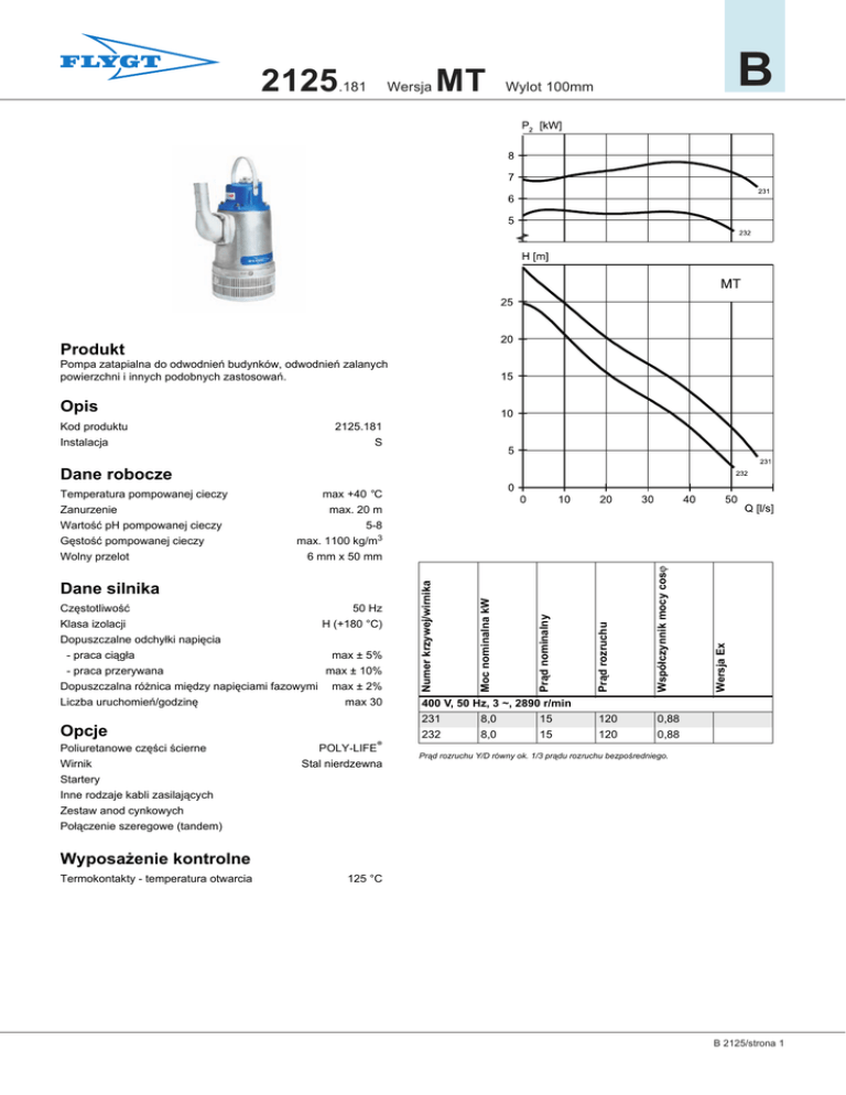 2125.181 Wersja MT B Wylot 100mm Produkt Pompa zatapialna do odwodnień budynków, odwodnień zalanych powierzchni i innych podobnych zastosowań. Opis Kod produktu Instalacja 2125.181 S Dane robocze max +40 °C Dopuszczalne odchyłki napięcia - praca ciągła max ± 5% max ± 10% - praca przerywana Dopuszczalna różnica między napięciami fazowymi Liczba uruchomień/godzinę Opcje Poliuretanowe części ścierne Wirnik max ± 2% max 30 POLY-LIFE® Stal nierdzewna 120 120 0,88 0,88 Wersja Ex H (+180 °C) Współczynnik mocy cosϕ 50 Hz Klasa izolacji Prąd rozruchu Częstotliwość Prąd nominalny Dane silnika Moc nominalna kW max. 20 m 5-8 max. 1100 kg/m3 6 mm x 50 mm Numer krzywej/wirnika Temperatura pompowanej cieczy Zanurzenie Wartość pH pompowanej cieczy Gęstość pompowanej cieczy Wolny przelot 400 V, 50 Hz, 3 ~, 2890 r/min 231 232 8,0 8,0 15 15 Prąd rozruchu Y/D równy ok. 1/3 prądu rozruchu bezpośredniego. Startery Inne rodzaje kabli zasilających Zestaw anod cynkowych Połączenie szeregowe (tandem) Wyposażenie kontrolne Termokontakty - temperatura otwarcia 125 °C B 2125/strona 1 B 2125.181 Wersja MT Wylot 100mm Materiały Wirnik Części ścierne Obudowa silnika Kosz ssawny Wał O-ringi Żeliwo wysokochromowe Guma nitrylowa Aluminium Stal ocynkowana Stal nierdzewna Guma nitrylowa Kable Rozruch bezpośredni SUBCAB® Uszczelnienia mechaniczne Alternatywa Uszczelnienie wewn. Uszczelnienie zewn. 1 Odporny na korozję węglik wolframu/ Odporny na korozję węglik wolframu 4G2,5 mm2 4G4 mm2 4G4+2x1,5 mm2 4G6 mm2 4G10 mm2 Rozruch Y/D SUBCAB® Odporny na korozję węglik wolframu/ Odporny na korozję węglik wolframu 7G2,5+2x1,5 mm2 7G4+2x1,5 mm2 7G4+2x1,5 mm2 BS Wymiary w mm Masa pompy - 77 kg (pompa bez kabla) BS BS BS BS Wymiary w mm Masa pompy - 77 kg (pompa bez kabla) Wymiary w mm Masa pompy - 77 kg (pompa bez kabla) BS Wymiary w mm Masa pompy - 77 kg (pompa bez kabla) POŁĄCZENIE TANDEM BS Wymiary w mm Masa pompy - 77 kg (pompa bez kabla) POŁĄCZENIE TANDEM B 2125/strona 2 Wymiary w mm Masa pompy - 80 kg (pompa bez kabla) Wymiary w mm Masa pompy - 77 kg (pompa bez kabla) BS Wymiary w mm Masa pompy - 77 kg (pompa bez kabla) POŁĄCZENIE TANDEM 2125.220 Wersja MT B Wylot 100mm P2 [kW] 9.0 8.5 8.0 7.5 7.0 231 H [m] MT 25 20 Produkt Pompa zatapialna do odwodnień budynków, odwodnień zalanych powierzchni i innych podobnych zastosowań. 15 Opis 10 Kod produktu Instalacja 2125.220 S 5 231 Dopuszczalne odchyłki napięcia - praca ciągła max ± 5% max ± 10% - praca przerywana Dopuszczalna różnica między napięciami fazowymi Opcje Poliuretanowe części ścierne max ± 2% max 30 30 40 120 0,88 50 Q [l/s] 400 V, 50 Hz, 3 ~, 2880 r/min 231 POLY-LIFE® 20 Wersja Ex H (+180 °C) 10 Współczynnik mocy cosϕ 50 Hz Klasa izolacji 0 Prąd rozruchu Częstotliwość Moc nominalna kW max. 20 m 5-8 max. 1100 kg/m3 6 mm x 50 mm Dane silnika Liczba uruchomień/godzinę 0 max +40 °C Numer krzywej/wirnika Temperatura pompowanej cieczy Zanurzenie Wartość pH pompowanej cieczy Gęstość pompowanej cieczy Wolny przelot Prąd nominalny Dane robocze 8,0 15 Prąd rozruchu Y/D równy ok. 1/3 prądu rozruchu bezpośredniego. Startery Inne rodzaje kabli zasilających Zestaw anod cynkowych Połączenie szeregowe (tandem) Wyposażenie kontrolne Termokontakty - temperatura otwarcia 125 °C B 2125/strona 1 B 2125.220 Wersja MT Wylot 100mm Materiały Wirnik Części ścierne Obudowa silnika Kosz ssawny Wał O-ringi Żeliwo wysokochromowe Guma nitrylowa Aluminium Stal ocynkowana Stal nierdzewna Guma nitrylowa Kable Rozruch bezpośredni SUBCAB® 4G2,5 mm2 4G4 mm2 4G4+2x1,5 mm2 4G6 mm2 4G10 mm2 Rozruch Y/D SUBCAB® 7G2,5+2x1,5 mm2 7G4+2x1,5 mm2 7G4+2x1,5 mm2 BS Wymiary w mm Masa pompy - 93 kg (pompa bez kabla) POŁĄCZENIE TANDEM B 2125/strona 2 Uszczelnienia mechaniczne Alternatywa Uszczelnienie wewn. Uszczelnienie zewn. 1 Odporny na korozję węglik wolframu/ Odporny na korozję węglik wolframu Odporny na korozję węglik wolframu/ Odporny na korozję węglik wolframu 2125.320/690 Wersja MT B Wylot 100mm Produkt Pompa zatapialna do odwodnień budynków, odwodnień zalanych powierzchni i innych podobnych zastosowań. Opis Kod produktu Instalacja 2125.320 S Dane robocze Temperatura pompowanej cieczy Zanurzenie Wartość pH pompowanej cieczy Gęstość pompowanej cieczy Wolny przelot max +40 °C - praca ciągła max ± 5% max ± 10% - praca przerywana Dopuszczalna różnica między napięciami fazowymi Liczba uruchomień/godzinę Opcje 2125.690 max ± 2% max 30 Poliuretanowe części ścierne Wirnik (wersja 690) 0,88 400 V, 50 Hz, 3 ~, 2880 r/min 231 Wyk. przeciwwybuchowe Ex 120 Wersja Ex Dopuszczalne odchyłki napięcia Współczynnik mocy cosϕ H (+180 °C) Prąd rozruchu 50 Hz Klasa izolacji Prąd nominalny Częstotliwość Moc nominalna kW Dane silnika Numer krzywej/wirnika max. 20 m 6-13 max. 1100 kg/m3 6 mm x 50 mm 8,0 15 • Prąd rozruchu Y/D równy ok. 1/3 prądu rozruchu bezpośredniego. POLY-LIFE® Stal nierdzewna Startery Inne rodzaje kabli zasilających Zestaw anod cynkowych Połączenie szeregowe (tandem) Kosz ssawny Stal nierdzewna Wyposażenie kontrolne Termokontakty - temperatura otwarcia 125 °C B 2125/strona 1 B 2125.320/690 Wersja MT Wylot 100mm Materiały Wirnik Części ścierne Obudowa silnika Kosz ssawny Wał O-ringi Żeliwo wysokochromowe Guma nitrylowa Żeliwo Stal ocynkowana Stal nierdzewna Guma nitrylowa Kable Rozruch bezpośredni SUBCAB® Rozruch Y/D SUBCAB® BS Wymiary w mm Masa pompy - 150 kg (pompa bez kabla) B 2125/strona 2 4G2,5 mm2 4G4 mm2 4G4+2x1,5 mm2 4G6 mm2 4G10 mm2 7G2,5+2x1,5 mm2 7G4+2x1,5 mm2 7G4+2x1,5 mm2 Uszczelnienia mechaniczne Alternatywa Uszczelnienie wewn. Uszczelnienie zewn. 1 Odporny na korozję węglik wolframu/ Odporny na korozję węglik wolframu Odporny na korozję węglik wolframu/ Odporny na korozję węglik wolframu