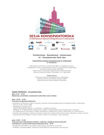 SESJA KONSERWATORSKA w Państwowym Muzeum Etnograficznym w Warszawie Transformacja – Rewitalizacja – Konserwacja 19 – 20 października 2016 roku PAŃSTWOWE MUZEUM ETNOGRAFICZNE W WARSZAWIE ul. Kredytowa 1 Patronatem honorowym konferencję objęli: dr Magdalena Gawin, Podsekretarz Stanu w Ministerstwie Kultury i Dziedzictwa Narodowego, Generalny Konserwator Zabytków, Adam Struzik, Marszałek Województwa Mazowieckiego, Hanna Gronkiewicz-Waltz, Prezydent m. st. Warszawy Organizatorzy: Państwowe Muzeum Etnograficzne w Warszawie Stowarzyszenie Architektów Polskich SARP Stowarzyszenie Konserwatorów Zabytków DZIEŃ PIERWSZY, 19 października godz. 9.30 – 10.30 Rejestracja uczestników: przekazanie materiałów, kawa, herbata godz. 10.30 – 12.00 Uroczysta inauguracja konferencji •P owitanie uczestników: Adam Czyżewski, Dyrektor Państwowego Muzeum Etnograficznego w Warszawie, Mariusz Ścisło, Prezes SARP • Wystąpienia inauguracyjne: JERZY UŚCINOWICZ/ Sacrum vs. profanum - problem konwersji ANDRZEJ M. CHOŁDZYŃSKI/ Użyteczność wartości fenomenologicznych filozofii Max’a Schellera we współczesnych staraniach o jakość architektury, dziedzictwa i kultury materialnej. O ‚’Grand Oeuvre • Wykład wprowadzający: Barbara Jezierska, Mazowiecki Wojewódzki Konserwator Zabytków/ System ochrony dziedzictwa kulturowego w świetle nowych ustaw o rewitalizacji i reprywatyzacji godz. 10.50 – 15.30 Część pierwsza/ Najciekawsze projekty, realizacje i adaptacje konserwatorskie. Architektura w ścisłej strefie konserwatorskiej 2012 – 2016 • BOLESŁAW STELMACH/ Architektura demokracji. Rozbudowa Sejmu RP. • ANDRZEJ SCHMALENBERG, MATEUSZ ŚWIĘTORZECKI/ Rewitalizacja Hali Koszyki •D ARIUSZ HYC/ Przestrzeń publiczna Śródmieścia w miejscowym planie zagospodarowania rejonu Ściany Wschodniej • DANUTA WŁODARSKA, ARKADIUSZ BOGUSŁAWSKI/ Księży Młyn w Łodzi. Rewitalizacja z szacunkiem dla twórcy miejsca • TOMASZ STĘPIEŃ/ Nowoczesne zaprawy drenażowe Sopro do montażu okładzin ceramicznych i kamiennych • KRZYSZTOF PYKEL, SZYMON WOJCIECHOWSKI/ Port Praski. Powrót do pierwotnych założeń architektonicznych w kontekście nowych funkcji • ANNA GRUBIAK, KONRAD GRABOWSKI/ Beton w rzeźbie i architekturze. Teoria i praktyka konserwatorska • Prowadzenie i podsumowanie/ MAŁGORZATA PILINKIEWICZ I RYSZARD JURKOWSKI godz. 15.30 – 16.30/ Przerwa, obiad godz. 16.30 – 20.00 Część druga/ Najciekawsze projekty, realizacje i adaptacje konserwatorskie. Architektura w ścisłej strefie konserwatorskiej 2012 – 2016 • KRZYSZTOF DURZYŃSKI/ Kreowanie przestrzeni miejskiej za pomocą nowoczesnych systemów oświetleniowych • MIROSŁAW NIZIO/ Projekt rewitalizacji Młynów Rothera w Bydgoszczy i koncepcje rewitalizacji zdegradowanych obszarów miast. Od badań społecznych do wypracowania kompleksowego projektu rewitalizacji przestrzeni miejskiej • DANUTA FREDOWICZ/ Pawilon Józefa Czapskiego – kontekst przestrzeni Starego Krakowa • JACEK STUDZIŃSKI/ Rewitalizacja warszawskiego śródmieścia i Pragi • PRZEMO ŁUKASIK/ Trudne miejsce. Opowieść o przekształcaniu się okolic Katowickiego Spodka • Prowadzenie i podsumowanie/ BOLESŁAW STELMACH I WŁODZIMIERZ MUCHA. Dyskusja godz. 20.00 •S potkanie z autorką książki/ LIDIA PAŃKÓW/ „Bloki w słońcu. Mała historia Ursynowa Północnego”, Wydawnictwo Czarne, Wołowiec, 2016 DZIEŃ DRUGI, 20 października godz. 9.30 – 12.30 Część pierwsza: Rewitalizacja z perspektywy historyka sztuki, prawnika, inwestora •J AKUB LEWICKI/ W poszukiwaniu kompromisu: Ocena wartości zabytkowej zabudowy dawnej Stoczni Gdańskiej jako podstawa ochrony dziedzictwa kulturowego i rozwoju Młodego Miasta nowej dzielnicy Gdańska •W OJCIECH BARTKOWICZ, MICHAŁ SOCHA/ Szlifowanie diamentu – rola warsztatów architektonicznych w kształtowaniu koncepcji biblioteki Wyższego Metropolitalnego Seminarium Duchownego na Skarpie Warszawskiej • MAKSYMILIAN CHERKA/ Zabytki a dobra kultury współczesnej – perspektywa prawna • GRZEGORZ OGIERMAN/ Szkło – transformacja z sukcesem • Podsumowanie i dyskusja godz. 12.30 – 14.30 Część druga: Pokonferencyjny panel SARP/ część I • MARIUSZ ŚCISŁO/ Wprowadzenie • TOMASZ WYSOCKI/ Funkcja użytkowa w obiektach zabytkowych wobec współczesnych potrzeb inwestycyjnych. Postulaty do procedur postępowania w procesach transformacji, rewitalizacji, rewaloryzacji • WOJCIECH GWIZDAK/ Polityka społeczna a transformacja, rewitalizacja, rewaloryzacja • PHUNG HUNG/ Conservation and revitalization of Hue monuments • MAREK BARAŃSKI/ Porzucona świątynia. Konserwacja czy rewitalizacja • JEREMI KRÓLIKOWSKI/ Miasta ogrody – rewitalizacja przyszłości • Podsumowanie i dyskusja godz. 14.30 – 15.30 Przerwa, obiad godz. 15.30 – 17.30 Część trzecia: Pokonferencyjny panel SARP/ część II PANEL DYSKUSYJNY/ uczestnicy panelu, goście konferencji oraz zaproszeni przedstawiciele Ministerstwa Infrastruktury i Budownictwa oraz Ministerstwa Kultury i Dziedzictwa Narodowego