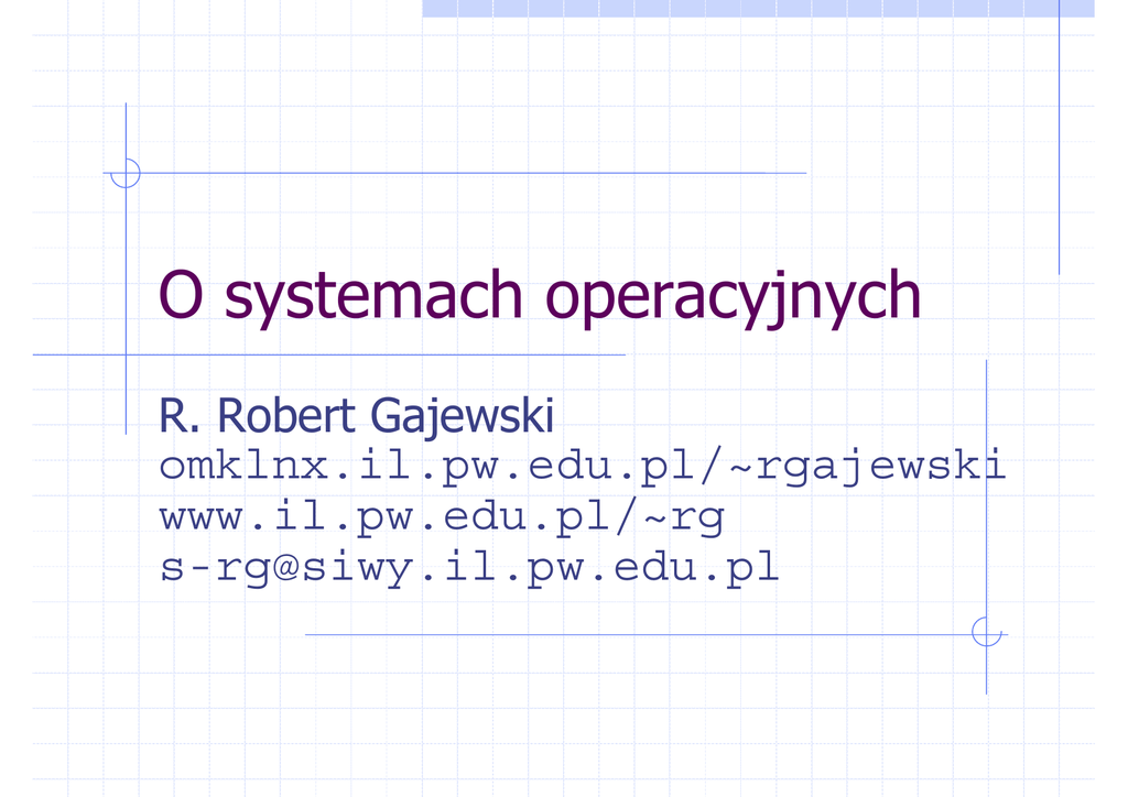 O systemach operacyjnych R. Robert Gajewski omklnx.il.pw.edu.pl/~rgajewski www.il.pw.edu.pl/~rg [email protected] CP/M Zdecydowanym standardem światowym wśród komputerów 8_bitowych był i jest system operacyjny CP/M (Control Program for Microprocessors) opracowany w 1973 przez firmę Intel. ! Może on współpracować z pamięcią RAM do 16kB!!! Łatwy do zaadaptowania dla wielu typów i konfiguracji mikrokomputerów dzięki modułowi BIOS (Basic Input/Output System). Składa się z 3 grup programów: ! ! ! 2•09 startu i wznowienia działania (restartu) systemu, transmisji pojedynczego znaku, wejścia i wyjścia dyskowego. © 2004, R. Robert Gajewski Miłe złego poczatki CCP (Console Command Processing) zapewnia łączność operatora z systemem operacyjnym. Umożliwia on czytanie, interpretację i wykonywanie dyrektyw systemu oraz ładowanie i wykonywanie programów użytkowych. W systemie CP/M wyróżnia się dwa typy dyrektyw: ! ! 3•09 rezydentne, znajdujące się w rezydentnej części systemu operacyjnego, wykonywane bez odwołania się do dysku, nierezydentne, wykonywanie których wymaga odwołania się do dyskietki. © 2004, R. Robert Gajewski Wzorzec DOS’u Sterowanie plikami jest niezależne od fizycznych urządzeń wejścia/wyjścia i jest zgrupowane w BDOS (Basic Disc Operating System) umożliwiającym zarządzanie zasobami dyskowymi poprzez dynamiczne rozmieszczenie plików i organizację dostępu do nich. Pamięć operacyjna RAM podzielona jest na następujące obszary ! ! ! ! 4•09 obszar obszar BDOS, obszar obszar podstawowego systemy wejścia/wyjścia BIOS, zajęty przez podstawowy system dyskowy przetwarzania dyrektyw operatora CCP, TPA (Transient Program Area) dla programów. © 2004, R. Robert Gajewski Projekt DOS’u CP/M stanowił wzorzec dla systemu DOS. DOS został zaprojektowany do prostej i podstawowej obsługi mikrokomputera z jednym miejscem pracy, na którym w danej chwili pracuje zawsze jeden program. ! ! 5•09 program ten jest przyporządkowany jednemu użytkownikowi (single user), który przetwarza zawsze jedno zadanie (single task). © 2004, R. Robert Gajewski Struktura DOS’u DOS nieco rozrzutnie udostępnia całe zasoby mikrokomputera jednemu użytkownikowi, ale dzięki temu ma prosta i nieskomplikowaną budowę. ! ! ! 6•09 Do wprowadzania poleceń służy prosty system obsługi (shell). Niektórzy twierdzą, że DOS nie jest „prawdziwym” systemem operacyjnym tylko systemem ładowania i uruchamiania programów. Według nich system operacyjny zaczyna się tam, gdzie pojawia się „walka” procesów o zasoby. © 2004, R. Robert Gajewski Proces i środowisko Proces jest obiektem dynamicznym składającym się z: ! ! programu, określającego ciąg wykonywanych instrukcji otoczenia, zbioru obiektów (zasobów) dostępnych dla procesu zarówno fizycznie (PAO) jak i logicznie (pliki, urządzenia). Środowisko to część otoczenia, zbiór symboli i przypisanych im tekstów, którymi są najczęściej nazwy plików i katalogów. W systemie DOS w każdej chwili aktywny jest dokładnie tylko jeden proces zabiegający o czas i zasoby procesora. 7•09 © 2004, R. Robert Gajewski Środowisko DOS’u DOS musi pracować na sprzęcie wyposażonym w procesor Intela 80*86 o podobnej do wzorcowej architekturze. ! Istniejące rozwiązania tego problemu to sprzętowe bądź programowe emulatory symulujące architekturę i środowisko IBM PC. Siłą DOS’u jest olbrzymia ilość oprogramowania. 8•09 © 2004, R. Robert Gajewski OS/2 - podstawy OS/2 (Operating System 2) przeznaczony był przede wszystkim dla nowej serii mikrokomputerów PS/2 (Personal System 2) firmy IBM. Najważniejsze cechy to: ! możliwość wykonywania jednocześnie wielu aplikacji, ! zgodność ze standardowymi aplikacjami DOS’u. Oprócz możliwości dzielenia czasu system oferuje możliwość pracy równoległej przez mechanizm wątków (threat). 9•09 © 2004, R. Robert Gajewski OS/2 - wieloprogramowość OS/2 - równoczesne uruchamianie wielu programów. ! ! ! 10•09 Zadanie podzielone na podzadania - procesy (process, task). Zegar systemu przerywa w jednakowych odcinkach czasu działanie CPU i oblicza nowe priorytety tak, by wznowione zostało przetwarzanie następnego procesu z listy procesów oczekujących. Każdy proces otrzymuje jednostkę czasu CPU, tylko wtedy wykonuje się. © 2004, R. Robert Gajewski OS/2 - komunikacja OS/2 jest znacznie lepiej przygotowany do komunikacji między komputerami niż DOS. Zadanie to realizuje podsystem LAN-Manager (Local Area Network). Niestety nie jest w nim zapewniona przezroczystość sieci ani bezpieczeństwo danych. 11•09 © 2004, R. Robert Gajewski OS/2 - pliki System organizacji plików HPFS (High Performance File System) przypominający system plików UNIX’a oznacza się dużą szybkością - zastąpił znany z DOS’u FAT. Komunikację z użytkownikiem zapewnia podsystem PM (Presentation Manager), standardowa graficzna platforma użytkownika. Pracę z systemem ułatwia podobny do hipertekstu system podpowiedzi IPF (Information Prresentation Facility). 12•09 © 2004, R. Robert Gajewski UNIX (Linux) UNIX (Linux) jest systemem operacyjnym: ! wielodostępnym (Multi User) ! wielozadaniowym (Multi Tasking) Na tej samej maszynie, w tym samym czasie może pracować wielu użytkowników dzieląc zasoby komputera. Daje to obniżenie kosztów eksploatacji i optymalne wykorzystanie. 13•09 © 2004, R. Robert Gajewski Windows 1.0/2.0 Zapowiadany na 1983 rok system pojawił się w listopadzie 1985 w wersji 1.0, a w grudniu 1989 w wersji 2.0. Okna miały tę sama wielkość i nie mogły na siebie zachodzić. W wersji 2.1 dodano opcję dynamicznej wymiany danych (Dynamic Data Exchange) – DDE 14•09 © 2004, R. Robert Gajewski Windows 3.0 System narodził się w maju 1990. Usprawniono mechanizmy posługiwania się oknami. Praca z plikami odbywa się w sposób graficzny. System potrafi współpracować z siecią. 15•09 © 2004, R. R