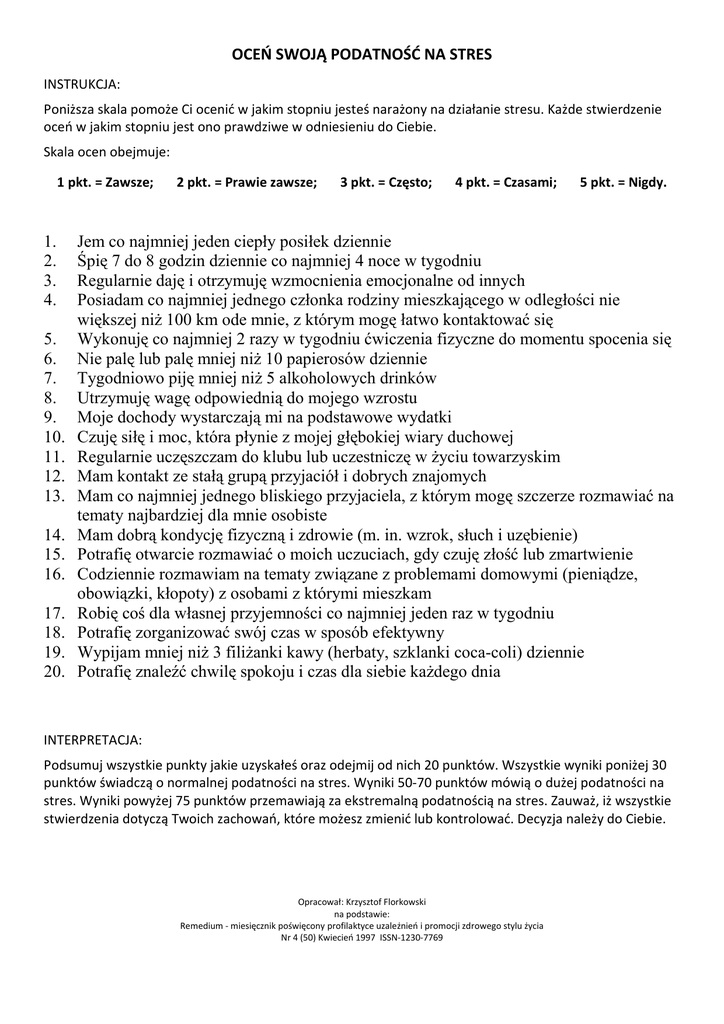 OCEŃ SWOJĄ PODATNOŚĆ NA STRES INSTRUKCJA: Poniższa skala pomoże Ci ocenić w jakim stopniu jesteś narażony na działanie stresu. Każde stwierdzenie oceń w jakim stopniu jest ono prawdziwe w odniesieniu do Ciebie. Skala ocen obejmuje: 1 pkt. = Zawsze; 1. 2. 3. 4. 5. 6. 7. 8. 9. 10. 11. 12. 13. 14. 15. 16. 17. 18. 19. 20. 2 pkt. = Prawie zawsze; 3 pkt. = Często; 4 pkt. = Czasami; 5 pkt. = Nigdy. Jem co najmniej jeden ciepły posiłek dziennie Śpię 7 do 8 godzin dziennie co najmniej 4 noce w tygodniu Regularnie daję i otrzymuję wzmocnienia emocjonalne od innych Posiadam co najmniej jednego członka rodziny mieszkającego w odległości nie większej niŜ 100 km ode mnie, z którym mogę łatwo kontaktować się Wykonuję co najmniej 2 razy w tygodniu ćwiczenia fizyczne do momentu spocenia się Nie palę lub palę mniej niŜ 10 papierosów dziennie Tygodniowo piję mniej niŜ 5 alkoholowych drinków Utrzymuję wagę odpowiednią do mojego wzrostu Moje dochody wystarczają mi na podstawowe wydatki Czuję siłę i moc, która płynie z mojej głębokiej wiary duchowej Regularnie uczęszczam do klubu lub uczestniczę w Ŝyciu towarzyskim Mam kontakt ze stałą grupą przyjaciół i dobrych znajomych Mam co najmniej jednego bliskiego przyjaciela, z którym mogę szczerze rozmawiać na tematy najbardziej dla mnie osobiste Mam dobrą kondycję fizyczną i zdrowie (m. in. wzrok, słuch i uzębienie) Potrafię otwarcie rozmawiać o moich uczuciach, gdy czuję złość lub zmartwienie Codziennie rozmawiam na tematy związane z problemami domowymi (pieniądze, obowiązki, kłopoty) z osobami z którymi mieszkam Robię coś dla własnej przyjemności co najmniej jeden raz w tygodniu Potrafię zorganizować swój czas w sposób efektywny Wypijam mniej niŜ 3 filiŜanki kawy (herbaty, szklanki coca-coli) dziennie Potrafię znaleźć chwilę spokoju i czas dla siebie kaŜdego dnia INTERPRETACJA: Podsumuj wszystkie punkty jakie uzyskałeś oraz odejmij od nich 20 punktów. Wszystkie wyniki poniżej 30 punktów świadczą o normalnej podatności na stres. Wyniki 50-70 punktów mówią o dużej podatności na stres. Wyniki powyżej 75 punktów przemawiają za ekstremalną podatnością na stres. Zauważ, iż wszystkie stwierdzenia dotyczą Twoich zachowań, które możesz zmienić lub kontrolować. Decyzja należy do Ciebie. Opracował: Krzysztof Florkowski na podstawie: Remedium - miesięcznik poświęcony profilaktyce uzależnień i promocji zdrowego stylu życia Nr 4 (50) Kwiecień 1997 ISSN-1230-7769