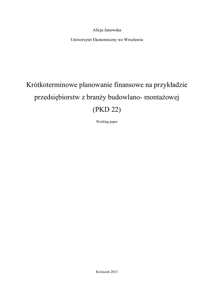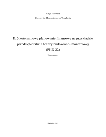 Alicja Janowska Uniwersytet Ekonomiczny we Wrocławiu Krótkoterminowe planowanie finansowe na przykładzie przedsiębiorstw z branży budowlano- montażowej (PKD 22) Working paper Kwiecień 2013 1. Wstęp Planowanie finansowe jest niezbędnym instrumentem w podejmowaniu decyzji każdego przedsiębiorstwa. Ze względu na czas możemy podzielić je na długoterminowe i krótkoterminowe. W głównej mierze planowanie krótkoterminowe dotyczy bieżącej sytuacji przedsiębiorstwa opartej na szczegółowych danych tygodniowych, miesięcznych czy kwartalnych. W niniejszej pracy zastosujemy pewne metody w celu dokonania krótkoterminowego planowania finansów przedsiębiorstwa z branży budowlano- montażowej. 2. Teoretyczny opis zastosowanej metodyki W celu zaprezentowania planu krótkoterminowego dla przedsiębiorstwa „X” z branży budowalno-montażowej zastosowano różne strategie zarządzania środkami pieniężnymi tj: model Berenka, Baumola oraz Millera-Orra. Dla oceny przyszłego zapotrzebowania na środki pieniężne użyty został preliminarz środków pieniężnych. 3. Przykład praktyczny z zastosowaniem danych rzeczywistych przedsiębiorstwa zawartych w Monitorze Polskim B Korzystając z rzeczywistych danych zamieszczonych w bazie danych Monitor Polski B przeprowadzono dla wybranego przedsiębiorstwa z branży budowlano-montażowej krótkoterminowe planowanie finansów. 3.1 Zarządzanie środkami pieniężnymi Z uwagi na dużą sezonowość branży budowlano-montażowej należy przyjąć poniższe założenia: 1. styczeń-kwiecień – wypływy przewyższają wpływy (okres stagnacji w branży) 2. maj-wrzesień – wpływy przewyższają wypływy ( okres wysokiej aktywności w branży) 3. październik-grudzień – wpływy zbliżone poziomem wypływom W związku z takim podziałem miesięcznych wpływów i wydatków prezentowanego przedsiębiorstwa należy rozważy skorzystanie z trzech różnych modeli dla trzech różnych okresów działalności przedsiębiorstwa. W przypadku okresu 1 zostanie zastosowany model Baumola jest to klasyczny model zarządzania środkami pieniężnymi stosowany w sytuacji gdy wypływy przewyższają wpływy, kryterium to w zostało spełnione w przypadku prezentowanego przedsiębiorstwa.1 Tabela 1 Założenia dla modelu DANE ( w tyś zł.) Zapotrzebowanie na środki pieniężne 30 377 Nadwyżka środków pieniężnych 15 548 Początkowy stan środków 749 Koszt kapitału/Koszt alternatywny 21% Koszt jednego transferu środków pieniężnych 2 zł Dolna granica L 735 Efektywna stopa opodatkowania 19% Miesięczna wariancja 4520 Źródło: Opracowanie własne na podstawie http://michalskig.ue.wroc.pl/mspmzsp.pdf Model Baumola √ Wielkość jednego transferu środków pieniężnych wynosi 2635,02tyś zł. co oznacza ze w ciągu miesiąca wystąpi on 11,53 razy, a w całym okresie możliwym do stosowania modelu Baumola ok. 46 razy.2 Model Berenka Model ten zastosujemy do sytuacji 2 w której wpływy i wypływy przedsiębiorstwa są możliwe do przewidzenia podobnie jak w modelu Baumola, ale wpływy przewyższają wypływy. √ Optymalna wielkość transferu środków pieniężnych to 1885,16 tyś zł, w miesięcy transfer ten wystąpi 16,11 razy a w całym okresie gdzie można wykorzystać ten model 80/81 razy.3 1 http://michalskig.ue.wroc.pl/mspmzsp.pdf Opracowanie własne na podstawie http://michalskig.ue.wroc.pl/mspmzsp.pdf 3 Opracowanie własne na podstawie http://michalskig.ue.wroc.pl/mspmzsp.pdf 2 Model Millera-Orra W trzecim okresie nie możliwe jest określenie poziomu wpływów i wypływów dlatego też modelem który można zastosować w tej sytuacji jest model Millera-Orra. √ Górna granica Poniżej znajduje się przykładowe zastosowanie modelu Millera-Orra Załóżmy, że poziom środków pieniężnych na dzień 21 października to 1940,34 tyś zł. Tabela 2 Wpływy i wypływy w przedsiębiorstwie z branży budowlano-montażowej w okresie od października do grudnia Poziom środków Dzień Wpływy Wypływy Efekt netto Działania 22.10 3215 1487 1728 3678 23.10 3547 4596 -1049 2629 24.10 2036 1258 778 3407 Utworzenie lokaty na kwotę 1457 25.10 2147 4215 -2068 1339 Zlikwidowanie lokaty na kwotę 611 26.10 1234 1542 -308 1031 Zlikwidowanie lokaty na kwotę 919 27.10 2478 1478 1000 2031 28.10 1578 2415 -837 1194 29.10 4589 2148 2441 3635 30.10 2232 3654 -1422 2213 31.10 2589 2147 442 2655 pieniężnych netto Utworzenie lokaty na kwotę 1728 Zlikwidowanie lokaty na kwotę 756 Źródło: 1 Opracowanie własne na podstawie http://michalskig.ue.wroc.pl/mspmzsp.pdf 3.2 Preliminarz środków pieniężnych Budżet gotówki przedsiębiorstwa jest szczególnie istotny z punktu widzenia krótkoterminowego planowania finansowego przedsiębiorstwa. Zestawienie przychodów ze sprzedaży oraz terminowości dokonywanych spłat należności pozwala na kontrolowanie płynności finansowej przedsiębiorstwa. W zależności od stopnia szczegółowości budżetu (roczny, kwartalny, tygodniowy, dzienny) kontrola ta jest ściślejsza.4 Tabela 3 Prognozowany budżet gotówki przedsiębiorstwa z branży budowlano- montażowej Okres Styczeń Luty Marzec Kwiecień Maj Czerwiec Lipiec Sierpień Wrzesień I. Wpływy i wydatki (tyś. zł.) Sprzedaż brutto w ciągu 30 dni od sprzedaży od 31 do 60 dni od sprzedaży od 61 do 90 dni od sprzedaży Należności otrzymane ogółem Zakupy 25230 24256 25240 29420 32320 42247 47100 50200 49410 2523 2425,6 2524 2942 3232 4224,7 4710 5020 12615 12128 12620 14710 16160 21123,5 23550 10092 9702,4 10096 11768 12928 16898,8 0 2523 15040,6 24744 25264,4 28038 32152,7 38761,5 45468,8 6000 5100 6090 10546 12000 15000 20400 19450 21572 6000 5100 6090 10546 12000 15000 20400 19450 Płatności za zakupione materiały II. PRZYROST ŚRODKÓW PIENIĘŻNYCH W DANYM MIESIĄCU (w tys. zł.) Należności otrzymane Płatności za zakupione materiały Wydatki ogółem Przyrost (ubytek) środków pieniężnych 15040,6 24744 25264,4 28038 32152,7 3