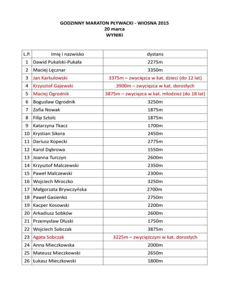 GODZINNY MARATON PŁYWACKI - WIOSNA 2015 20 marca WYNIKI L.P. Imię i nazwisko dystans 1 Dawid Pukalski-Pukała 2275m 2 Maciej Lęcznar 3350m 3 Jan Karkulowski 3375m – zwycięzca w kat. dzieci (do 12 lat) 4 Krzysztof Gajewski 5 Maciej Ogrodnik 3900m – zwycięzca w kat. dorosłych 3875m – zwycięzca w kat. młodzież (do 18 lat) 6 Bogusław Ogrodnik 3250m 7 Zofia Nowak 1875m 8 Filip Sztolc 1875m 9 Katarzyna Tkacz 1700m 10 Krystian Sikora 2450m 11 Dariusz Kopecki 2775m 12 Karol Dąbrowa 1550m 13 Joanna Turczyn 2600m 14 Krzysztof Malczewski 2350m 15 Paweł Malczewski 2300m 16 Wojciech Mroczko 3250m 17 Małgorzata Brywczyńska 2700m 18 Paweł Gasienko 2750m 19 Kacper Kosowski 2200m 20 Arkadiusz Sobków 2600m 21 Przemysław Dłuski 1750m 22 Wojciech Sobczak 3875m 23 Agata Sobczak 3225m – zwyciężczyni w kat. dorosłych 24 Anna Mieczkowska 2000m 25 Mateusz Mieczkowski 2650m 26 Łukasz Mieczkowski 1800m