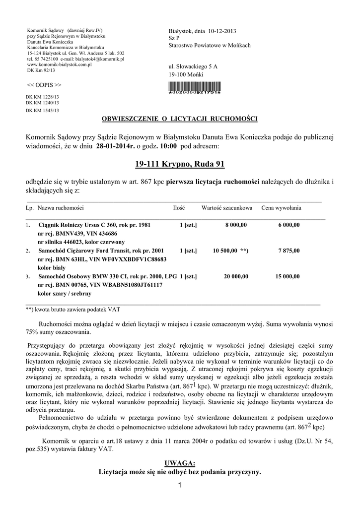 Komornik Sądowy (dawniej Rew.IV) przy Sądzie Rejonowym w Białymstoku Danuta Ewa Konieczka Kancelaria Komornicza w Białymstoku 15-124 Białystok ul. Gen. Wł. Andersa 5 lok. 502 tel. 85 7425100 e-mail: [email protected] www.komornik-bialystok.com.pl DK Km 92/13 Białystok, dnia 10-12-2013 Sz P Starostwo Powiatowe w Mońkach << ODPIS >> *0020000921751* ul. Słowackiego 5 A 19-100 Mońki DK KM 1228/13 DK KM 1240/13 DK KM 1545/13 OBWIESZCZENIE O LICYTACJI RUCHOMOŚCI Komornik Sądowy przy Sądzie Rejonowym w Białymstoku Danuta Ewa Konieczka podaje do publicznej wiadomości, że w dniu 28-01-2014r. o godz. 10:00 pod adresem: 19-111 Krypno, Ruda 91 odbędzie się w trybie ustalonym w art. 867 kpc pierwsza licytacja ruchomości należących do dłużnika i składających się z: _______________________________________________________________________________________________________________________ Lp. Nazwa ruchomości Ilość Wartość szacunkowa Cena wywołania _________________________________________________________________________________________________________________________ 1. 2. 3. Ciągnik Rolniczy Ursus C 360, rok pr. 1981 1 [szt.] nr rej. BMNV439, VIN 434686 nr silnika 446023, kolor czerwony Samochód Ciężarowy Ford Transit, rok pr. 2001 1 [szt.] nr rej. BMN 63HL, VIN WF0VXXBDFV1C88683 kolor biały Samochód Osobowy BMW 330 CI, rok pr. 2000, LPG 1 [szt.] nr rej. BMN 00765, VIN WBABN51080JT61117 kolor szary / srebrny 8 000,00 6 000,00 10 500,00 **) 7 875,00 20 000,00 15 000,00 _______________________________________________________________________________________________________________________ **) kwota brutto zawiera podatek VAT Ruchomości można oglądać w dzień licytacji w miejscu i czasie oznaczonym wyżej. Suma wywołania wynosi 75% sumy oszacowania. Przystępujący do przetargu obowiązany jest złożyć rękojmię w wysokości jednej dziesiątej części sumy oszacowania. Rękojmię złożoną przez licytanta, któremu udzielono przybicia, zatrzymuje się; pozostałym licytantom rękojmię zwraca się niezwłocznie. Jeżeli nabywca nie wykonał w terminie warunków licytacji co do zapłaty ceny, traci rękojmię, a skutki przybicia wygasają. Z utraconej rękojmi pokrywa się koszty egzekucji związanej ze sprzedażą, a reszta wchodzi w skład sumy uzyskanej w egzekucji albo jeżeli egzekucja została umorzona jest przelewana na dochód Skarbu Państwa (art. 8671 kpc). W przetargu nie mogą uczestniczyć: dłużnik, komornik, ich małżonkowie, dzieci, rodzice i rodzeństwo, osoby obecne na licytacji w charakterze urzędowym oraz licytant, który nie wykonał warunków poprzedniej licytacji. Stawienie się jednego licytanta wystarcza do odbycia przetargu. Pełnomocnictwo do udziału w przetargu powinno być stwierdzone dokumentem z podpisem urzędowo poświadczonym, chyba że chodzi o pełnomocnictwo udzielone adwokatowi lub radcy prawnemu (art. 8672 kpc) Komornik w oparciu o art.18 ustawy z dnia 11 marca 2004r o podatku od towarów i usług (Dz.U. Nr 54, poz.535) wystawia faktury VAT. UWAGA: Licytacja może się nie odbyć bez podania przyczyny. 1 Komornik Sądowy Danuta Ewa Konieczka 2