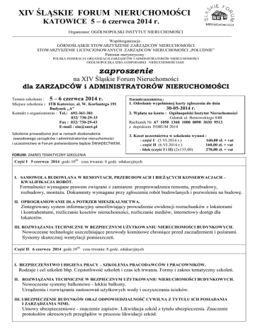 XIV ŚLĄSKIE FORUM NIERUCHOMOŚCI KATOWICE 5 – 6 czerwca 2014 r. Organizator: OGÓLNOPOLSKI INSTYTUT NIERUCHOMOŚCI Współorganizacja : GÓRNOŚLĄSKIE STOWARZYSZENIE ZARZĄDCÓW NIERUCHOMOŚCI STOWARZYSZENIE LICENCJONOWANYCH ZARZĄDCÓW NIERUCHOMOŚCI „POŁUDNIE” Patronat merytoryczny : POLSKA FEDERACJA ORGANIZACJI ZARZĄDCÓW I ADMINISTRATORÓW NIERUCHOMOŚCI OGÓLNOPOLSKA IZBA GOSPODARKI NIERUCHOMOŚCIAMI zaproszenie na XIV Śląskie Forum Nieruchomości dla ZARZĄDCÓW i ADMINISTRATORÓW NIERUCHOMOŚCI Termin szkolenia : 5 – 6 czerwca 2014 r. Miejsce szkolenia : ITB Katowice, al. W. Korfantego 191 Budynek „A” Kontakt z organizatorem : Tel.: 692-361-381 032/ 730-29-33 Fax : 032/ 730-29-43 E-mail : [email protected] Szkolenie prowadzone jest w ramach doskonalenia zawodowego zarządców i administratorów nieruchomości i uczestnictwo w Forum potwierdzone będzie ŚWIADECTWEM. Warunki uczestnictwa : 1. Odesłanie wypełnionej karty zgłoszenia do dnia 30-05-2014 r. 2. Wpłata na konto : Ogólnopolski Instytut Nieruchomości Gdańsk ul. Beniowskiego 84B Rachunek Nr 67 1050 1360 1000 0090 3030 9513 z dopiskiem FORUM 2014 3. Koszt uczestnictwa w szkoleniu wynosi : - część I (5.VI.2014 r.) 160,00 zł. + vat - część II (6.VI.2014 r.) 160,00 zł. + vat - blok (część I i II) (2x135,00) 270,00 zł. + vat FORUM: ZAKRES TEMATYCZNY SZKOLENIA Część I 5 czerwca 2014 godz.1000 czas trwania: 8 godz. edukacyjnych I. SAMOWOLA BUDOWLANA W REMONTACH, PRZEBUDOWACH I BIEŻĄCYCH KONSERWACJACH – KWALIFIKACJA ROBÓT. Formalności wymagane prawem związane z zamiarem przeprowadzenia remontu, przebudowy, rozbudowy, montażu. Dokumenty wymagane przy zgłoszeniu robót budowlanych i pozwoleniu na budowę. II. OPROGRAMOWANIE DLA POTRZEB MIESZKALNICTWA. Zintegrowany system informacyjny umożliwiający prowadzenie ewidencji rozrachunków z lokatorami i kontrahentami, rozliczanie kosztów nieruchomości, rozliczanie mediów, internetowy dostęp dla lokatorów. III. ROZWIĄZANIA TECHNICZNE W BEZPIECZNYM UŻYTKOWANIU NIERUCHOMOŚCI BUDYNKOWYCH. Nowoczesne technologie uszczelniające przewody kominowe chroniące przed zaczadzeniem i pożarami. Systemy skutecznej wentylacji pomieszczeń. Część II 6 czerwca 2014 godz.1000 czas trwania: 8 godz. edukacyjnych I. BEZPIECZEŃSTWO I HIGIENA PRACY – SZKOLENIA PRACODAWCÓW I PRACOWNIKÓW. Rodzaje i cel szkoleń bhp. Częstotliwość szkoleń i czas ich trwania. Formy i zakres tematyczny szkoleń. II. ROZWIĄZANIA TECHNICZNE W BEZPIECZNYM UŻYTKOWANIU NIERUCHOMOŚCI BUDYNKOWYCH. Nowoczesne systemy balkonowe - lekkie balkony. Urządzenia i rozwiązania zastosowań użytkowych wody i oczyszczania ścieków. III. UBEZPIECZENIE BUDYNKÓW ORAZ ODPOWIEDZIALNOŚĆ CYWILNA Z TYTUŁU ICH POSIADANIA I ZARZĄDZANIA NIMI.. Umowy ubezpieczeniowe - znaczenie zapisów. Likwidacja szkód z tytułu ubezpieczenia. Znaczenie protokołów okresowych przeglądów w procesie likwidacji szkód.