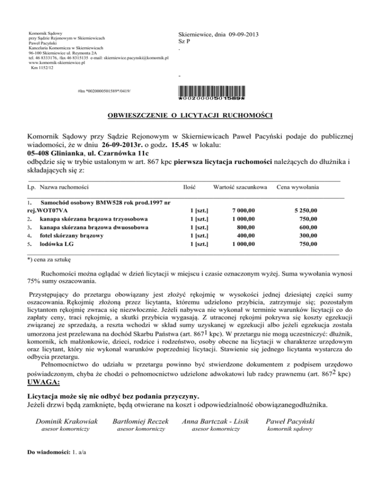 Komornik Sądowy przy Sądzie Rejonowym w Skierniewicach Paweł Pacyński Kancelaria Komornicza w Skierniewicach 96-100 Skierniewice ul. Reymonta 2A tel. 46 8333176, /fax 46 8315135 e-mail: [email protected] www.komornik-skierniewice.pl Km 1152/12 Skierniewice, dnia 09-09-2013 Sz P . #łm *0020000501589*/0419/ *0020000501589* OBWIESZCZENIE O LICYTACJI RUCHOMOŚCI Komornik Sądowy przy Sądzie Rejonowym w Skierniewicach Paweł Pacyński podaje do publicznej wiadomości, że w dniu 26-09-2013r. o godz. 15.45 w lokalu: 05-408 Glinianka, ul. Czarnówka 11c odbędzie się w trybie ustalonym w art. 867 kpc pierwsza licytacja ruchomości należących do dłużnika i składających się z: _______________________________________________________________________________________________________________________ Lp. Nazwa ruchomości Ilość Wartość szacunkowa Cena wywołania _________________________________________________________________________________________________________________________ 1. Samochód osobowy BMW528 rok prod.1997 nr rej.WOT07VA 2. kanapa skórzana brązowa trzyosobowa 3. kanapa skórzana brązowa dwuosobowa 4. fotel skórzany brązowy 5. lodówka LG 1 [szt.] 1 [szt.] 1 [szt.] 1 [szt.] 1 [szt.] 7 000,00 1 000,00 800,00 400,00 1 000,00 5 250,00 750,00 600,00 300,00 750,00 _______________________________________________________________________________________________________________________ *) cena za sztukę Ruchomości można oglądać w dzień licytacji w miejscu i czasie oznaczonym wyżej. Suma wywołania wynosi 75% sumy oszacowania. Przystępujący do przetargu obowiązany jest złożyć rękojmię w wysokości jednej dziesiątej części sumy oszacowania. Rękojmię złożoną przez licytanta, któremu udzielono przybicia, zatrzymuje się; pozostałym licytantom rękojmię zwraca się niezwłocznie. Jeżeli nabywca nie wykonał w terminie warunków licytacji co do zapłaty ceny, traci rękojmię, a skutki przybicia wygasają. Z utraconej rękojmi pokrywa się koszty egzekucji związanej ze sprzedażą, a reszta wchodzi w skład sumy uzyskanej w egzekucji albo jeżeli egzekucja została umorzona jest przelewana na dochód Skarbu Państwa (art. 8671 kpc). W przetargu nie mogą uczestniczyć: dłużnik, komornik, ich małżonkowie, dzieci, rodzice i rodzeństwo, osoby obecne na licytacji w charakterze urzędowym oraz licytant, który nie wykonał warunków poprzedniej licytacji. Stawienie się jednego licytanta wystarcza do odbycia przetargu. Pełnomocnictwo do udziału w przetargu powinno być stwierdzone dokumentem z podpisem urzędowo poświadczonym, chyba że chodzi o pełnomocnictwo udzielone adwokatowi lub radcy prawnemu (art. 8672 kpc) UWAGA: Licytacja może się nie odbyć bez podania przyczyny. Jeżeli drzwi będą zamknięte, będą otwierane na koszt i odpowiedzialność obowiązanegodłużnika. Dominik Krakowiak Bartłomiej Reczek Anna Bartczak - Lisik Paweł Pacyński asesor komorniczy asesor komorniczy asesor komorniczy komornik sądowy Do wiadomości: 1. a/a