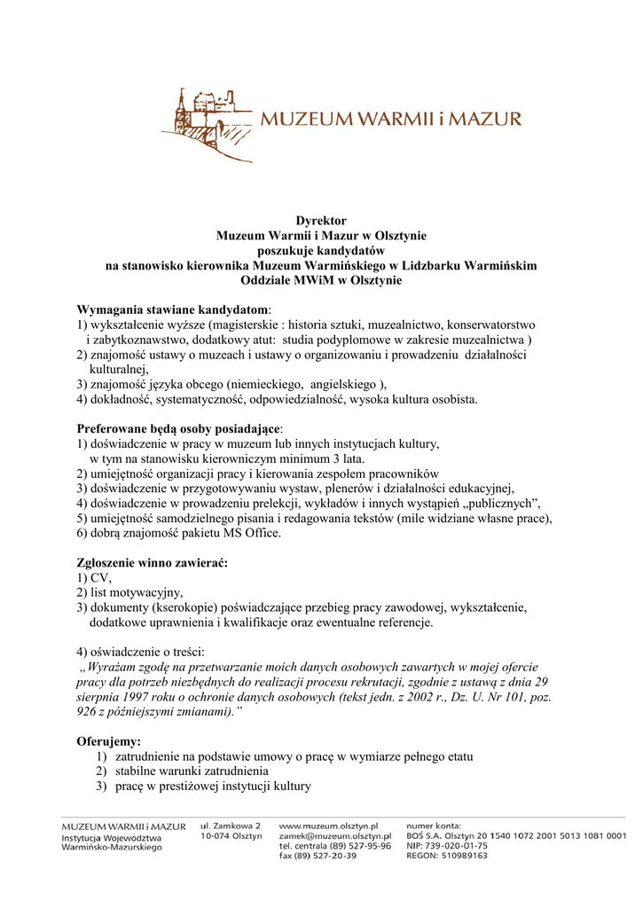 Dyrektor Muzeum Warmii i Mazur w Olsztynie poszukuje kandydatów na stanowisko kierownika Muzeum Warmińskiego w Lidzbarku Warmińskim Oddziale MWiM w Olsztynie Wymagania stawiane kandydatom: 1) wykształcenie wyższe (magisterskie : historia sztuki, muzealnictwo, konserwatorstwo i zabytkoznawstwo, dodatkowy atut: studia podyplomowe w zakresie muzealnictwa ) 2) znajomość ustawy o muzeach i ustawy o organizowaniu i prowadzeniu działalności kulturalnej, 3) znajomość języka obcego (niemieckiego, angielskiego ), 4) dokładność, systematyczność, odpowiedzialność, wysoka kultura osobista. Preferowane będą osoby posiadające: 1) doświadczenie w pracy w muzeum lub innych instytucjach kultury, w tym na stanowisku kierowniczym minimum 3 lata. 2) umiejętność organizacji pracy i kierowania zespołem pracowników 3) doświadczenie w przygotowywaniu wystaw, plenerów i działalności edukacyjnej, 4) doświadczenie w prowadzeniu prelekcji, wykładów i innych wystąpień „publicznych”, 5) umiejętność samodzielnego pisania i redagowania tekstów (mile widziane własne prace), 6) dobrą znajomość pakietu MS Office. Zgłoszenie winno zawierać: 1) CV, 2) list motywacyjny, 3) dokumenty (kserokopie) poświadczające przebieg pracy zawodowej, wykształcenie, dodatkowe uprawnienia i kwalifikacje oraz ewentualne referencje. 4) oświadczenie o treści: „Wyrażam zgodę na przetwarzanie moich danych osobowych zawartych w mojej ofercie pracy dla potrzeb niezbędnych do realizacji procesu rekrutacji, zgodnie z ustawą z dnia 29 sierpnia 1997 roku o ochronie danych osobowych (tekst jedn. z 2002 r., Dz. U. Nr 101, poz. 926 z późniejszymi zmianami).” Oferujemy: 1) zatrudnienie na podstawie umowy o pracę w wymiarze pełnego etatu 2) stabilne warunki zatrudnienia 3) pracę w prestiżowej instytucji kultury Dokumenty należy składać w sekretariacie Muzeum Warmii i Mazur w Olsztynie, ul Zamkowa 2 , przesłać pocztą lub drogą elektroniczną na adres: [email protected] w nieprzekraczalnym terminie do godziny 15,00 dnia 17 kwietnia 2015 r. z adnotacją „ Oferta na stanowisko kierownika Muzeum Warmińskiego”. O terminie przeprowadzenia rozmów kwalifikacyjnych wybrani kandydaci będą informowani telefonicznie. Informacja o wyniku naboru będzie umieszczona na stronie internetowej MWiM www.muzeum.olsztyn.pl Informujemy, że odpowiadamy tylko na wybrane oferty i nie zwracamy przesłanych dokumentów.