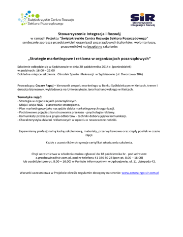 Stowarzyszenie Integracja i Rozwój w ramach Projektu ”Świętokrzyskie Centra Rozwoju Sektora Pozarządowego” serdecznie zaprasza przedstawicieli organizacji pozarządowych (członków, wolontariuszy, pracowników) na bezpłatne szkolenie: „Strategie marketingowe i reklama w organizacjach pozarządowych” Szkolenie odbędzie się w Sędziszowie w dniu 20 października 2014 r. (poniedziałek) w godzinach: 16.00 – 22.00 Dokładne miejsce szkolenia: Ośrodek Sportu i Rekreacji w Sędziszowie (ul. Dworcowa 20A) Prowadzący: Cezary Papaj – kierownik zespołu marketingu w Banku Spółdzielczym w Kielcach, trener i doradca biznesowy, wykładowca na Uniwersytecie Jana Kochanowskiego w Kielcach. Tematyka zajęć: - Strategia w organizacjach pozarządowych. - Misja i wizja NGO - planowanie strategiczne. - Plan marketingowy jako narzędzie działa marketingowych organizacji. - Podstawowe pojęcia z konstruowania przekazu - psychologia reklamy. - Komunikaty przekazu a grupa odbiorców - techniki doboru języka komunikacji. - Charakterystyka działań reklamowych w oparciu o nowoczesne nośniki. Zapewniamy profesjonalną kadrę szkoleniową, materiały, przerwy kawowe oraz ciepły posiłek w czasie zajęć. Każdy z uczestników otrzymuje certyfikat ukończenia szkolenia. Chęć uczestnictwa w szkoleniu można zgłaszać do 18 października br. pod adresem: [email protected], pod nr telefonu 41 386 80 28 (pon-pt, 8.00 – 16.00) lub osobiście (pon-pt, 8.00 – 16.00) w Punkcie Informacyjnym w Jędrzejowie, ul. 11 Listopada 42. Warunki uczestnictwa w Projekcie określa regulamin dostępny na stronie: www.centra.ngo.sir.com.pl