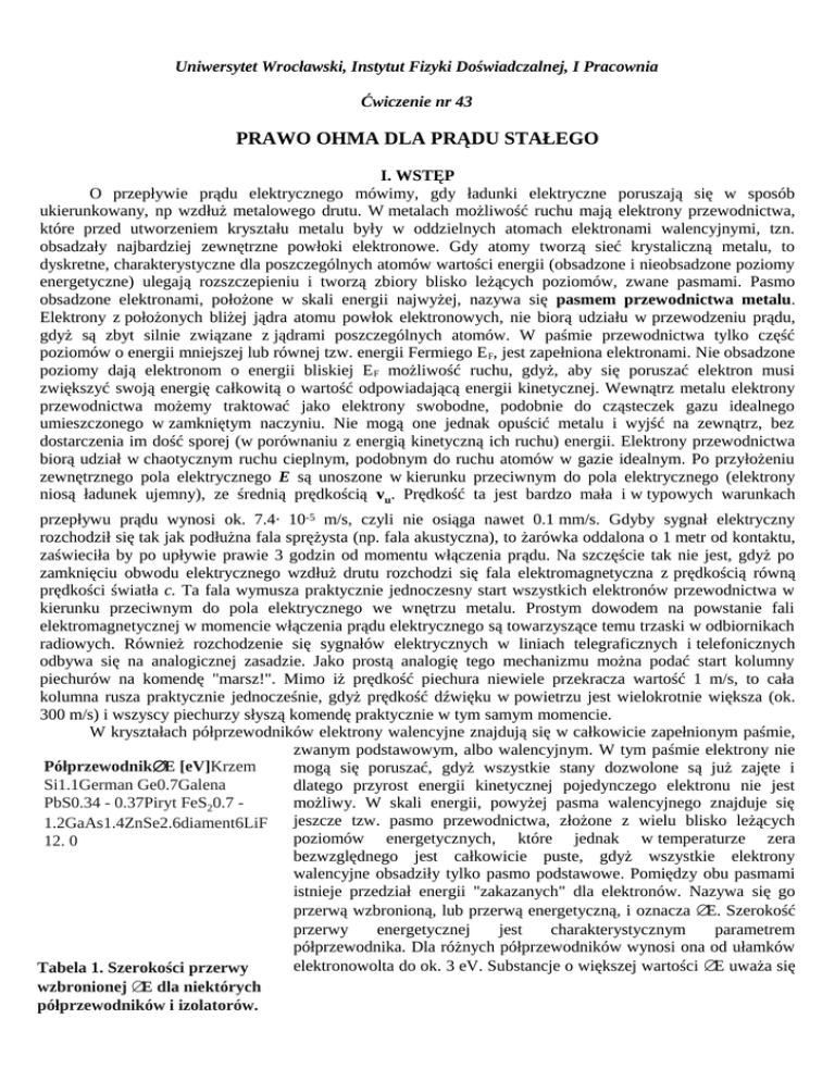Uniwersytet Wrocławski, Instytut Fizyki Doświadczalnej, I Pracownia Ćwiczenie nr 43 PRAWO OHMA DLA PRĄDU STAŁEGO I. WSTĘP O przepływie prądu elektrycznego mówimy, gdy ładunki elektryczne poruszają się w sposób ukierunkowany, np wzdłuż metalowego drutu. W metalach możliwość ruchu mają elektrony przewodnictwa, które przed utworzeniem kryształu metalu były w oddzielnych atomach elektronami walencyjnymi, tzn. obsadzały najbardziej zewnętrzne powłoki elektronowe. Gdy atomy tworzą sieć krystaliczną metalu, to dyskretne, charakterystyczne dla poszczególnych atomów wartości energii (obsadzone i nieobsadzone poziomy energetyczne) ulegają rozszczepieniu i tworzą zbiory blisko leżących poziomów, zwane pasmami. Pasmo obsadzone elektronami, położone w skali energii najwyżej, nazywa się pasmem przewodnictwa metalu. Elektrony z położonych bliżej jądra atomu powłok elektronowych, nie biorą udziału w przewodzeniu prądu, gdyż są zbyt silnie związane z jądrami poszczególnych atomów. W paśmie przewodnictwa tylko część poziomów o energii mniejszej lub równej tzw. energii Fermiego E F, jest zapełniona elektronami. Nie obsadzone poziomy dają elektronom o energii bliskiej E F możliwość ruchu, gdyż, aby się poruszać elektron musi zwiększyć swoją energię całkowitą o wartość odpowiadającą energii kinetycznej. Wewnątrz metalu elektrony przewodnictwa możemy traktować jako elektrony swobodne, podobnie do cząsteczek gazu idealnego umieszczonego w zamkniętym naczyniu. Nie mogą one jednak opuścić metalu i wyjść na zewnątrz, bez dostarczenia im dość sporej (w porównaniu z energią kinetyczną ich ruchu) energii. Elektrony przewodnictwa biorą udział w chaotycznym ruchu cieplnym, podobnym do ruchu atomów w gazie idealnym. Po przyłożeniu zewnętrznego pola elektrycznego E są unoszone w kierunku przeciwnym do pola elektrycznego (elektrony niosą ładunek ujemny), ze średnią prędkością vu. Prędkość ta jest bardzo mała i w typowych warunkach przepływu prądu wynosi ok. 7.4. 10-5 m/s, czyli nie osiąga nawet 0.1 mm/s. Gdyby sygnał elektryczny rozchodził się tak jak podłużna fala sprężysta (np. fala akustyczna), to żarówka oddalona o 1 metr od kontaktu, zaświeciła by po upływie prawie 3 godzin od momentu włączenia prądu. Na szczęście tak nie jest, gdyż po zamknięciu obwodu elektrycznego wzdłuż drutu rozchodzi się fala elektromagnetyczna z prędkością równą prędkości światła c. Ta fala wymusza praktycznie jednoczesny start wszystkich elektronów przewodnictwa w kierunku przeciwnym do pola elektrycznego we wnętrzu metalu. Prostym dowodem na powstanie fali elektromagnetycznej w momencie włączenia prądu elektrycznego są towarzyszące temu trzaski w odbiornikach radiowych. Również rozchodzenie się sygnałów elektrycznych w liniach telegraficznych i telefonicznych odbywa się na analogicznej zasadzie. Jako prostą analogię tego mechanizmu można podać start kolumny piechurów na komendę "marsz!". Mimo iż prędkość piechura niewiele przekracza wartość 1 m/s, to cała kolumna rusza praktycznie jednocześnie, gdyż prędkość dźwięku w powietrzu jest wielokrotnie większa (ok. 300 m/s) i wszyscy piechurzy słyszą komendę praktycznie w tym samym momencie. W kryształach półprzewodników elektrony walencyjne znajdują się w całkowicie zapełnionym paśmie, zwanym podstawowym, albo walencyjnym. W tym paśmie elektrony nie Półprzewodnik∆E [eV]Krzem mogą się poruszać, gdyż wszystkie stany dozwolone są już zajęte i Si1.1German Ge0.7Galena dlatego przyrost energii kinetycznej pojedynczego elektronu nie jest PbS0.34 - 0.37Piryt FeS20.7 możliwy. W skali energii, powyżej pasma walencyjnego znajduje się jeszcze tzw. pasmo przewodnictwa, złożone z wielu blisko leżących 1.2GaAs1.4ZnSe2.6diament6LiF poziomów energetycznych, które jednak w temperaturze zera 12. 0 bezwzględnego jest całkowicie puste, gdyż wszystkie elektrony walencyjne obsadziły tylko pasmo podstawowe. Pomiędzy obu pasmami istnieje przedział energii "zakazanych" dla elektronów. Nazywa się go przerwą wzbronioną, lub przerwą energetyczną, i oznacza ∆E. Szerokość przerwy energetycznej jest charakterystycznym parametrem półprzewodnika. Dla różnych półprzewodników wynosi ona od ułamków elektronowolta do ok. 3 eV. Substancje o większej wartości ∆E uważa się Tabela 1. Szerokości przerwy wzbronionej ∆E dla niektórych półprzewodników i izolatorów. 2 za izolatory. Wartość 3 eV została wybrana arbitralnie, jedynie w oparciu o wartość przewodności elektrycznej substancji w temperaturze pokojowej. W tabeli 1 podano wybrane wartości przerwy wzbronionej ∆E niektórych czystych półprzewodników i izolatorów. Dla substancji zawierających domieszki innych pierwiastków, jak na przykład rudy metali (tlenki i siarczki) mogą powstać nowe dozwolone poziomy i pasma energetyczne, leżące w przedziale energii wzbronionych. W temperaturach bliskich zera bezwzględnego wszystkie półprzewodniki są dobrymi izolatorami i nie przewodzą prądu. W temperaturach wyższych, np. w temperaturze pokojowej, półprzewodniki przewodzą tym lepiej, im mniejsza jest wartość ich przerwy energetycznej. Przewodnictwo tych ciał tłumaczy się tym, że kosztem uzyskanej energii termicznej, elektrony z pasma walencyjnego mogą przejść do pasma przewodnictwa, gdzie mają możliwość ruchu, podobnie jak elektrony w metalu. Takie przewodnictwo nazywamy przewodnictwem elektronowym. Ponadto, wskutek takich przejść elektronów, w paśmie walencyjnym pojawiają się wolne, niezapełnione stany energetyczne (po elektronach, które przeszły do pasma przewodnictwa). Te stany nazywane są dziurami. Dziury mogą być obsadzane przez sąsiednie elektrony z pasma walencyjnego, te zaś przemieszczając się, pozostawiają po sobie nowe dziury. Można więc powiedzieć, że dziury poruszają się w pa