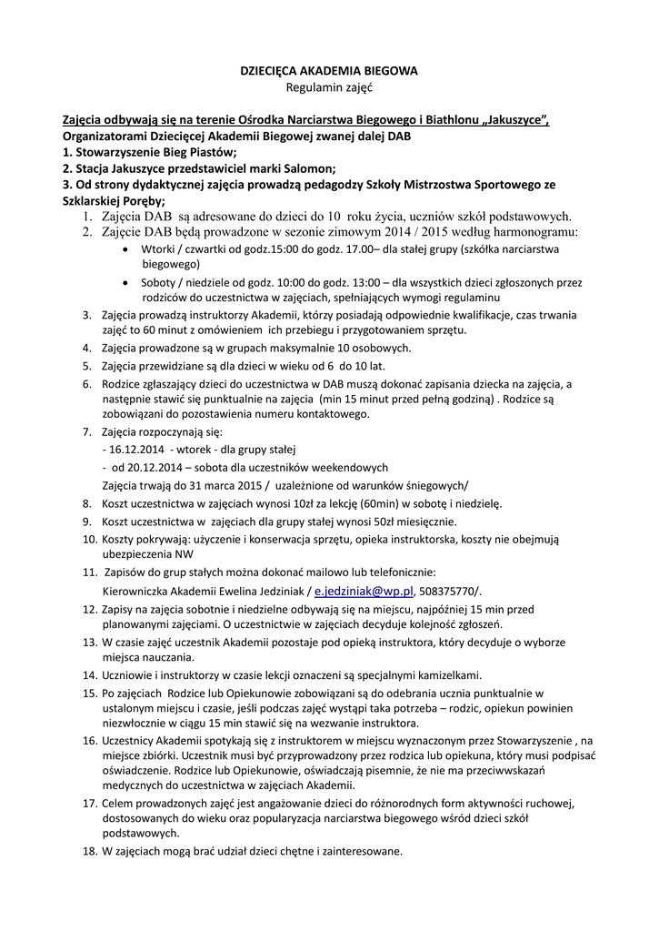 DZIECIĘCA AKADEMIA BIEGOWA Regulamin zajęć Zajęcia odbywają się na terenie Ośrodka Narciarstwa Biegowego i Biathlonu „Jakuszyce”, Organizatorami Dziecięcej Akademii Biegowej zwanej dalej DAB 1. Stowarzyszenie Bieg Piastów; 2. Stacja Jakuszyce przedstawiciel marki Salomon; 3. Od strony dydaktycznej zajęcia prowadzą pedagodzy Szkoły Mistrzostwa Sportowego ze Szklarskiej Poręby; 1. Zajęcia DAB są adresowane do dzieci do 10 roku życia, uczniów szkół podstawowych. 2. Zajęcie DAB będą prowadzone w sezonie zimowym 2014 / 2015 według harmonogramu: Wtorki / czwartki od godz.15:00 do godz. 17.00– dla stałej grupy (szkółka narciarstwa biegowego) 3. 4. 5. 6. 7. 8. 9. 10. 11. 12. 13. 14. 15. 16. 17. 18. Soboty / niedziele od godz. 10:00 do godz. 13:00 – dla wszystkich dzieci zgłoszonych przez rodziców do uczestnictwa w zajęciach, spełniających wymogi regulaminu Zajęcia prowadzą instruktorzy Akademii, którzy posiadają odpowiednie kwalifikacje, czas trwania zajęć to 60 minut z omówieniem ich przebiegu i przygotowaniem sprzętu. Zajęcia prowadzone są w grupach maksymalnie 10 osobowych. Zajęcia przewidziane są dla dzieci w wieku od 6 do 10 lat. Rodzice zgłaszający dzieci do uczestnictwa w DAB muszą dokonać zapisania dziecka na zajęcia, a następnie stawić się punktualnie na zajęcia (min 15 minut przed pełną godziną) . Rodzice są zobowiązani do pozostawienia numeru kontaktowego. Zajęcia rozpoczynają się: - 16.12.2014 - wtorek - dla grupy stałej - od 20.12.2014 – sobota dla uczestników weekendowych Zajęcia trwają do 31 marca 2015 / uzależnione od warunków śniegowych/ Koszt uczestnictwa w zajęciach wynosi 10zł za lekcję (60min) w sobotę i niedzielę. Koszt uczestnictwa w zajęciach dla grupy stałej wynosi 50zł miesięcznie. Koszty pokrywają: użyczenie i konserwacja sprzętu, opieka instruktorska, koszty nie obejmują ubezpieczenia NW Zapisów do grup stałych można dokonać mailowo lub telefonicznie: Kierowniczka Akademii Ewelina Jedziniak / [email protected], 508375770/. Zapisy na zajęcia sobotnie i niedzielne odbywają się na miejscu, najpóźniej 15 min przed planowanymi zajęciami. O uczestnictwie w zajęciach decyduje kolejność zgłoszeń. W czasie zajęć uczestnik Akademii pozostaje pod opieką instruktora, który decyduje o wyborze miejsca nauczania. Uczniowie i instruktorzy w czasie lekcji oznaczeni są specjalnymi kamizelkami. Po zajęciach Rodzice lub Opiekunowie zobowiązani są do odebrania ucznia punktualnie w ustalonym miejscu i czasie, jeśli podczas zajęć wystąpi taka potrzeba – rodzic, opiekun powinien niezwłocznie w ciągu 15 min stawić się na wezwanie instruktora. Uczestnicy Akademii spotykają się z instruktorem w miejscu wyznaczonym przez Stowarzyszenie , na miejsce zbiórki. Uczestnik musi być przyprowadzony przez rodzica lub opiekuna, który musi podpisać oświadczenie. Rodzice lub Opiekunowie, oświadczają pisemnie, że nie ma przeciwwskazań medycznych do uczestnictwa w zajęciach Akademii. Celem prowadzonych zajęć jest angażowanie dzieci do różnorodnych form aktywności ruchowej, dostosowanych do wieku oraz popularyzacja narciarstwa biegowego wśród dzieci szkół podstawowych. W zajęciach mogą brać udział dzieci chętne i zainteresowane. 19. Uczestnicy są zobowiązani do przestrzegania regulaminu, a udział w zajęciach oznacza jego akceptację, co jest potwierdzone podpisem na oświadczeniu. 20. Rodzice i opiekunowie zezwalają swoim dzieciom na uczestnictwo w zajęciach sportowych na własną odpowiedzialność, co oznacza, że w przypadku nie stwierdzenia rażących uchybień ze strony organizatora zajęć, organizator zwolniony jest z odpowiedzialności za ewentualne zaistniałe w czasie tych zajęć wypadki. 21. Obowiązkiem opiekuna/rodzica i uczestnika zajęć sportowo-rekreacyjnych jest informowanie nauczyciela przed przystąpieniem do wykonywania zadanych ćwiczeń o każdorazowej niedyspozycji, złym samopoczuciu, pogorszonym stanie zdrowia i innych ograniczeniach uniemożliwiających wykonywanie ćwiczeń uczestnikowi. 22. Uczestnik zajęć sportowych zobowiązany jest do przestrzegania zaleceń instruktora dotyczących zachowania się w trakcie zajęć, a w szczególności sposobu wykonywania ćwiczeń i zadań, w przypadku nie stosowania się do poleceń instruktora uczestnik może zostać z nich usunięty. 23. Rodzice i opiekunowie zobowiązują się do podania bieżących informacji o stanie zdrowia dziecka oraz przeciwwskazaniach do wykonywania ćwiczeń. Stawienie się dziecka na zajęciach sportowych jest równoznaczne z potwierdzeniem braku przeciwwskazań u dziecka do uprawiania sportu. 24. Każdy uczestnik zajęć sportowo-rekreacyjnych jest zobowiązany dbać o bezpieczeństwo własne i innych współuczestników. 25. Wszelkie uwagi i sugestie należy zgłaszać do Kierownika Akademii i będą one rozpatrywane niezwłocznie.