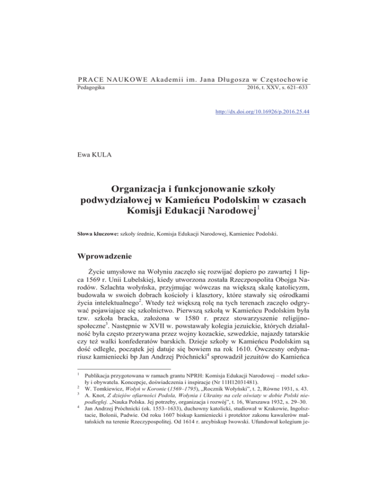 PRACE NAUKOWE Akademii i m. Jana Długosza w Częstochowie Pedagogika 2016, t. XXV, s. 621–633 http://dx.doi.org/10.16926/p.2016.25.44 Ewa KULA Organizacja i funkcjonowanie szkoły podwydziałowej w Kamieńcu Podolskim w czasach Komisji Edukacji Narodowej1 Słowa kluczowe: szkoły średnie, Komisja Edukacji Narodowej, Kamieniec Podolski. Wprowadzenie Życie umysłowe na Wołyniu zaczęło się rozwijać dopiero po zawartej 1 lipca 1569 r. Unii Lubelskiej, kiedy utworzona została Rzeczpospolita Obojga Narodów. Szlachta wołyńska, przyjmując wówczas na większą skalę katolicyzm, budowała w swoich dobrach kościoły i klasztory, które stawały się ośrodkami życia intelektualnego2. Wtedy też większą rolę na tych terenach zaczęło odgrywać pojawiające się szkolnictwo. Pierwszą szkołą w Kamieńcu Podolskim była tzw. szkoła bracka, założona w 1580 r. przez stowarzyszenie religijnospołeczne3. Następnie w XVII w. powstawały kolegia jezuickie, których działalność była często przerywana przez wojny kozackie, szwedzkie, najazdy tatarskie czy też walki konfederatów barskich. Dzieje szkoły w Kamieńcu Podolskim są dość odległe, początek jej datuje się bowiem na rok 1610. Ówczesny ordynariusz kamieniecki bp Jan Andrzej Próchnicki4 sprowadził jezuitów do Kamieńca 1 2 3 4 Publikacja przygotowana w ramach grantu NPRH: Komisja Edukacji Narodowej – model szkoły i obywatela. Koncepcje, doświadczenia i inspiracje (Nr 11H12031481). W. Tomkiewicz, Wołyń w Koronie (1569–1795), „Rocznik Wołyński”, t. 2, Równe 1931, s. 43. A. Knot, Z dziejów ofiarności Podola, Wołynia i Ukrainy na cele oświaty w dobie Polski niepodległej. „Nauka Polska. Jej potrzeby, organizacja i rozwój”, t. 16, Warszawa 1932, s. 29–30. Jan Andrzej Próchnicki (ok. 1553–1633), duchowny katolicki, studiował w Krakowie, Ingolsztacie, Bolonii, Padwie. Od roku 1607 biskup kamieniecki i protektor zakonu kawalerów maltańskich na terenie Rzeczypospolitej. Od 1614 r. arcybiskup lwowski. Ufundował kolegium je- 622 Ewa KULA w 1606 r. Zamiarem ks. Próchnickiego było utworzenie przez ten zakon publicznej szkoły dla młodzieży, a także prowadzenie działalności duszpasterskiej. Plany te zyskały poparcie miejscowych magnatów oraz szlachty, skutkiem czego w 1610 r. powstała szkoła5. Najpierw zostały utworzone trzy najniższe klasy (gramatykalne) oraz kurs kazuistyki dla duchowieństwa świeckiego. W 1614 r. generał Towarzystwa Jezusowego podniósł dom do rangi kolegium. Utworzono wtedy klasę poetyki, a w 1621 r. retoryki6. Działalność kolegium finansowana była przez majątki nadawane przez miejscową szlachtę. I tak w 1620 r. Agnieszka z Kężelowickich Stanisławska przekazała na rzecz kolegium dobra Niżbory, Kapuścinów i Myszkowce, a sędzia ziemski w Kamieńcu, Michał Radecki, podarował kolegium wsie Ormiany i Ormianki nad Smotryczem7. Działalność szkoły była zawieszona na czas wojny z Turcją od 1672 do 1699 r. Po skasowaniu w 1773 r. zakonu jezuitów Komisja Edukacji Narodowej oddała szkołę pod zarząd Akademii Krakowskiej. Kamieniec Podolski, w związku z zagrożeniem tatarsko-tureckim, od początku XVII w. określano jako urbs antemurale christianitatis (przedmurze chrześcijaństwa) oraz jako „Bramę do Polski”. W czasach Komisji Edukacji Narodowej miasto zaprezentowane zostało w liście Piotra Walawskiego, radcy „do ekonomiki miejscowej”, zamieszczonym na łamach ukazującego się wówczas „Dziennika Handlowego”. Z niewielkiego objętościowo listu wynika, że Kamieniec Podolski nie posiadał przemysłu, funkcjonowało natomiast i rozwijało się rzemiosło. W latach osiemdziesiątych osiemnastego wieku istniały tam cechy: kuśnierski, krawiecki, stolarski, kowalski, rzeźniczy, piekarski, szewski, tracki (pilarzy tartacznych) i olejniczy. Liczba zabudowań łącznie z klasztorami, kamienicami, dworkami i „najmniejszymi chatkami” wynosiła wówczas jedynie 430. Powodem tak małego zaludnienia były zarazy, jakie wyludniły miasto w 1733 i 1770 r., a także trudny dojazd do Kamieńca8. Mieszkańcy domagali się przywrócenia fabryki tytoniu i tabaki w celu podniesienia poziomu życia w mieście, ponieważ połowa placów nie była zagospodarowana mimo zezwolenia na 5 6 7 8 zuickie wspólnie z Mikołajem Jazłowieckim, starostą śniatyńskim, ze Stanisławem Lanckorońskim, starostą skalskim oraz z Walentym Aleksandrem Kalinowskim, starostą kamienieckim, generałem ziem podolskich. Darował szkole swoją prywatną bibliotekę. M. Gębarowicz, Jan Andrzej Próchnicki (ok. 1553–1633), PSB, t. 28, s. 547–550; A. Knot, dz. cyt., s. 32. Сборникъ матерiаловъ для исторiи просв˴щения въ Россiи, извлеченныхъ изъ Архива Министерства Народного Просв˴щенiя, т. 1: Учебныя заведенiя въ Западныхъ губернiяхъ до учрежденiя Виленскaго учебнaго округа 1783–1803, Санктъ-Петербургъ 1893, kol. 349–350. R. Pelczar, Jezuici w Kamieńcu Podolskim (1608–1773), [w:] Kamieniec Podolski. Studia z dziejów miasta i regionu, pod red. F. Kiryka, t. 1, Kraków 2000, s. 194, 198. A. Knot, dz. cyt., s. 32. Zebranych zostało w opisywanym roku 100 000 zł na wykonanie mostu murowanego, ułatwiającego dojazd do miasta. List opisujący stan miasta Kamieńca Podolskiego dnia 1 czerwca 1786 roku, „Dziennik Handlowy” 1786, cz. 6, s. 331–335. Organizacja i funkcjonowanie szkoły podwydziałowej… 623 budowę. Handel towarami tureckimi i krajowymi był ograniczony z uwagi na znikomą liczbę kupujących, stąd często towary ze stratą przewożone były w głąb kraju. Kamieniec posiadał jeszcze wśród towarów produkowanych na miejscu woski, łoje, skóry wołowe, baranie i kozie, wełny krajowe i wołoskie9. W pierwszej połowie XVIII wieku Kamieniec stracił 