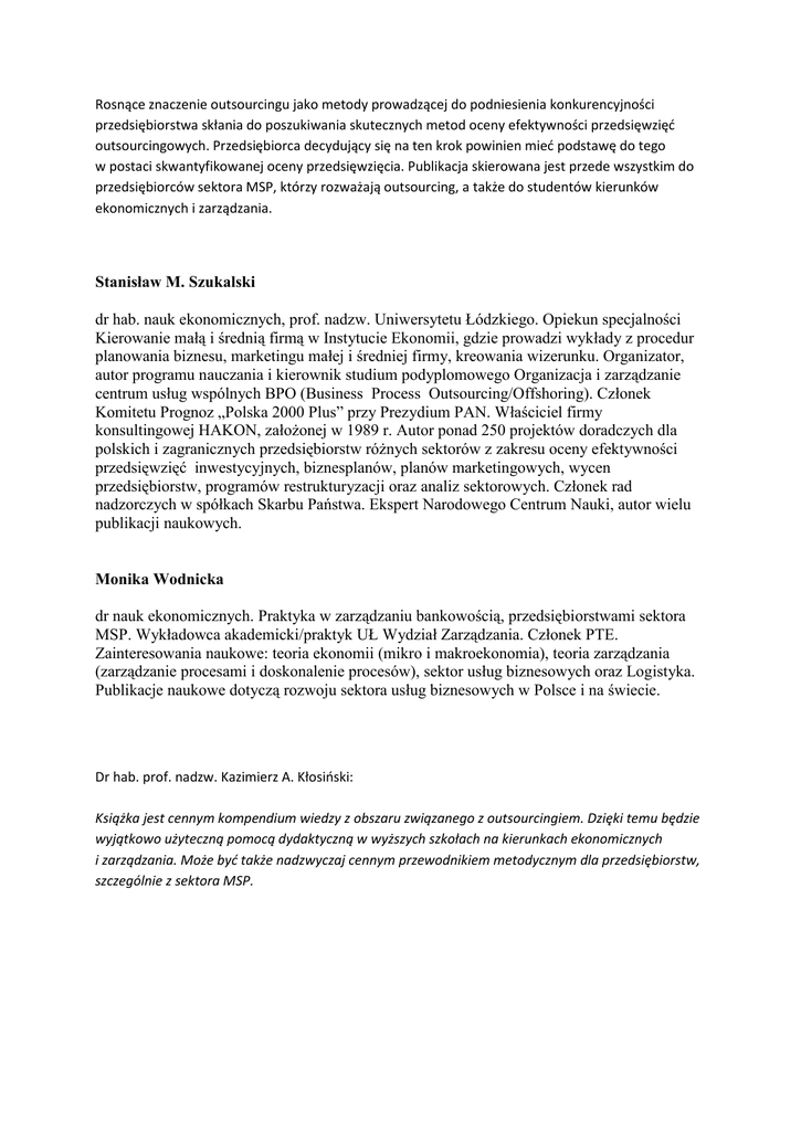Rosnące znaczenie outsourcingu jako metody prowadzącej do podniesienia konkurencyjności przedsiębiorstwa skłania do poszukiwania skutecznych metod oceny efektywności przedsięwzięć outsourcingowych. Przedsiębiorca decydujący się na ten krok powinien mieć podstawę do tego w postaci skwantyfikowanej oceny przedsięwzięcia. Publikacja skierowana jest przede wszystkim do przedsiębiorców sektora MSP, którzy rozważają outsourcing, a także do studentów kierunków ekonomicznych i zarządzania. Stanisław M. Szukalski dr hab. nauk ekonomicznych, prof. nadzw. Uniwersytetu Łódzkiego. Opiekun specjalności Kierowanie małą i średnią firmą w Instytucie Ekonomii, gdzie prowadzi wykłady z procedur planowania biznesu, marketingu małej i średniej firmy, kreowania wizerunku. Organizator, autor programu nauczania i kierownik studium podyplomowego Organizacja i zarządzanie centrum usług wspólnych BPO (Business Process Outsourcing/Offshoring). Członek Komitetu Prognoz „Polska 2000 Plus” przy Prezydium PAN. Właściciel firmy konsultingowej HAKON, założonej w 1989 r. Autor ponad 250 projektów doradczych dla polskich i zagranicznych przedsiębiorstw różnych sektorów z zakresu oceny efektywności przedsięwzięć inwestycyjnych, biznesplanów, planów marketingowych, wycen przedsiębiorstw, programów restrukturyzacji oraz analiz sektorowych. Członek rad nadzorczych w spółkach Skarbu Państwa. Ekspert Narodowego Centrum Nauki, autor wielu publikacji naukowych. Monika Wodnicka dr nauk ekonomicznych. Praktyka w zarządzaniu bankowością, przedsiębiorstwami sektora MSP. Wykładowca akademicki/praktyk UŁ Wydział Zarządzania. Członek PTE. Zainteresowania naukowe: teoria ekonomii (mikro i makroekonomia), teoria zarządzania (zarządzanie procesami i doskonalenie procesów), sektor usług biznesowych oraz Logistyka. Publikacje naukowe dotyczą rozwoju sektora usług biznesowych w Polsce i na świecie. Dr hab. prof. nadzw. Kazimierz A. Kłosiński: Książka jest cennym kompendium wiedzy z obszaru związanego z outsourcingiem. Dzięki temu będzie wyjątkowo użyteczną pomocą dydaktyczną w wyższych szkołach na kierunkach ekonomicznych i zarządzania. Może być także nadzwyczaj cennym przewodnikiem metodycznym dla przedsiębiorstw, szczególnie z sektora MSP. Spis treści: Wstęp Stosowane skróty Rozdział I. Istota procesowego zarządzania organizacjami 1.1. Ewolucja w zarządzaniu przedsiębiorstwami 1.2. Pojęcie procesu w zarządzaniu organizacją 1.3. Typologia procesów biznesowych w przedsiębiorstwie 1.4. Metody identyfikacji procesów biznesowych w przedsiębiorstwie 1.5. Modelowanie i mapowanie procesów biznesowych w organizacji 1.6. Mierzenie efektywności procesów 1.7. Realizacja procesów. Model wewnętrzny i outsourcing Rozdział II. Charakterystyka wybranych procesów pod kątem outsourcingu – księgowość i finanse 2.1. Natura procesów księgowych 2.2. Procesy ewidencji księgowej, wynikające z różnych obszarów funkcjonalnych 2.2.1. Obszar administracyjny 2.2.2. Obszar sprzedaży – wpływy pieniężne 2.2.3. Obszar zakupów – rozchody pieniężne 2.2.4. Obszar produkcji 2.2.5. Przebieg procesu księgowego 2.2.6. Różne formy opodatkowania a obowiązki księgowe 2.2.7. Wybrane wskaźniki oceny efektywności procesów księgowości 2.2.8. Outsourcing księgowości 2.2.9. Rynek outsourcingu księgowości w Polsce 2.3. Procesy zarządzania finansami 2.3.1. Natura zarządzania finansami 2.3.2. Wybrane wskaźniki procesów zarządzania finansami 2.3.3. O outsourcingu w zakresie zarządzania finansami 2.3.4. Rynek usług outsourcingu zarządzania finansami Rozdział III. Charakterystyka wybranych procesów pod kątem outsourcingu – zasoby ludzkie: rekrutacja 3.1. Natura procesów rekrutacji 3.2. Zakres procesu rekrutacji 3.3. Wskaźniki efektywności procesów rekrutacji 3.4. Outsourcing procesu rekrutacji: przebieg, korzyści 3.5. Rynek usług rekrutacyjnych w Polsce Rozdział IV. Charakterystyka wybranych procesów pod kątem outsourcingu – zasoby ludzkie: szkolenia 4.1. Natura procesu szkoleń w organizacji 4.2. Zakres procesu szkoleń 4.3. Procedura organizacyjna i źródła finansowania procesu szkoleń 4.4. Mierzenie efektywności i jakości procesów szkoleniowych 4.5. Outsourcing procesu szkoleń: przebieg, korzyści 4.6. Rynek usług szkoleniowych w Polsce Rozdział V. Charakterystyka wybranych procesów pod kątem outsourcingu – kadry i płace 5.1. Procesy kadrowo-płacowe w polskim prawodawstwie 5.2. Zakres procesów kadrowo-płacowych 5.3. Systemy organizacyjne procesów kadrowo-płacowych 5.4. Wskaźniki efektywności procesów kadrowych 5.5. Outsourcing procesu kadrowo-płacowego jako alternatywa dla własnych służb 5.6. Rynek outsourcingu kadrowo-płacowego na polskim gruncie 5.7. Warunki powodzenia outsourcingu procesów kadrowo-płacowych Rozdział VI. Charakterystyka wybranych procesów pod kątem outsourcingu – logistyka 6.1. Natura procesów logistycznych 6.2. Struktura procesów logistycznych 6.2.1. Procesy magazynowe 6.2.2. Procesy transportowe 6.3. Struktura kosztów i mierniki procesów logistycznych 6.4. Outsourcing logistyczny 6.5. Struktura usług logistycznych Rozdział VII. Charakterystyka wybranych procesów pod kątem outsourcingu – procesy IT 7.1. Istota i zakres procesów IT w przedsiębiorstwach 7.2. Zakres usług outsourcingu IT 7.3. Korzyści z outsourcingu IT 7.4. Outsourcing IT w sektorze MSP w Polsce Rozdział VIII. Outsourcing – cele, korzyści, ryzyko 8.1. Strategiczne i operacyjne cele outsourcingu 8.2. Strategiczne i operacyjne korzyści z outsourcingu 8.3. Rodzaje ryzyka outsourcingu i metody jego redukcji 8.3.1. Ryzyko strategiczne 8.3.2. Ryzyko operacyjne 8.3.3. Ryzyko finansowe 8.3.4. Ryzyko organizacyjne 8.3.5. Ryzyko prawne 8.3.6. Ryzyko technologiczne 8.4. Zarządzanie ryzykiem jako narzędzie redukcji zagrożeń outsourcingu Rozdział IX. Procesy biznesowe w przedsiębiors