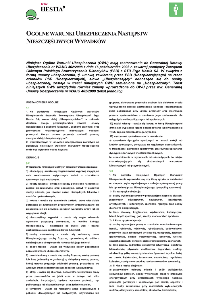 ERGO HESTIA8 OGÓLNE WARUNKI UBEZPIECZENIA NASTĘPSTW NIESZCZĘŚLIWYCH WYPADKÓW Niniejsze Ogólne Warunki Ubezpieczenia (OWU) mają zastosowanie do Generalnej Umowy Ubezpieczenia nr WAUG 462/2008 z dnia 16 października 2008 r. zawartej pomiędzy Zarządem Głównym Polskiego Stowarzyszenia Diabetyków (PSD) a STU Ergo Hestia SA. W związku z formą umowy ubezpieczenia, tj. umową zawieraną przez PSD (Ubezpieczającego) na rzecz członków PSD (Ubezpieczonych), słowo „Ubezpieczający” odnoszące się do osoby ubezpieczonej, zostaje w treści niniejszych OWU zamienione na „Ubezpieczony”. Tekst niniejszych OWU uwzględnia równieŜ zmiany wprowadzone do OWU przez ww. Generalną Umowę Ubezpieczenia nr WAUG 462/2008 (tekst jednolity) POSTANOWIENIA OGÓLNE grupowe, skierowane przeciwko osobom lub obiektom w celu §1 wprowadzenia chaosu, zastraszenia ludności i dezorganizacji Warunków Ŝycia publicznego przy uŜyciu przemocy oraz skierowane Ubezpieczenia Sopockie Towarzystwo Ubezpieczeń Ergo przeciw społeczeństwu z zamiarem jego zastraszenia dla Hestia SA, zwane dalej „Ubezpieczycielem”, w zakresie osiągnięcia celów politycznych lub społecznych, działania umowy 10) udział własny - uwaŜa się kwotę, o którą Ubezpieczyciel ubezpieczenia z osobami fizycznymi, osobami prawnymi oraz zmniejsza wypłacane łączne odszkodowanie lub świadczenie z 1. Na podstawie swego jednostkami prawnymi, niniejszych przedsiębiorstwa organizacyjnymi którym Ogólnych ustawa zawiera niebędącymi przyznaje osobami zdolność prawną, zwanymi dalej „Ubezpieczającymi ”. 2. Ubezpieczonym w umowach ubezpieczenia zawartych na tytułu zajścia nieszczęśliwego wypadku, 11) wyczynowe uprawianie sportu - uwaŜa się: a) uprawianie dyscyplin sportowych w ramach sekcji lub podstawie niniejszych Ogólnych Warunków Ubezpieczenia klubów sportowych, polegające na regularnym uczestniczeniu moŜe być wyłącznie osoba fizyczna. w treningach i zawodach sportowych, jak równieŜ uprawianie dyscyplin sportowych w celach zarobkowych, b) uczestniczenie w wyprawach lub ekspedycjach do miejsc DEFINICJE charakteryzujących §2 W rozumieniu niniejszych Ogólnych Warunków Ubezpieczenia za: 1) ekspedycję - uwaŜa się zorganizowaną wyprawę mającą na §3 celu 1. Na zrealizowanie wytyczonych zadań o charakterze się ekstremalnymi warunkami klimatycznymi lub przyrodniczymi. potrzeby niniejszych Ogólnych Warunków sportowym bądź naukowym, Ubezpieczenia wprowadza się trzy klasy ryzyka, w zaleŜności 2) koszty leczenia - uwaŜa się koszty poniesione na badania i od stopnia ryzyka wynikającego z rodzaju wykonywanej pracy zabiegi ambulatoryjne oraz operacyjne, pobyt w placówce lub uprawianej przez Ubezpieczającego dyscypliny sportowej: słuŜby zdrowia, jak równieŜ zakup niezbędnych lekarstw i 1) I klasa ryzyka obejmuje: środków opatrunkowych, a) osoby wykonujące pracę w przewaŜającej części w biurach, 3) lokaut - uwaŜa się zamknięcie zakładu przez właściciela placówkach połączone ze zwalnianiem pracowników, przeprowadzane dla artystycznych i kulturalnych, rzemiośle ręcznym oraz osoby zmuszenia ich do przyjęcia gorszych warunków pracy lub ze duchowne i niepracujące, względu na strajk, b) tenis stołowy, kręglarstwo, wędkarstwo, kulturystykę, 4) nieszczęśliwy wypadek - uwaŜa się nagłe zdarzenie bilard, brydŜ sportowy, golf, szachy, modelarstwo sportowe, wywołane przyczyną Ubezpieczający - zewnętrzną, niezaleŜnie od w wyniku swojej woli którego - doznał uprawnioną - uwaŜa się wskazaną przez Ubezpieczającego osobę fizyczną, uprawnioną do odbioru 6) osoby trzecie - uwaŜa się wszystkie osoby pozostające 7) przedsiębiorcę - uwaŜa się osobę fizyczną, osobę prawną lub inną jednostkę organizacyjną niebędącą osobą prawną, której ustawa przyznaje zdolność prawną, prowadzącą we własnym imieniu działalność gospodarczą lub zawodową, przemyśle (poza zaliczonymi do klasy III), transporcie, Ŝegludze, gazownictwie, słuŜbie weterynaryjnej, lotnictwie, wojsku, b) tenis ziemny, badminton, gimnastykę artystyczną i sportową, przez pracowników na jakiś czas w jednym lub kilku wyrazem protestu, windsurfing, piłkę wodną, łyŜwiarstwo figurowe i szybkie, hokej na trawie, kajakarstwo, łucznictwo, strzelectwo, myślistwo, kolarstwo, sporty motorowodne, narciarstwo wodne, szermierkę, 3) III klasa ryzyka obejmuje: a) pracowników 8) strajk - uwaŜa się zbiorowe, dobrowolne wstrzymanie pracy będące 2) II klasa ryzyka obejmuje: a) osoby wykonujące pracę w rzemiośle zmechanizowanym, lekkoatletykę, pływanie, wioślarstwo, Ŝeglarstwo, surfing, poza stosunkiem ubezpieczeniowym, instytucjach, leczniczych, straŜach poŜarnych, trenerów, sędziów i instruktorów sportowych, naleŜnej sumy ubezpieczenia na wypadek jego śmierci, zakładach, naukowych, handlu, rolnictwie, leśnictwie, rybołówstwie, budownictwie, uszkodzenia ciała, rozstroju zdrowia lub zmarł, 5) osobę oświatowych, np. politycznego lub ekonomicznego, oraz Ŝądaniem zmian, 9) terroryzm - uwaŜa się nielegalne akcje organizowane z pobudek ideologicznych lub politycznych, indywidualne lub ochrony mienia i osób, policjantów, ratowników górskich, osoby wykonujące pracę w przemyśle energetycznym przy urządzeniach wysokiego napięcia, przemyśle górniczym i kopalniczym pod ziemią, saperów i inne osoby zatrudnione przy materiałach wybuchowych, nurków, oblatywaczy samolotów, akrobatów, kaskaderów, b) judo, dalekowschodnie sztuki walki, rugby, boks, bobsleje, 2. W przypadkach niewymienionych powyŜej klasę ryzyka podnoszenie cięŜarów, zapasy, narciarstwo, płetwonurkowa- ustala się według rodzajów zatrudnienia lub dyscyplin nie, hokej na lodzie, piłkę noŜną, piłkę siatkową, piłkę ręczną, sportowych wymienionych w ust. 1 pkt 1-3 najbardziej koszykówkę, sporty odpowiadających stopniowi ryzyka wynikającemu z rodzaju spadochrono