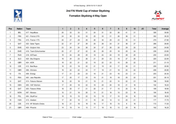 InTime Scoring - 2016-10-15 11:35:37 2nd FAI World Cup of Indoor Skydiving Formation Skydiving 4-Way Open Pos Nation Team 1 2 3 4 5 6 7 8 9 10 JO Total Average 1 BEL 417 - HayaBusa 25 32 33 31 24 31 32 26 41 31 - 306 30.60 2 FRA 421 - France 2 FS 24 30 33 33 25 33 31 26 36 31 - 302 30.20 3 FRA 415 - France 1 FS 20 27 29 29 26 30 29 23 35 31 - 279 27.90 4 QAT 422 - Qatar Tigers 22 27 27 29 25 28 24 21 36 27 - 266 26.60 5 SWE 423 - Grytjom Volo 23 24 24 26 24 27 26 20 29 25 - 248 24.80 6 SWE 416 - Team Echochamber 20 27 27 22 20 26 25 18 29 24 - 238 23.80 7 RUS 418 - XOTeam 19 24 26 25 18 24 22 19 28 25 - 230 23.00 8 SLO 420 - Sky Dragons 18 24 23 26 21 20 23 18 27 20 - 220 22.00 9 GBR 424 - ACM 19 22 21 22 19 22 23 15 26 22 - 211 21.10 10 CZE 412 - Bad Boys 19 23 19 22 21 19 22 17 26 21 - 209 20.90 11 GBR 406 - Chimera 19 22 22 24 17 19 21 18 24 22 - 208 20.80 12 ITA 408 - Energy 17 21 20 23 18 21 23 16 23 21 - 203 20.30 13 RSA 402 - Jazz Republic 17 20 17 23 19 21 19 18 25 22 - 201 20.10 14 QAT 414 - Falcons Maroon 18 22 18 21 19 21 22 14 22 21 - 198 19.80 15 DEN 405 - VAF Warriors 17 20 18 22 18 20 20 18 21 18 - 192 19.20 16 QAT 403 - Falcons White 18 20 17 21 20 21 17 15 25 15 - 189 18.90 17 MON 407 - Monaco 15 21 18 20 14 21 18 15 23 19 - 184 18.40 18 POL 404 - Sky4Four 19 19 15 22 19 19 17 10 24 16 - 180 18.00 19 HUN 413 - Aladeen 17 20 16 21 16 20 14 12 20 21 - 177 17.70 20 CZE 410 - HF Michal's Chicks 18 21 18 19 18 17 19 15 9 18 - 172 17.20 21 GBR 409 - Phoenix 14 19 14 13 17 18 18 13 20 16 - 162 16.20 Date & Time: ____________________ Chief Judge: ______________________ Meet Director: ______________________ InTime Scoring - 2016-10-15 11:35:37 2nd FAI World Cup of Indoor Skydiving Formation Skydiving 4-Way Open Pos Nation 22 LTU Team 1 2 3 4 5 6 7 8 9 10 JO 419 - Equinox 13 18 7 15 16 16 17 12 19 17 - Date & Time: ____________________ Chief Judge: ______________________ Meet Director: ______________________ Total Average 150 15.00