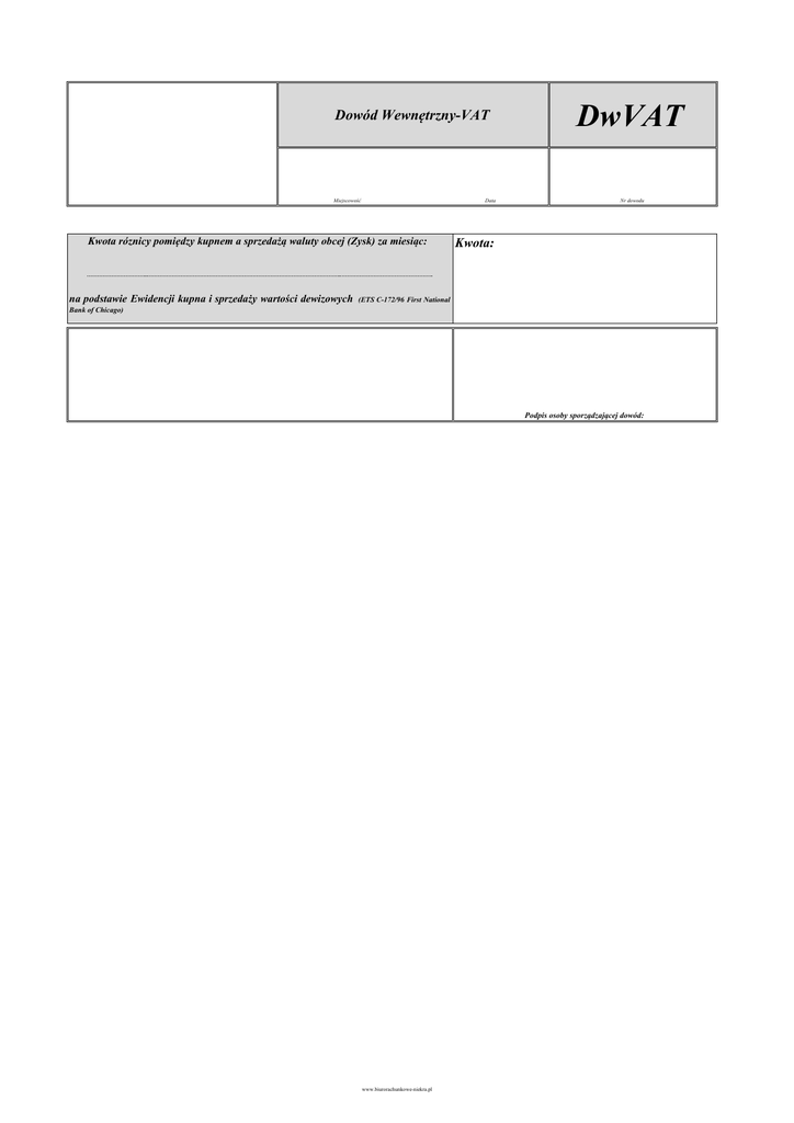 Dowód Wewnętrzny-VAT Miejscowość Data Kwota róznicy pomiędzy kupnem a sprzedażą waluty obcej (Zysk) za miesiąc: DwVAT Nr dowodu Kwota: ……………………………...………………………………………………………………………………………………..……………………………………………. na podstawie Ewidencji kupna i sprzedaży wartości dewizowych (ETS C-172/96 First National Bank of Chicago) Podpis osoby sporządzającej dowód: www.biurorachunkowe-niekra.pl