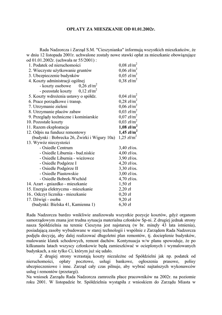OPŁATY ZA MIESZKANIE OD 01.01.2002r. Rada Nadzorcza i Zarząd S.M. "Cieszynianka" informują wszystkich mieszkańców, że w dniu 12 listopada 2001r. uchwalone zostały nowe stawki opłat za mieszkanie obowiązujące od 01.01.2002r. (uchwała nr 55/2001) : 1. Podatek od nieruchomości 0,08 zł/m2 2. Wieczyste użytkowanie gruntów 0,06 zł/m2 3. Ubezpieczenie budynków 0,05 zl/m2 4. Koszty administracji ogólnej 0,38 zł/m2 - koszty osobowe 0,26 zł/m2 - pozostałe koszty 0,12 zł/m2 5. Koszty wdrożenia ustawy o spółdz. 0,04 zł/m2 6. Prace porządkowe i transp. 0,28 zł/m2 7. Utrzymanie zieleni 0,06 zł/m2 8. Utrzymanie placów zabaw 0,03 zł/m2 9. Przeglądy techniczne i kominiarskie 0,07 zł/m2 10. Pozostałe koszty 0,03 zł/m2 11. Razem eksploatacja 1,08 zł/m2 12. Odpis na fundusz remontowy 1,45 zł/m2 (budynki : Bobrecka 26, Żwirki i Wigury 10a) 1,25 zł/m2 13. Wywóz nieczystości - Osiedle Centrum 3,40 zł/os. - Osiedle Liburnia - bud.niskie 4,00 zł/os. - Osiedle Liburnia - wieżowce 3,90 zł/os. - Osiedle Podgórze I 4,20 zł/os. - Osiedle Podgórze II 3,30 zł/os. - Osiedle Piastowskie 3,00 zl/os. - Osiedle Bobrek-Wschód 4,70 zł/os. 14. Azart - gniazdko - mieszkanie 1,50 zł 15. Energia elektryczna - mieszkanie 2,20 zł 16.. Odczyt licznika - mieszkanie 0,20 zł 17. Dźwigi - osoba 9,20 zł (budynki: Bielska 41, Kamienna 1) 6,30 zł Rada Nadzorcza bardzo wnikliwie analizowała wszystkie pozycje kosztów, gdyż organom samorządowym znana jest trudna sytuacja materialna członków Sp-ni. Z drugiej jednak strony nasza Spółdzielnia na terenie Cieszyna jest najstarszą (w br. minęły 43 lata istnienia), posiadającą zasoby wybudowane w starej technologii i wspólnie z Zarządem Rada Nadzorcza podjęła decyzję, aby dalej realizować długoletni plan remontów, tj. docieplenie budynków, malowanie klatek schodowych, remont dachów. Kontynuacja w/w planu spowoduje, że po kilkunastu latach wszyscy członkowie będą zamieszkiwać w ocieplonych i wymalowanych budynkach, a nie tylko Ci, którym już się udało. Z drugiej strony wzrastają koszty niezależne od Spółdzielni jak np. podatek od nieruchomości, opłaty pocztowe, usługi bankowe, ogłoszenia prasowe, polisy ubezpieczeniowe i inne. Zarząd cały czas pilnuje, aby wybrać najtańszych wykonawców usług i remontów (przetargi). Na wniosek Zarządu Rada Nadzorcza zamroziła płace pracowników na 2002r. na poziomie roku 2001. W listopadzie br. Spółdzielnia wystąpiła z wnioskiem do Zarządu Miasta w sprawie udzielenia bonifikaty w opłacie z tytułu wieczystego użytkowania gruntów, decyzji w tym zakresie jeszcze nie posiadamy. Wyjaśniamy również, że na 2002r. wprowadzono dodatkową pozycję kosztów : 0,04 złm2 - koszty wdrożenia ustawy o spółdzielniach mieszkaniowych, które między innymi tworzą : - koszty prac geodezyjnych wykonywanych przez firmę geodezyjną GEODECI - ok. 50.000 zł, które w 2002r. musimy zapłacić i mogą zostać zrefundowane do końca 2005r. przez budżet, - koszty zatrudnienia na okres 1 roku dwóch pracowników, którzy dokonują pomiaru wszystkich piwnic z natury, co potwierdzają u mieszkańców. Równocześnie współpracują przy sporządzaniu wniosków do Starostwa Powiatowego. Praca ich polega na naniesieniu na rzuty kondygnacji wszystkich budynków obrysów mieszkań i piwnic (ok. 2.500 rysunków technicznych). Złożenie takiej dokumen tacji jest niezbędne do uzyskania ze Starostwa Powiatowego zaświadczeń o samodzielności lokali. Po uzyskaniu tych zaświadczeń na wniosek członków będzie mogło dopiero następować przeniesie nie przez spółdzielnię prawa własności lokalu mieszkalnego zgodnie z postanowieniami ustawy. - dodatkowe koszty amortyzacji i usług informatycznych. Od nowego roku wzrośnie również cena za dostawę wody, jednak do dnia oddania Biuletynu do druku nie znana jest jej wysokość. Informujemy również, że od 1 grudnia 2001r., na okres 1,5 roku obowiązuje nowa taryfa cenowa Energetyki Cieszyńskiej dla c.o. i c.w.u. Zarząd uwzględni nowe ceny w zaliczkach od 1 stycznia 2002r., natomiast wyższe koszty grudnia zostaną wykazane w rozliczeniu rocznym za 2001r. Przy okazji przypominamy wszystkim mieszkańcom znajdującym się w trudnej sytuacji materialnej, spełniającym wymogi ustawy o najmie lokali i dodatkach mieszkaniowych w zakresie metrażu i dochodów na członka rodziny, że istnieje możliwość uzyskania dodatku mieszkaniowego. Szczegółowych informacji udzielają pracownicy Spółdzielni w pok. 209 przy ul. Hajduka 17 lub pracownicy Miejskiego Ośrodka Pomocy Społecznej przy ul. Srebrnej 1. "Statut Spółdzielni" Ustawa "O spółdzielniach mieszkaniowych" nałożyła na spółdzielnie obowiązek dostosowania swoich statutów do obowiązujących przepisów prawa. Rada Nadzorcza Spółdzielni powołała Komisję Statutową, która przygotowała projekt Statutu. Komisja mogła rozpocząć prace dopiero w miesiącu październiku z uwagi na to, że wcześniej toczyły się prace legislacyjne w Sejmie nad ustawami "O spółdzielniach mieszkaniowych" i "Prawo Spółdzielcze". Dopiero końcem września br., gdy Prezydent zawetował obie te ustawy, powstały warunki prawne do opracowywania projektu Statutu naszej Spółdzielni. Na zebraniach grup członkowskich w trakcie omawiania projektu zostały powołane kilkuosobowe zespoły, które dołączą do Komisji Statutowej i wspólnie opracują ostateczną wersję projektu Statutu. Projekt ten zostanie przesłany Przedstawicielom na Zebranie Przedstawicieli Członków - które jako najwyższy organ Organ Spółdzielni uchwali ostateczną wersję Statutu, co musi , zgodnie z ustawą, nastąpić do 23 stycznia 2002r. Statut po zarejestrowaniu w Sądzie stanie się obowiązującym w Spółdzielni prawem. Komisja Statutowa oprócz przepisów wprost wynikających z Ustawy "O spółdzielniach mieszkaniowych" zaproponowała między innymi następujące zmiany : - wydłużenie z 3 na 4