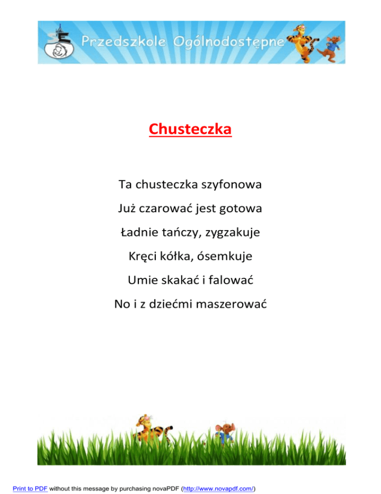 Chusteczka Ta chusteczka szyfonowa Już czarować jest gotowa Ładnie tańczy, zygzakuje Kręci kółka, ósemkuje Umie skakać i falować No i z dziećmi maszerować Print to PDF without this message by purchasing novaPDF (http://www.novapdf.com/) Wesoły tydzień W dzień słoneczny, Leśną drogą Na wycieczkę rowerową Jadą wszystkie dni tygodnia. Poniedziałek jest zaspany. Wtorek już poukładany. Środa bardzo ożywiona. Czwartek cały uśmiechnięty. Za nim piątek jest następny. I sobota zachwycona. Zaś niedziela – karuzela – Wszystkie dzieci rozwesela. Print to PDF without this message by purchasing novaPDF (http://www.novapdf.com/)
