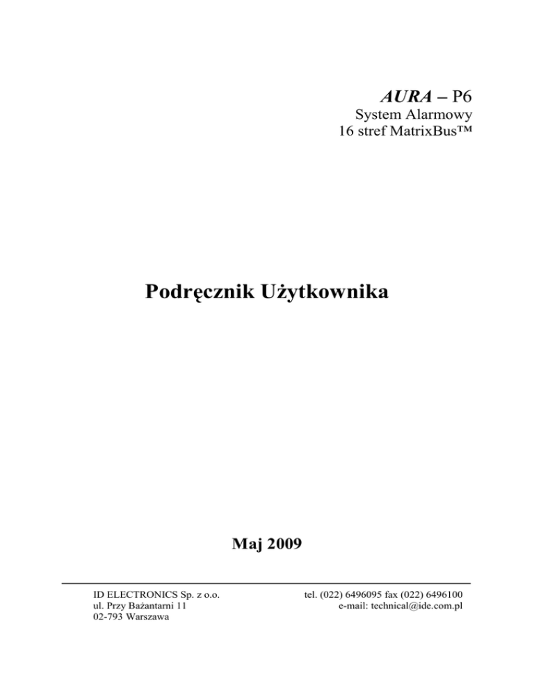 AURA – P6 System Alarmowy 16 stref MatrixBus™ Podręcznik UŜytkownika Maj 2009 ID ELECTRONICS Sp. z o.o. ul. Przy BaŜantarni 11 02-793 Warszawa tel. (022) 6496095 fax (022) 6496100 e-mail: [email protected] IDElectronics Spis treści 1. WPROWADZENIE .................................................................................................................3 1.1 1.2 1.3 Wstęp ................................................................................................................................3 Cechy systemu ..................................................................................................................3 Pojęcia i definicje.............................................................................................................4 2. OPIS SYSTEMU ......................................................................................................................6 2.1 2.2 Wprowadzenie ..................................................................................................................6 Konsola LCD z klawiaturą...............................................................................................7 3. KONSOLA Z WYŚWIETLACZEM CIEKŁOKRYSTALICZNYM LCD PODSTAWOWE CECHY I OPERACJE .............................................................................9 3.1 3.2 3.2.1 3.3 3.4 3.5 3.6 3.7 3.8 3.9 3.10 3.11 3.12 Teksty w pamięci systemu.................................................................................................9 Wyświetlanie...................................................................................................................10 Wyświetlanie informacji w trakcie pracy .......................................................................10 Wskaźniki uzbrojenia/rozbrojenia..................................................................................11 Wskazania systemu.........................................................................................................12 Wskaźniki stref................................................................................................................12 Potwierdzenia dźwiękowe ..............................................................................................13 Konwencje ......................................................................................................................13 Podgląd pamięci zdarzeń ...............................................................................................13 Wyświetlanie informacji o problemach..........................................................................16 Pomijanie stref ...............................................................................................................18 Obszary w systemie ........................................................................................................19 Moduł głosowy ...............................................................................................................19 4. PROGRAMOWANIE ADMINISTRATORA (GOSPODARZA).....................................20 4.1 4.2 4.3 4.4 4.5 4.6 4.7 Aura P6 MoŜliwości......................................................................................................................20 Kody Dostępu .................................................................................................................20 Dostęp do programu przez administratora ....................................................................21 Codzienne uŜytkowanie ..................................................................................................24 Wyjścia programowalne.................................................................................................29 Opcje melodii .................................................................................................................30 ZagroŜenia......................................................................................................................31 Podręcznik UŜytkownika 2 IDElectronics 1. Wprowadzenie 1.1 Wstęp Centrala AuraTM P6 pozwala na realizację systemów z 6 do 16 linii dla rezydencji, domów, mieszkań oraz biur i sklepów. Kompaktowa centrala alarmowa umoŜliwia obsługę dwunastu linii dozorowych z wykorzystaniem „doublingu” lub sześciu linii dozorowych podłączanych do płyty głównej, dwóch linii sterujących, linii sygnalizatora, linii magistrali rozszerzeń oraz linii telekomunikacyjnej na potrzeby monitoringu. Magistrala rozszerzeń pozwala na podłączenie konsol obsługowych z wyświetlaczem LCD oraz inteligentnych modułów zewnętrznych, które rozszerzają liczbę linii dozorowych (o linie przewodowe lub radiowe) do szesnastu oraz linii wyjściowych z przekaźnikami sterującymi. Linie dozorowe podłączone bezpośrednio do centrali pozwalają na zaprogramowanie tzw. „doublingu”, dającego w rezultacie podwojenie liczby identyfikowanych czujek jako niezaleŜnych stref. Dostępne narzędzia do programowania centrali wydatnie skracają czas konieczny do uruchomienia systemu oraz minimalizują czas i osprzęt serwisowy. 1.2 Cechy systemu dla wersji z rozszerzeniami: • wejścia dla stref na płycie centrali • wejścia dla stref z podwajaniem • liczba dostępnych stref • wyjścia sterujące PGM • obciąŜalność wyjść sterujących PGM • monitorowane wyjście sygnalizatora • modulacja sygnalizatora • wyjście pomocnicze zasilania • kody dostępu • partycje • pojemność pamięci zdarzeń /strefę Aura P6 6 12 16 2 w centrali; 2 do 4 w modułach zewnętrznych 2 x 150 mA 1 2 typy 1 x 700 mA 19 2 + Wspólna 64 Podręcznik UŜytkownika 3 IDElectronics • liczba obsługiwanych klawiatur • liczba obsługiwanych przycisków • liczba stacji monitorujących • Prywatne numery telefonów • Numery telefonów alarmowych • Rozszerzanie stref radiowych (opcja) • Syreny Radiowe 4 8 2 (na partycję) 3 (na partycję) 3 do 10 4 1.3 Pojęcia i
