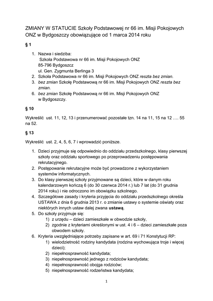 ZMIANY W STATUCIE Szkoły Podstawowej nr 66 im. Misji