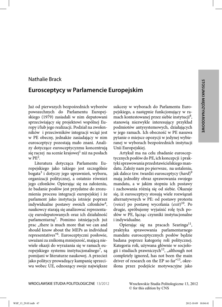 47 Eurosceptycy w Parlamencie Europejskim Już od pierwszych bezpośrednich wyborów powszechnych do Parlamentu Europejskiego (1979) zasiadali w nim deputowani sprzeciwiający się projektowi wspólnej Europy i/lub jego realizacji. Podział na zwolenników i przeciwników integracji wciąż jest w PE obecny, jednakże zasiadający w nim eurosceptycy pozostają mało znani. Analizy dotyczące eurosceptycyzmu koncentrują się raczej na scenie krajowej1 niż na posłach w PE2. Literatura dotycząca Parlamentu Europejskiego jako takiego jest szczególnie bogata3 i dotyczy jego uprawnień, wyboru, organizacji politycznej, a ostatnio również jego członków. Opierając się na założeniu, że badanie posłów jest przydatne do zrozumienia procesu integracji europejskiej i że parlament jako instytucja istnieje poprzez indywidualne postawy swoich członków4, naukowcy starają się analizować reprezentację eurodeputowanych oraz ich działalność parlamentarną5. Pomimo istniejących już prac „there is much more that we can and should know about the MEPs as individual representatives”6. Eurosceptyczni posłowie, uważani za znikomą mniejszość, mającą niewiele okazji do wyrażania się w ramach europejskiego systemu instytucjonalnego7, są pomijani w literaturze naukowej. A przecież jako politycy prowadzący kampanię sprzeciwu wobec UE, odnoszący swoje największe WROCŁAWSKIE STUDIA POLITOLOGICZNE 13/2012 WSP_13_29.05.indb 47 sukcesy w wyborach do Parlamentu Europejskiego, a następnie funkcjonujący w ramach kontestowanej przez siebie instytucji8, stanowią niezwykle interesujący przykład podmiotów antysystemowych, działających w jego ramach. Ich obecność w PE nasuwa pytanie o miejsce opozycji w jedynej wybieranej w wyborach bezpośrednich instytucji Unii Europejskiej. Artykuł ma na celu zbadanie eurosceptycznych posłów do PE, ich koncepcji i praktyki sprawowania przedstawicielskiego mandatu. Zależy nam po pierwsze, na ustaleniu, jak dalece tzw. twardzi eurosceptycy (hard)9 mają jednolity obraz sprawowania swojego mandatu, a w jakim stopniu ich postawy i zachowania różnią się od siebie. Okazuje się, iż eurosceptycy stosują wiele rozwiązań alternatywnych w PE: od postawy protestu (voice) po postawę wycofania (exit)10. Po drugie, spróbujemy wyjaśnić rolę tych posłów w PE, łącząc czynniki instytucjonalne i indywidualne. Opierając się na pracach Searinga11, praktyka sprawowania parlamentarnego mandatu eurosceptycznych posłów będzie badana poprzez kategorię roli politycznej. Kategoria roli, używana głównie w socjologii i studiach prawniczych12, ,,although not completely ignored, has not been the main driver of research on the EP so far”13, określona przez podejście motywacyjne jako STOSUNKI MIĘDZYNARODOWE Nathalie Brack Wrocławskie Studia Politologiczne 13, 2012 © for this edition by CNS 2012-10-09 10:04:41 STOSUNKI MIĘDZYNARODOWE 48 „dynamic configuration of goals, attitudes and behaviours that are characteristic of people in particular position”14, pozwala wyrazić i wyjaśnić zarówno zachowania i wyobrażenia, jakie parlamentarzyści mają na temat swojego mandatu, jak i zrozumieć sposób, w jaki działają oni w instytucjonalnych ramach. Jednak w przeciwieństwie do prac Searinga polityczne role są tutaj postrzegane jako modelowe: cechy charakterystyczne każdej roli zostały więc celowo uwydatnione. W celu odtworzenia tych ról bazujemy w artykule na oryginalnej metodologii jakościowej, opierającej się na wykorzystaniu trzech rodzajów danych. Po pierwsze, przeprowadzono wywiady na celowej próbie parlamentarzystów będących członkami Grupy Niepodległość i Demokracja (IND/ DEM)15. Pozwoliły one na poznanie podzielanych przez nich wizji Europy, Parlamentu Europejskiego, priorytetów w zakresie sprawowania mandatu oraz znaczenia, jakie przydają swoim działaniom w PE. Po drugie, na potrzeby badań prowadzone zostały sesje obserwacyjne posiedzeń frakcji, które wykorzystano do analizy zachowań posłów poza kontekstem wywiadu16. Po trzecie, przeanalizowano kluczowe działania badanych parlamentarzystów w kadencji 2004–200917. Zebrano liczbę zapytań poselskich, wypowiedzi, sprawozdań, propozycji uchwał, nowelizacji, pisemnych oświadczeń. Analizie poddano również frekwencję na sesjach plenarnych i pełnione obowiązki w PE oraz jego organach18. Ponadto została przeprowadzona jakościowa analiza treści w oparciu o pisemne zapytania, jakie kierowali do Komisji Europejskiej w trakcie całej kadencji PE oraz na podstawie ich wystąpień plenarnych w ciągu jednego roku (2006). Przedmiotem pogłębionej analizy było także zachowania posłów podczas głosowań w 2006 roku. Z jednej strony chodziło o ustalenie priorytetowych tematów pytań i wystąpień, jak również częstotliwości odniesień do grupy politycznej lub do określonego terytorium, a z drugiej — przeprowadzenie analizy poszczególnych głosowań, aby ocenić, czy stopień sprzeciwu i kontestacji zmienia się w zależności od poruszanych zagadnień i tematyki19. 1. Typologia ról politycznych deputowanych o nastawieniu eurosceptycznym Podrozdział ten ma na celu przedstawienie typologii trzech modeli ról politycznych nastawionych eurosceptycznie polityków: trybun, nieobecny i pragmatyk. Dwa pierwsze typy można uznać za outsiderów ze względu na ich wycofanie się z pracy parlamentarnej, trzeci natomiast wykazuje pewien stopień zaangażowania w prace instytucji, pokazując tym samym, że eurosceptycy przyjmują różne strategie działania w PE. a) Trybun20: strategia zabierania głosu Trybun jest posłem, który na pierwszym miejscu stawia dwa aspekty sprawowania mandatu: zabieranie głosu i rozpowszechnianie negatywnych informacji o integracji europejskiej. Motywacja dla tego typu działania jest jasna: „represent people who thought i should be their voice there”21. Głównym celem trybuna jest promowanie i obrona swoje