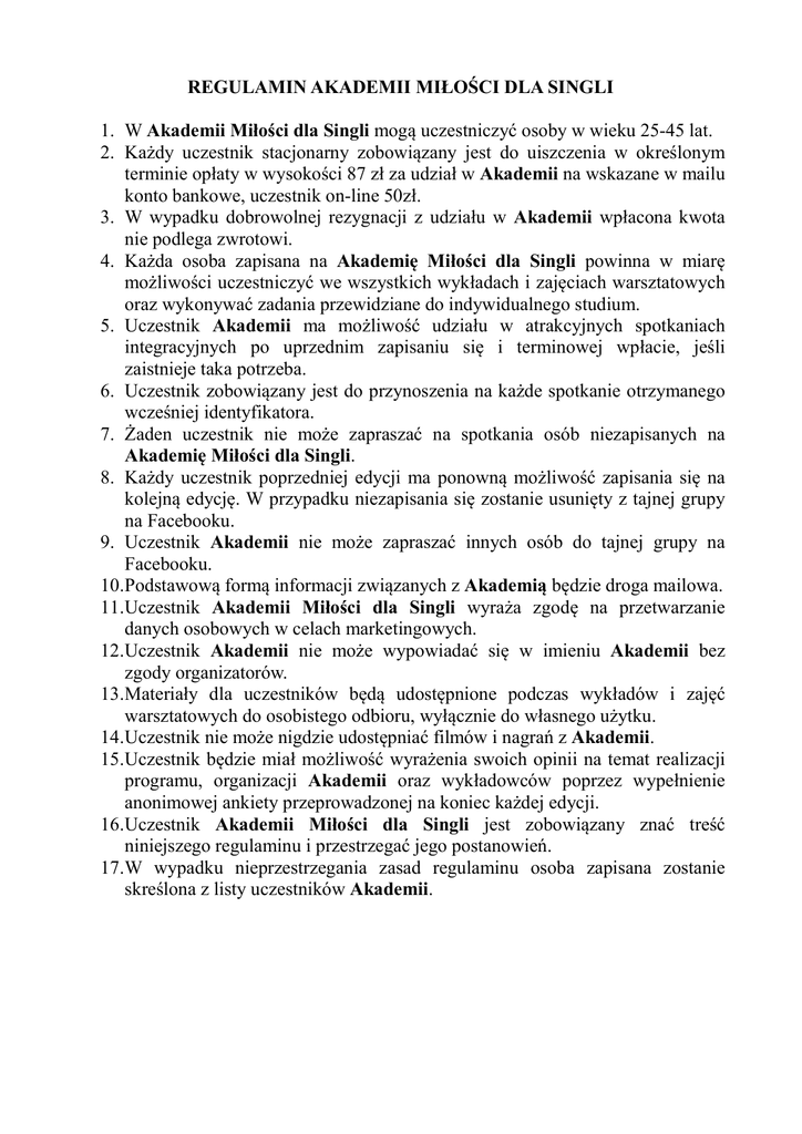REGULAMIN AKADEMII MIŁOŚCI DLA SINGLI 1. W Akademii Miłości dla Singli mogą uczestniczyć osoby w wieku 25-45 lat. 2. Każdy uczestnik stacjonarny zobowiązany jest do uiszczenia w określonym terminie opłaty w wysokości 87 zł za udział w Akademii na wskazane w mailu konto bankowe, uczestnik on-line 50zł. 3. W wypadku dobrowolnej rezygnacji z udziału w Akademii wpłacona kwota nie podlega zwrotowi. 4. Każda osoba zapisana na Akademię Miłości dla Singli powinna w miarę możliwości uczestniczyć we wszystkich wykładach i zajęciach warsztatowych oraz wykonywać zadania przewidziane do indywidualnego studium. 5. Uczestnik Akademii ma możliwość udziału w atrakcyjnych spotkaniach integracyjnych po uprzednim zapisaniu się i terminowej wpłacie, jeśli zaistnieje taka potrzeba. 6. Uczestnik zobowiązany jest do przynoszenia na każde spotkanie otrzymanego wcześniej identyfikatora. 7. Żaden uczestnik nie może zapraszać na spotkania osób niezapisanych na Akademię Miłości dla Singli. 8. Każdy uczestnik poprzedniej edycji ma ponowną możliwość zapisania się na kolejną edycję. W przypadku niezapisania się zostanie usunięty z tajnej grupy na Facebooku. 9. Uczestnik Akademii nie może zapraszać innych osób do tajnej grupy na Facebooku. 10.Podstawową formą informacji związanych z Akademią będzie droga mailowa. 11.Uczestnik Akademii Miłości dla Singli wyraża zgodę na przetwarzanie danych osobowych w celach marketingowych. 12.Uczestnik Akademii nie może wypowiadać się w imieniu Akademii bez zgody organizatorów. 13.Materiały dla uczestników będą udostępnione podczas wykładów i zajęć warsztatowych do osobistego odbioru, wyłącznie do własnego użytku. 14.Uczestnik nie może nigdzie udostępniać filmów i nagrań z Akademii. 15.Uczestnik będzie miał możliwość wyrażenia swoich opinii na temat realizacji programu, organizacji Akademii oraz wykładowców poprzez wypełnienie anonimowej ankiety przeprowadzonej na koniec każdej edycji. 16.Uczestnik Akademii Miłości dla Singli jest zobowiązany znać treść niniejszego regulaminu i przestrzegać jego postanowień. 17.W wypadku nieprzestrzegania zasad regulaminu osoba zapisana zostanie skreślona z listy uczestników Akademii.