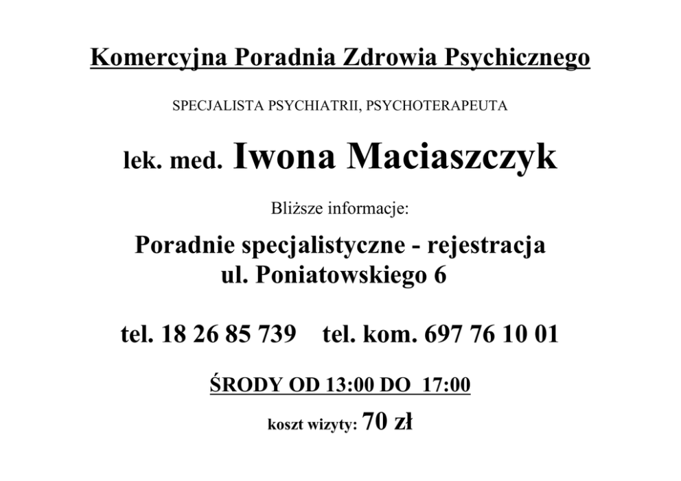 Komercyjna Poradnia Zdrowia Psychicznego SPECJALISTA PSYCHIATRII, PSYCHOTERAPEUTA lek. med. Iwona Maciaszczyk Bliższe informacje: Poradnie specjalistyczne - rejestracja ul. Poniatowskiego 6 tel. 18 26 85 739 tel. kom. 697 76 10 01 ŚRODY OD 13:00 DO 17:00 koszt wizyty: 70 zł DIAGNOSTYKA , LECZENIE FARMAKOLOGICZNE, PSYCHOEDUKACJA I PSYCHOTERAPIA • Diagnostyka i leczenie psychoz • Diagnostyka i leczenie zaburzeń nastroju o Depresja nawracająca o Depresja atypowa o Depresja sezonowa o Depresja poporodowa o Depresja w chorobach somatycznych ( choroba niedokrwienna serca, choroby tarczycy, cukrzyca, inne ) o Zaburzenia dwubiegunowe ( choroba afektywna dwubiegunowa ) Mania / hipomania o Stany mieszane Przewlekłe zaburzenia nastroju ( dystymia, cyklotymia) o Depresja w chorobach neurologicznych • Diagnostyka i leczenie zaburzeń nerwicowych o Lęk uogólniony i napadowy (tzw. nerwice lękowe) o Fobia społeczna, fobie proste, agorafobia o Zaburzenia somatyzacyjne i hipochondryczne o Zaburzenia obsesyjno-kompulsyjne (tzw. nerwica natręctw) • Diagnostyka i leczenie zaburzeń osobowości • Diagnostyka i leczenie uzależnień od substancji psychoaktywnych • Diagnostyka i leczenie zaburzeń snu • Diagnostyka i leczenie zaburzeń odżywiania się o Anoreksja ( jadłowstręt psychiczny ) o Bulimia ( żarłoczność psychiczna ) o Atypowe zaburzenia odżywiania się o Kompulsywne objadanie się • Diagnostyka i leczenie zaburzeń psychicznych u osób w podeszłym wieku (psychogeriatria)