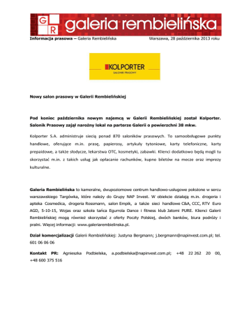 Informacja prasowa – Galeria Rembielińska Warszawa, 28 października 2013 roku Nowy salon prasowy w Galerii Rembielińskiej Pod koniec października nowym najemcą w Galerii Rembielińskiej został Kolporter. Salonik Prasowy zajął narożny lokal na parterze Galerii o powierzchni 38 mkw. Kolporter S.A. administruje siecią ponad 870 saloników prasowych. To samoobsługowe punkty handlowe, oferujące m.in. prasę, papierosy, artykuły tytoniowe, karty telefoniczne, karty prepaidowe, a także słodycze, lekarstwa OTC, kosmetyki, zabawki. Klienci dodatkowo będą mogli tu skorzystać m.in. z takich usług jak opłacanie rachunków, kupno biletów na mecze oraz imprezy kulturalne. Galeria Rembielińska to kameralne, dwupoziomowe centrum handlowo-usługowe położone w sercu warszawskiego Targówka, które należy do Grupy NAP Invest. W obiekcie działają m.in. drogeria i apteka Cosmedica, drogeria Rossmann, salon Empik, a także sieci handlowe C&A, CCC, RTV Euro AGD, 5-10-15, Wojas oraz szkoła tańca Egurrola Dance i fitness klub Jatomi PURE. Klienci Galerii Rembielińskiej mogą również skorzystać z oferty Poczty Polskiej, dwóch banków, biura podróży i pralni. Więcej informacji: www.galeriarembielinska.pl. Dział komercjalizacji Galerii Rembielińskiej: Justyna Bergmann; [email protected]; tel. 601 06 06 06 Kontakt PR: +48 600 375 516 Agnieszka Podbielska, [email protected]; +48 22 262 20 00,