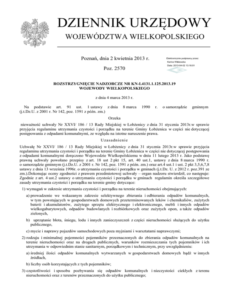 DZIENNIK URZĘDOWY WOJEWÓDZTWA WIELKOPOLSKIEGO Poznań, dnia 2 kwietnia 2013 r. Elektronicznie podpisany przez: Karina Wiśniewska Data: 2013-04-02 13:16:01 Poz. 2570 ROZSTRZYGNIĘCIE NADZORCZE NR KN-I.4131.1.125.2013.19 WOJEWODY WIELKOPOLSKIEGO z dnia 4 marca 2013 r. Na podstawie art. 91 ust. 1 ustawy z dnia (j.t.Dz.U. z 2001 r. Nr 142, poz. 1591 z późn. zm.) 8 marca 1990 r. o samorządzie gminnym Orzeka nieważność uchwały Nr XXVI/ 186 / 13 Rady Miejskiej w Łobżenicy z dnia 31 stycznia 2013r.w sprawie przyjęcia regulaminu utrzymania czystości i porządku na terenie Gminy Łobżenica w części nie dotyczącej postępowania z odpadami komunalnymi, ze względu na istotne naruszenie prawa. Uzasadnienie Uchwałę Nr XXVI/ 186 / 13 Rady Miejskiej w Łobżenicy z dnia 31 stycznia 2013r.w sprawie przyjęcia regulaminu utrzymania czystości i porządku na terenie Gminy Łobżenica w części nie dotyczącej postępowania z odpadami komunalnymi doręczono Wojewodzie Wielkopolskiemu w dniu 11 lutego 2013 r. Jako podstawę prawną uchwały powołano przepisy z art. 18 ust 2 pkt 15, art. 40 ust.1, ustawy z dnia 8 marca 1990 r. o samorządzie gminnym (j.t.Dz.U. z 2001 r. Nr 142, poz. 1591 z późn. zm.) oraz art.4 ust.1 i ust. 2 pkt 3,5,6,7,8 ustawy z dnia 13 września 1996r. o utrzymaniu czystości i porządku w gminach (j.t.Dz. U. z 2012 r. poz.391 ze zm.).Dokonując oceny zgodności z prawem przedmiotowej uchwały – organ nadzoru stwierdził, co następuje: Zgodnie z art. 4 ust.2 ustawy o utrzymaniu czystości i porządku w gminach regulamin określa szczegółowe zasady utrzymania czystości i porządku na terenie gminy dotyczące: 1) wymagań w zakresie utrzymania czystości i porządku na terenie nieruchomości obejmujących: a) prowadzenie we wskazanym zakresie selektywnego zbierania i odbierania odpadów komunalnych, w tym powstających w gospodarstwach domowych przeterminowanych leków i chemikaliów, zużytych baterii i akumulatorów, zużytego sprzętu elektrycznego i elektronicznego, mebli i innych odpadów wielkogabarytowych, odpadów budowlanych i rozbiórkowych oraz zużytych opon, a także odpadów zielonych, b) uprzątanie błota, śniegu, lodu i innych zanieczyszczeń z części nieruchomości służących do użytku publicznego, c) mycie i naprawy pojazdów samochodowych poza myjniami i warsztatami naprawczymi; 2) rodzaju i minimalnej pojemności pojemników przeznaczonych do zbierania odpadów komunalnych na terenie nieruchomości oraz na drogach publicznych, warunków rozmieszczania tych pojemników i ich utrzymania w odpowiednim stanie sanitarnym, porządkowym i technicznym, przy uwzględnieniu: a) średniej ilości odpadów komunalnych wytwarzanych w gospodarstwach domowych bądź w innych źródłach, b) liczby osób korzystających z tych pojemników; 3) częstotliwości i sposobu pozbywania się odpadów komunalnych i nieczystości ciekłych z terenu nieruchomości oraz z terenów przeznaczonych do użytku publicznego; Dziennik Urzędowy Województwa Wielkopolskiego –2– Poz. 2570 4) (uchylony); 5) innych wymagań wynikających z wojewódzkiego planu gospodarki odpadami; 6) obowiązków osób utrzymujących zwierzęta domowe, mających na celu ochronę przed zagrożeniem lub uciążliwością dla ludzi oraz przed zanieczyszczeniem terenów przeznaczonych do wspólnego użytku; 7) wymagań utrzymywania zwierząt gospodarskich na terenach wyłączonych z produkcji rolniczej, w tym także zakazu ich utrzymywania na określonych obszarach lub w poszczególnych nieruchomościach; 8) wyznaczania obszarów podlegających obowiązkowej deratyzacji i terminów jej przeprowadzania. Uregulowanie z art. 4 ust. 2 ww. ustawy pozwala na stwierdzenie, że w uchwalanym przez radę regulaminie utrzymania czystości i porządku na terenie gminy mogą znaleźć się tylko takie postanowienia, których przedmiot mieści się w zakresie wyznaczonym przez ten przepis. Wyliczenie zamieszczone w ustępie 2 wymienionego artykułu ustawy o utrzymaniu czystości i porządku w gminach ma bowiem charakter wyczerpujący, co oznacza iż w regulaminie nie można zamieszczać postanowień wykraczających poza treść art. 4 ust.2 ww.ustawy. Jednocześnie też wyliczenie przedmiotu do uregulowania regulaminem ma charakter obligatoryjny, co oznacza, iż w treści regulaminu muszą znaleźć się uregulowania odnoszące się do wszystkich ośmiu punktów zawartych w art. 4 ust.2 ww. ustawy. Zgodnie z § 1 przedmiotowej uchwały Rada zatwierdziła regulamin utrzymania czystości i porządku na terenie Gminy Łobżenica w części nie dotyczącej postępowania z odpadami komunalnymi stanowiący załącznik nr 1 do uchwały. Stosownie do § 2 przedmiotowej uchwały zasady postępowania z odpadami komunalnymi określone są przez związek Gmin Krajny w Złotowie w Regulaminie utrzymania czystości i porządku w części dotyczącej gospodarki odpadami komunalnymi, obowiązującego na terenie związku Gmin Krajny. Z analizy przedmiotowej uchwały wynika, że Rada podejmując tę uchwałę nie zawarła w niej regulacji wynikających z art. 4 ust.2 pkt 1,pkt 2, pkt 5 ustawy o utrzymaniu czystości i porządku w gminach. Tym samym Rada podejmując uchwałę z pominięciem ww. regulacji nie wyczerpała delegacji ustawowej z art. 4 ust. 2 ww. ustawy, co stanowi istotne naruszenie prawa. W opinii organu nadzoru przepisy statutu Związku Gmin Krajny z siedzibą w Złotowie w obowiązującym brzmieniu opublikowanym w Dzienniku Urzędowym Województwa Pilskiego Nr 10 z dnia 22 lipca 1991 r. pod pozycją 62, ze zmianami, z których ostatnia opublikowana została w Dzienniku Urzędowym Województwa Wielkopolskiego Nr 26 z dnia 4 marca 2004 r. pod pozycją 739 nie stanowią wystarczającej podstawy do podjęcia przez zgromadzenie Związku uchwały w zakresie wskazanym w § 2 przedmiotowej uchwały Rady Miejskiej. W szczególności przepis z §7 ust. 1 pkt 1 statutu związku, który stwierdza, że do zadań Zwi